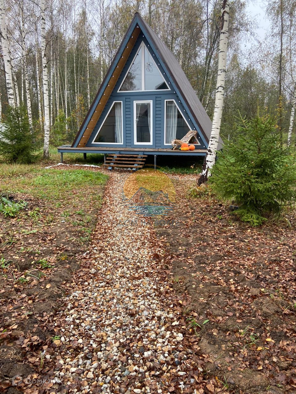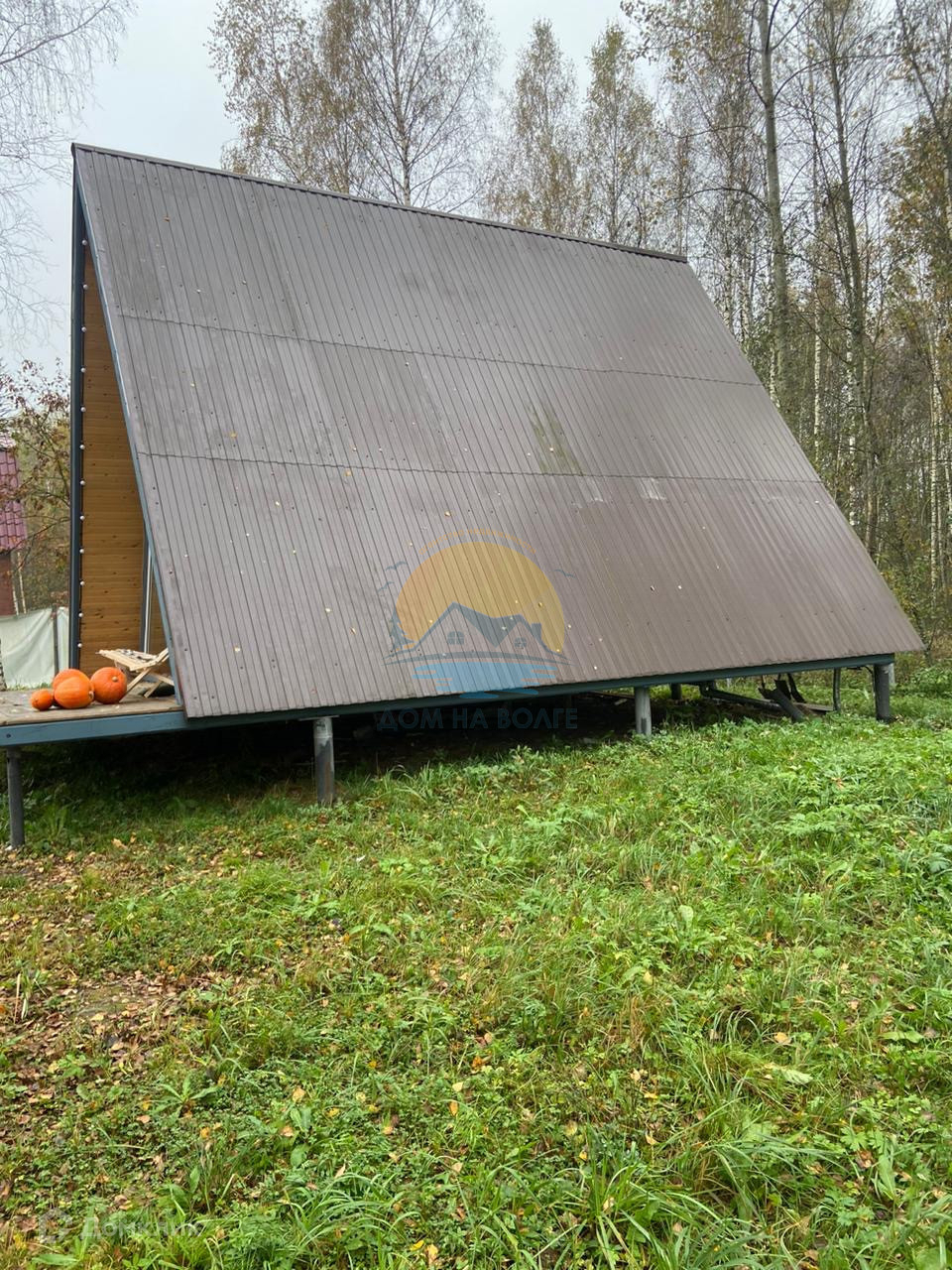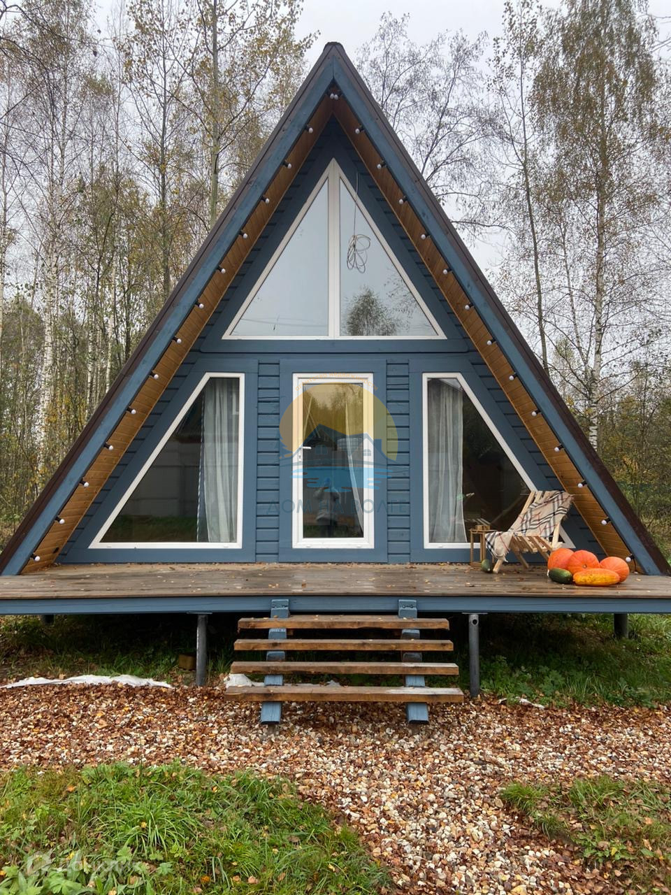 На участке 7 соток ровной формы расположен 2-х этажный дом 45 кв.м. в стиле Афрейм ( А -framе).
