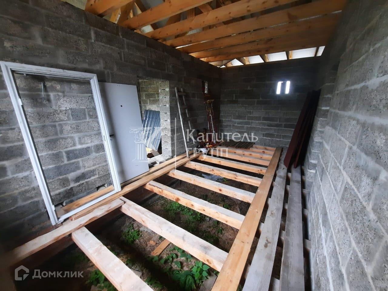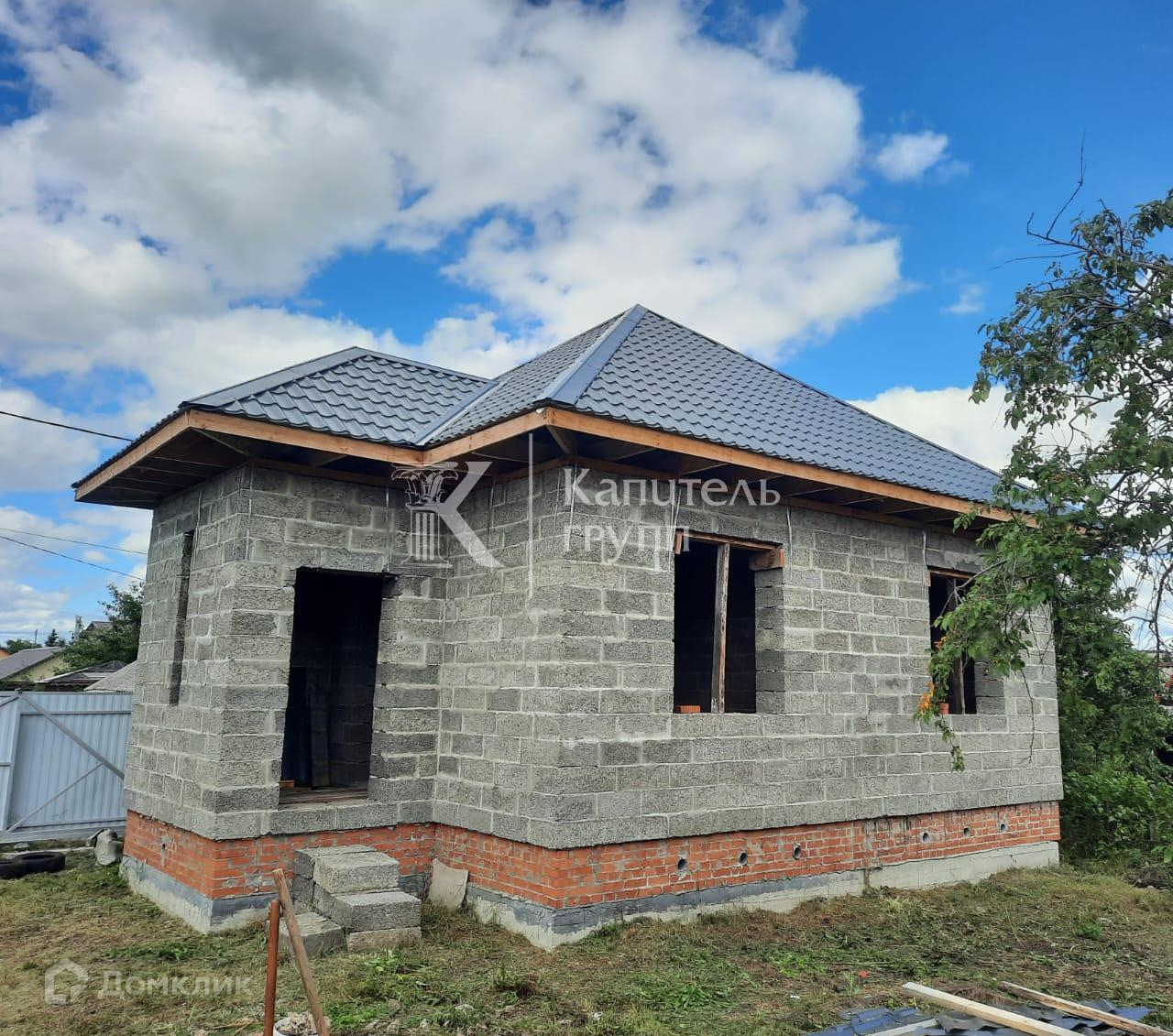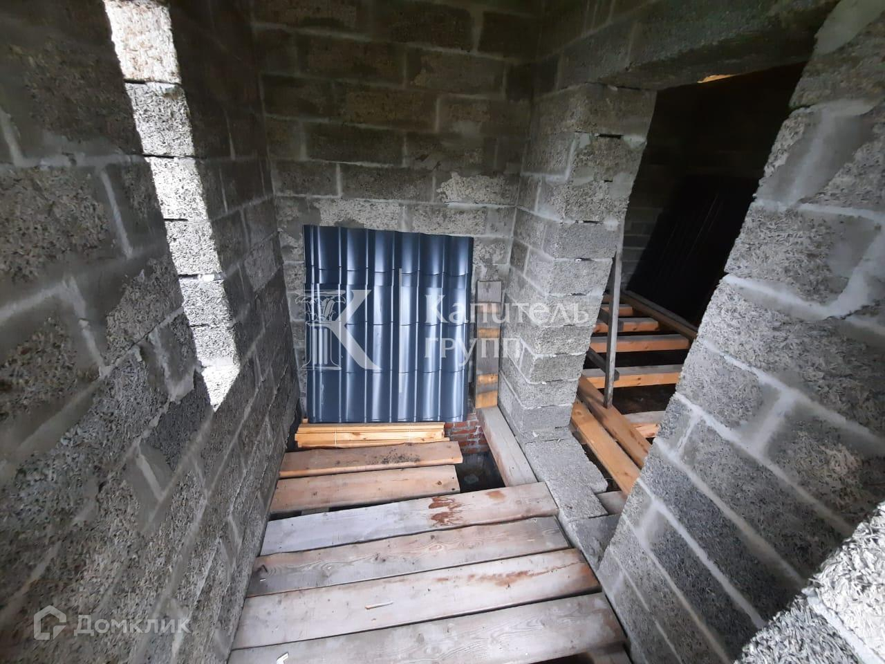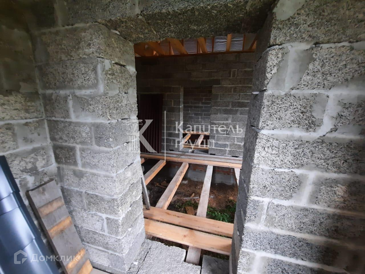 Материал стен- арболит, толщина 400 мм + сделаны терморазрывы в кладке, дом будет очень тёплый, можно не утеплять. Перекрытия потолка из бруса 200 на 100 мм., пола 150 на 150 мм с шагом 58 см. Лента фундамента толщиной 600мм. заливалась для двухэтажного дома. Крыша из качественной металлочерепицы, цвет серый графит, крыша усилена. Всё строилось с запасом прочность. Остаётся материал.