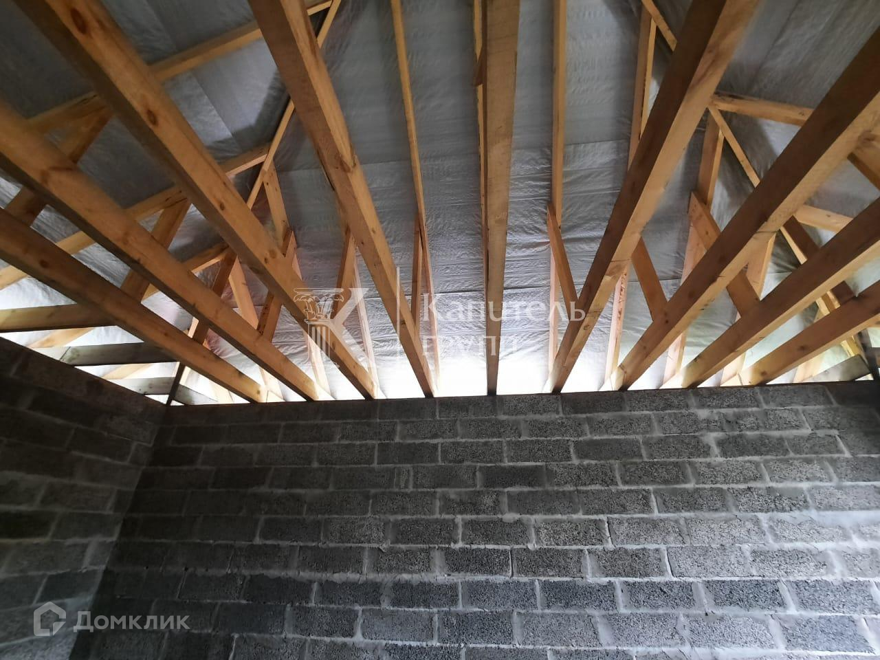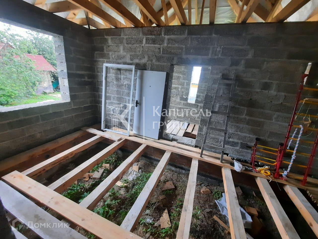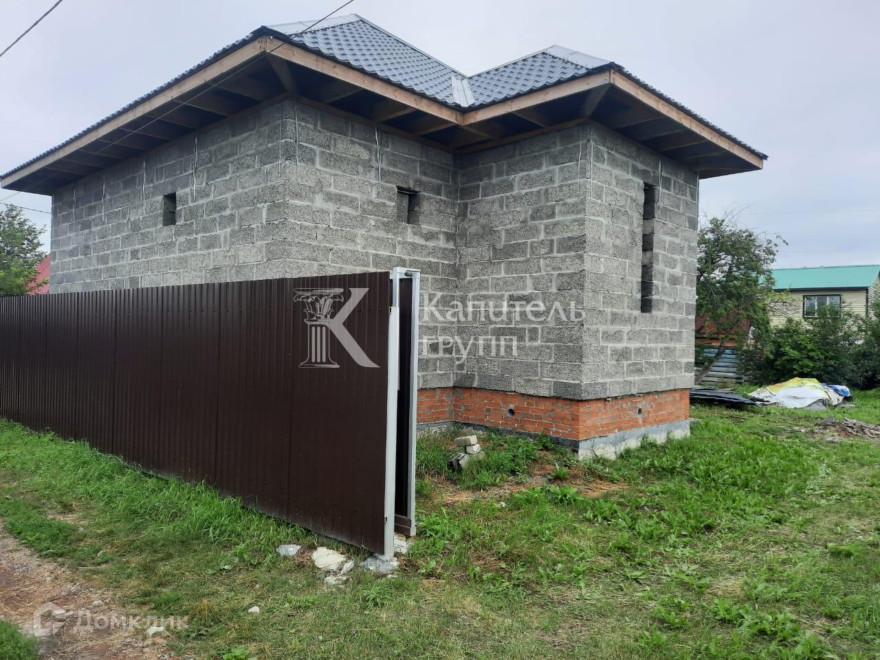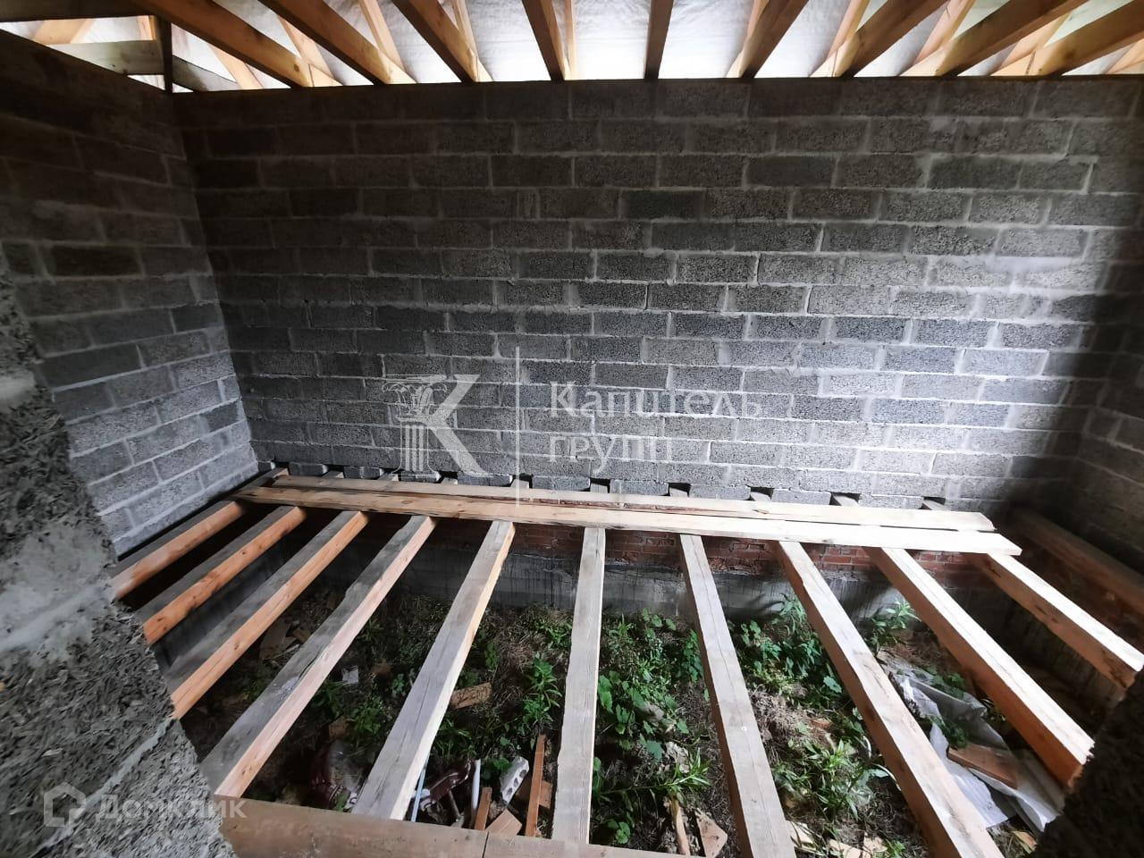 Материал стен- арболит, толщина 400 мм + сделаны терморазрывы в кладке, дом будет очень тёплый, можно не утеплять. Перекрытия потолка из бруса 200 на 100 мм., пола 150 на 150 мм с шагом 58 см. Лента фундамента толщиной 600мм. заливалась для двухэтажного дома. Крыша из качественной металлочерепицы, цвет серый графит, крыша усилена. Всё строилось с запасом прочность. Остаётся материал.