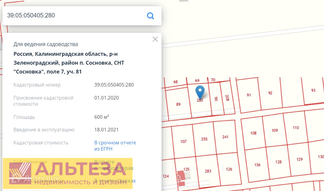 кад. номер 39:05:050405:280, Сосновка снт, продается участок, 6 соток, Номер лота: 4027256