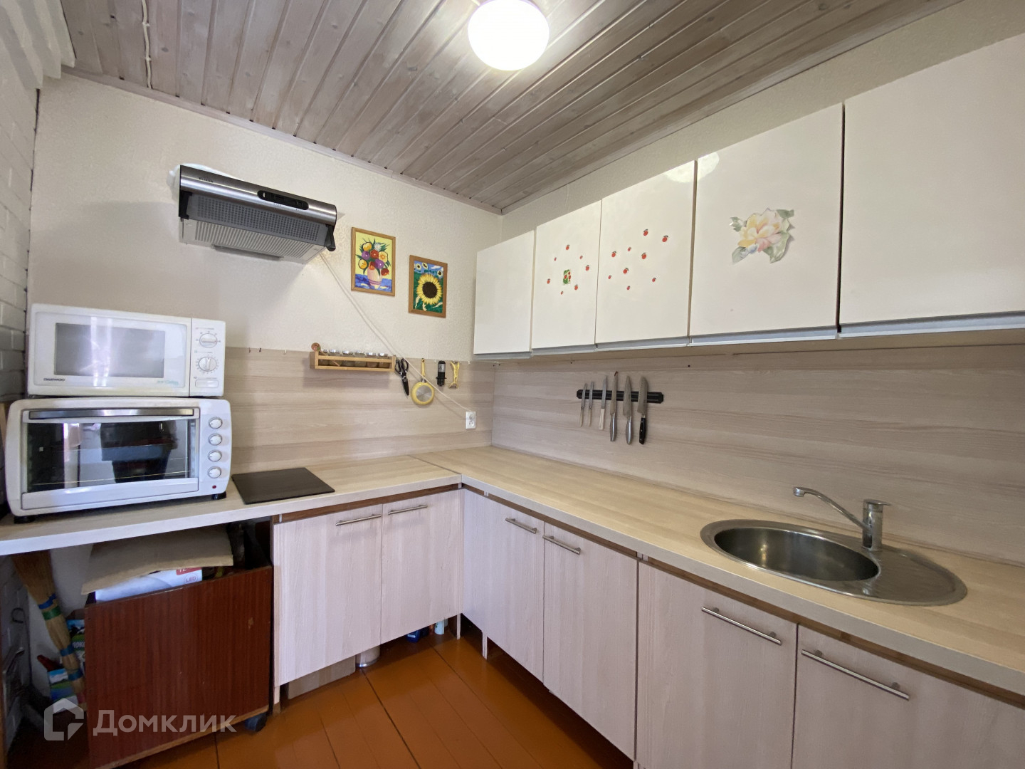 На 1 этаже расположена большая светлая кухня-гостиная с печкой (очень удобно использовать в зимнее время и также готовить на ней). Из нее сделан выход в совмещенный санузел (10 м).(установлена ванна) и выход во двор на территорию участка и к бане.