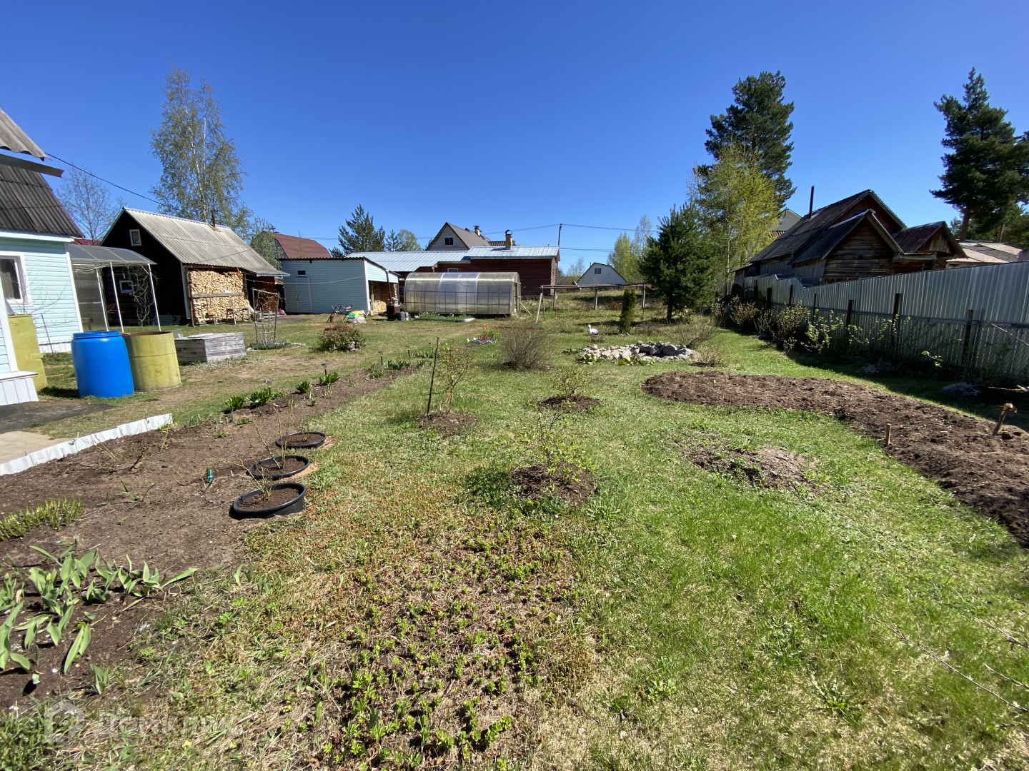 На участке: разработанный и ухоженный участок с плодовыми деревьями (яблони), черноплодная рябина, слива, алыча, смородина красная и черная, жимолость и крыжовник. Сохранены сосны и деревья.