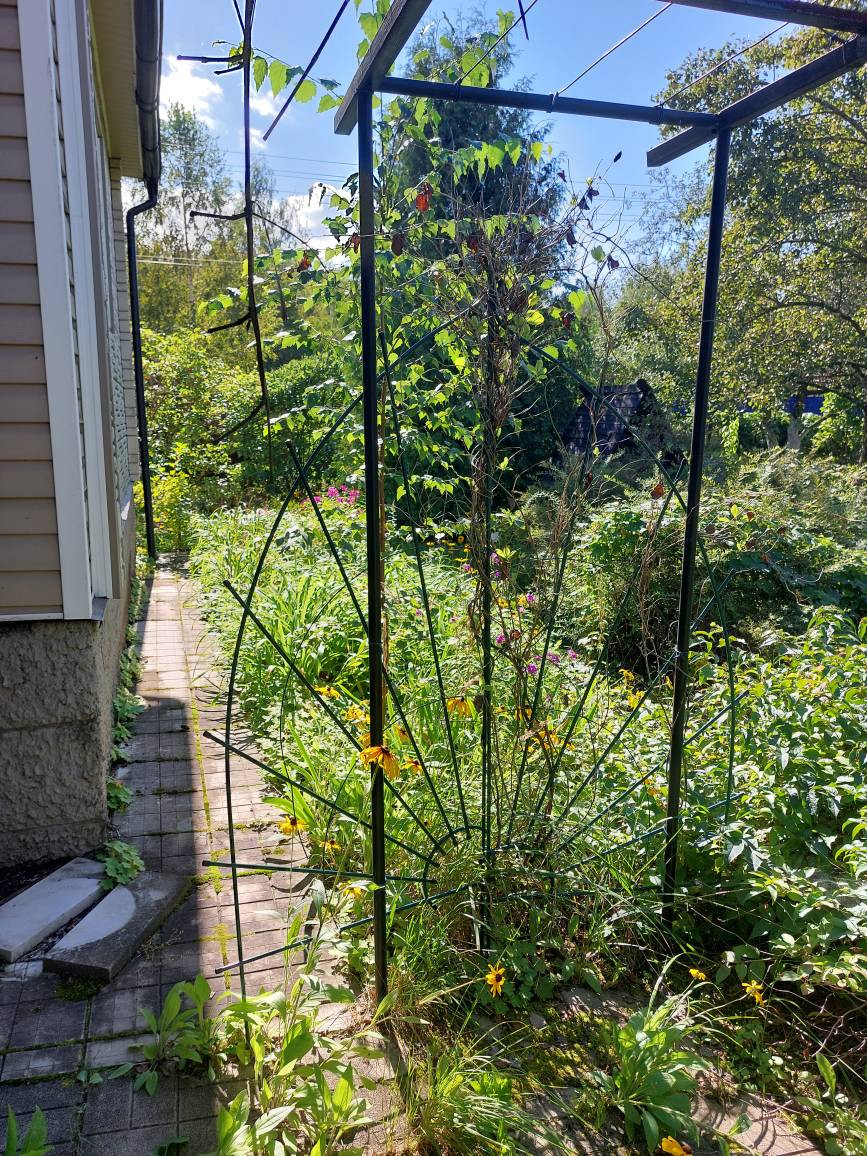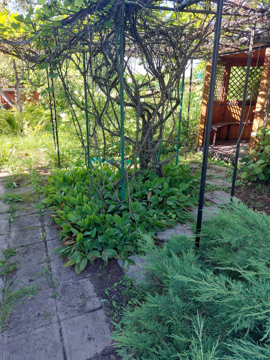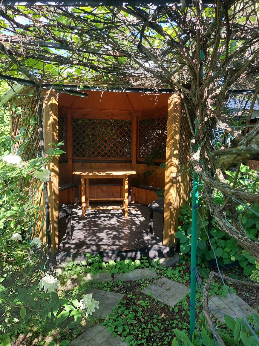 Летняя деревянная крытая беседка: покрыта тремя слоями Пинотекса, с зарешечёнными стенками с опоясывающими лавками, в комплекте сделанный под неё стол. Беседку и шпалеры овивает виноград.