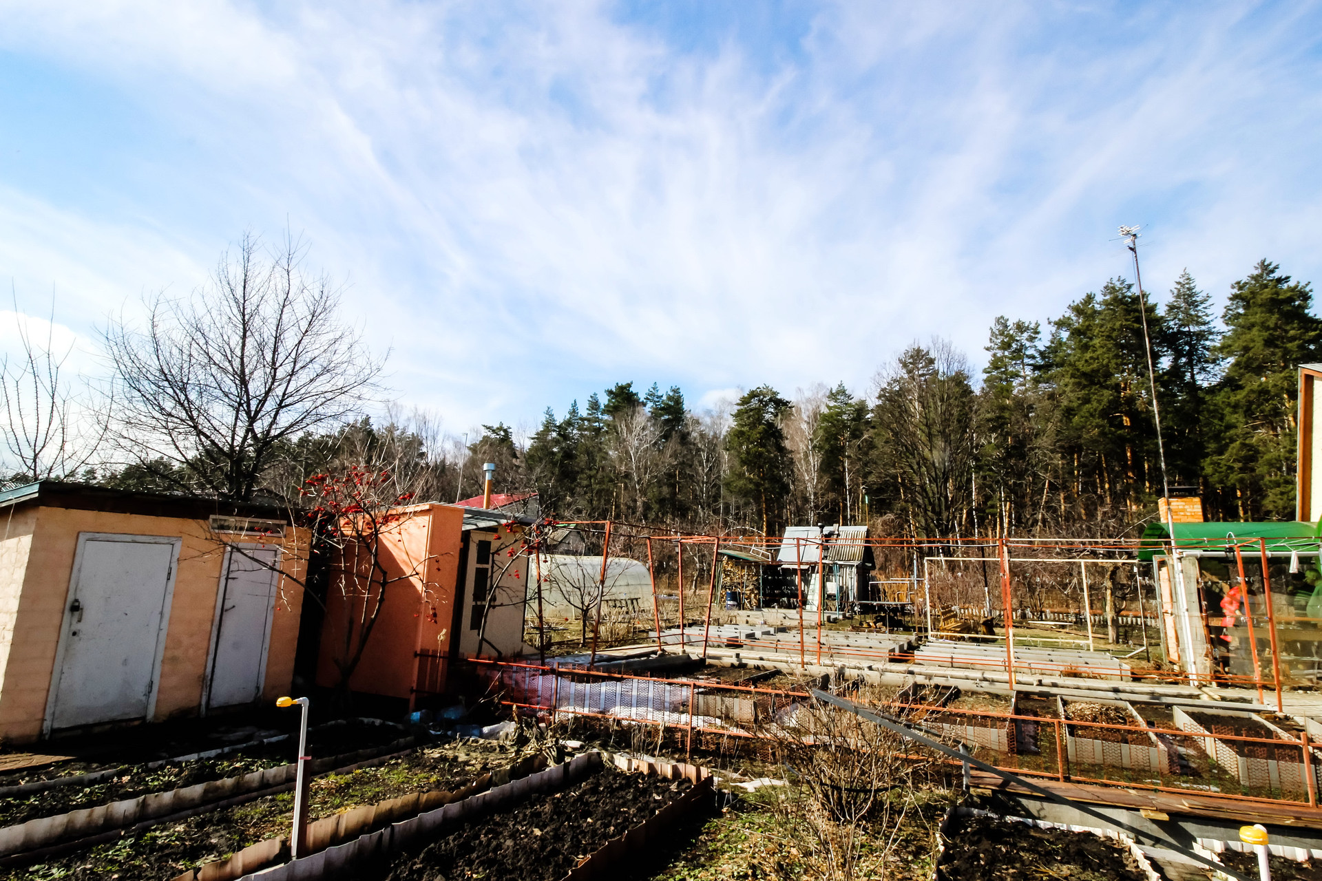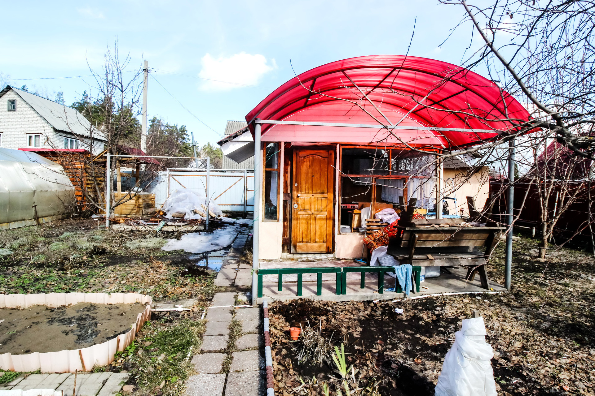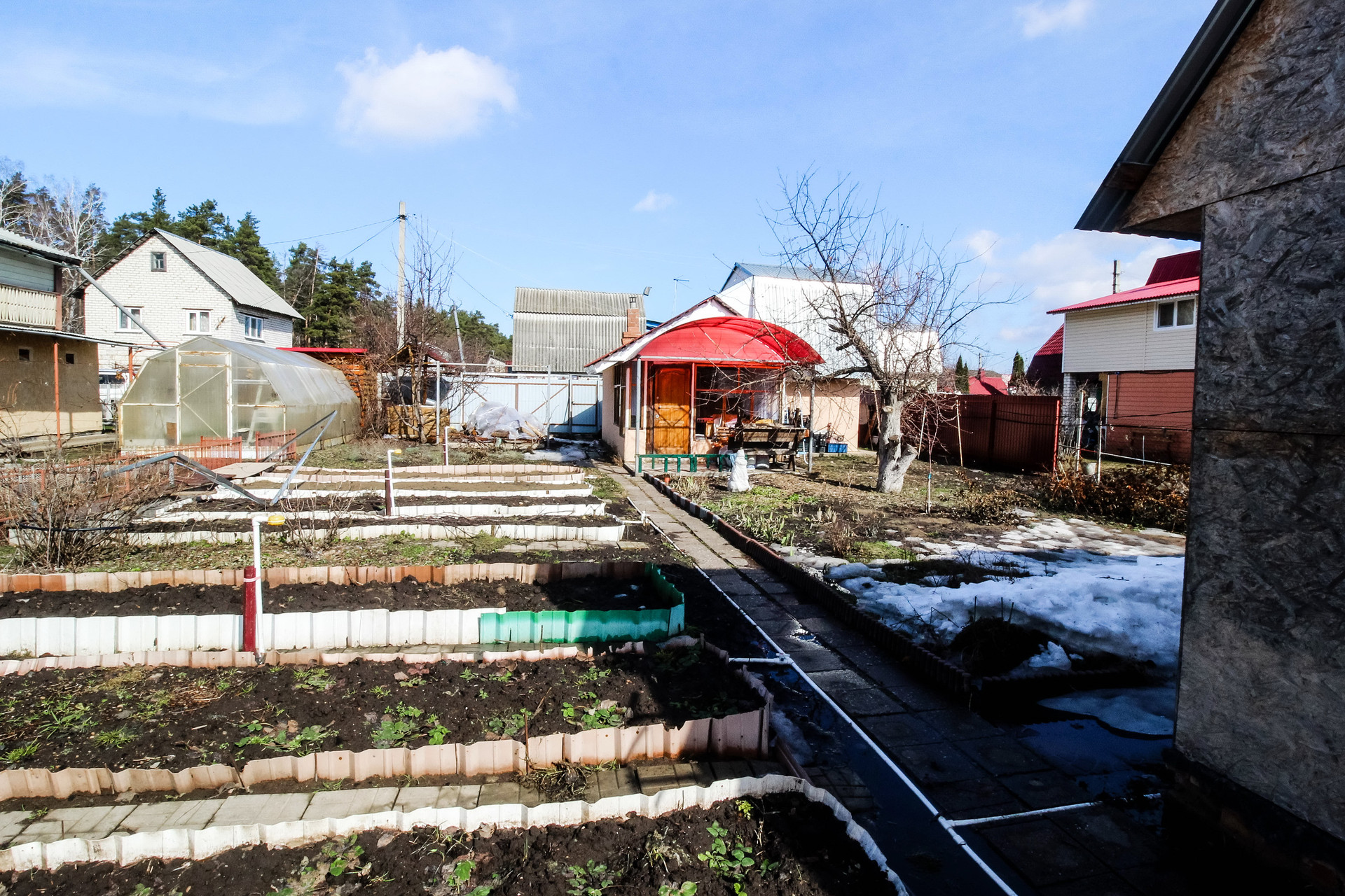 Одна сотка засеяно газоном, остальное ухоженный огород с плодоносящими кустарниками и деревьями.