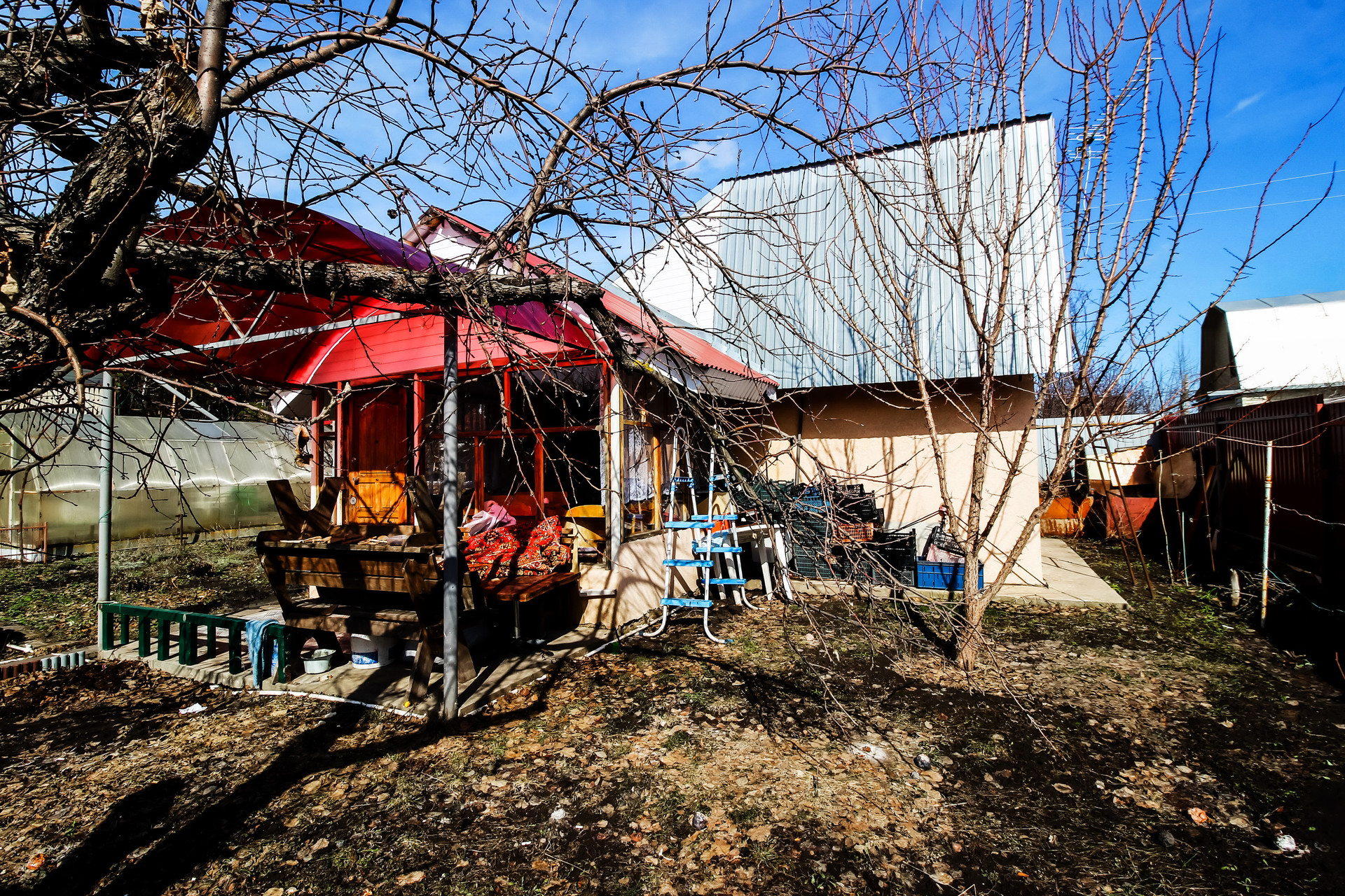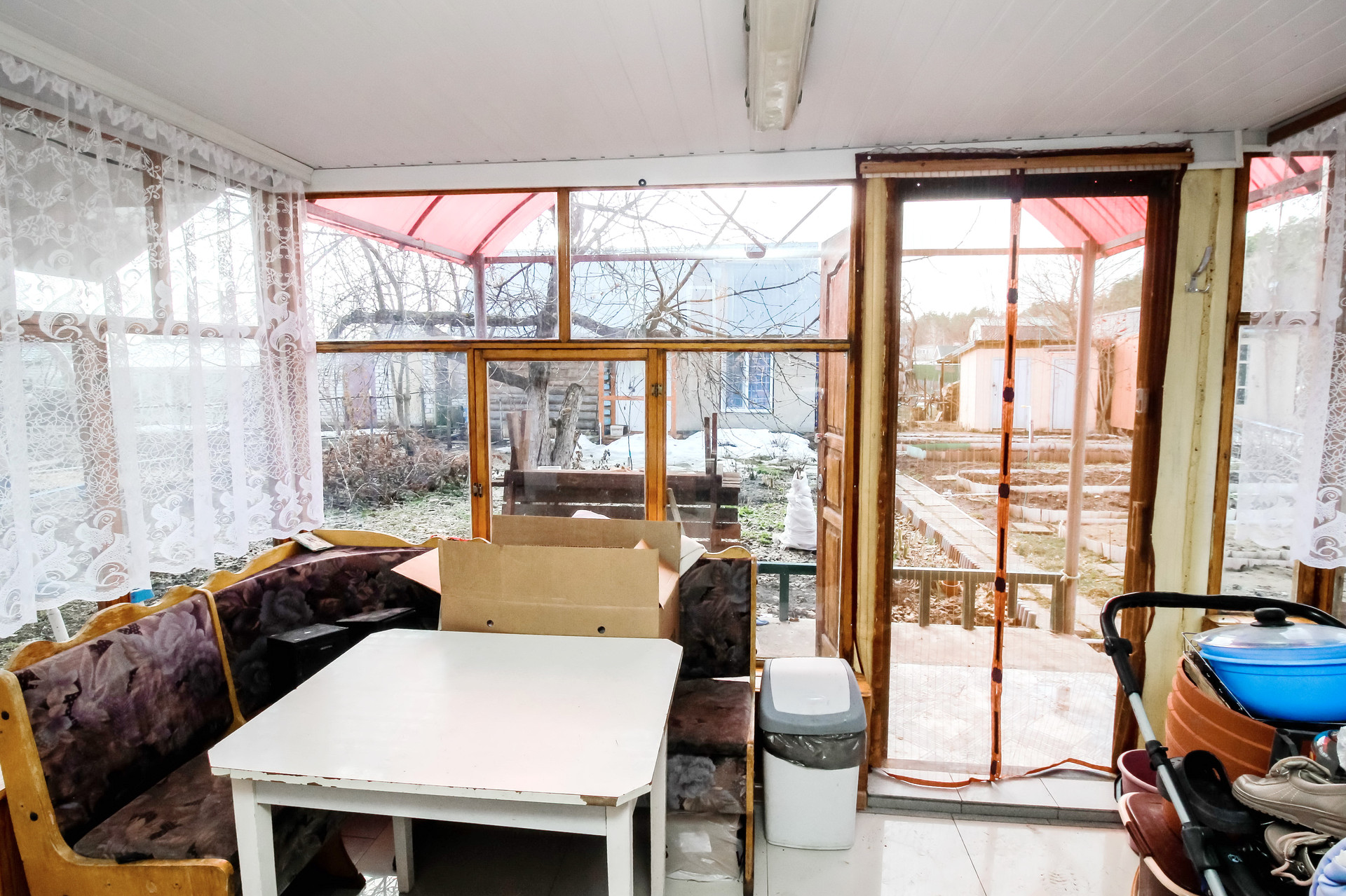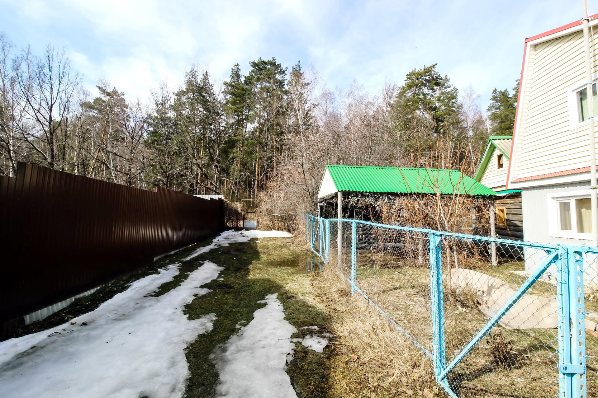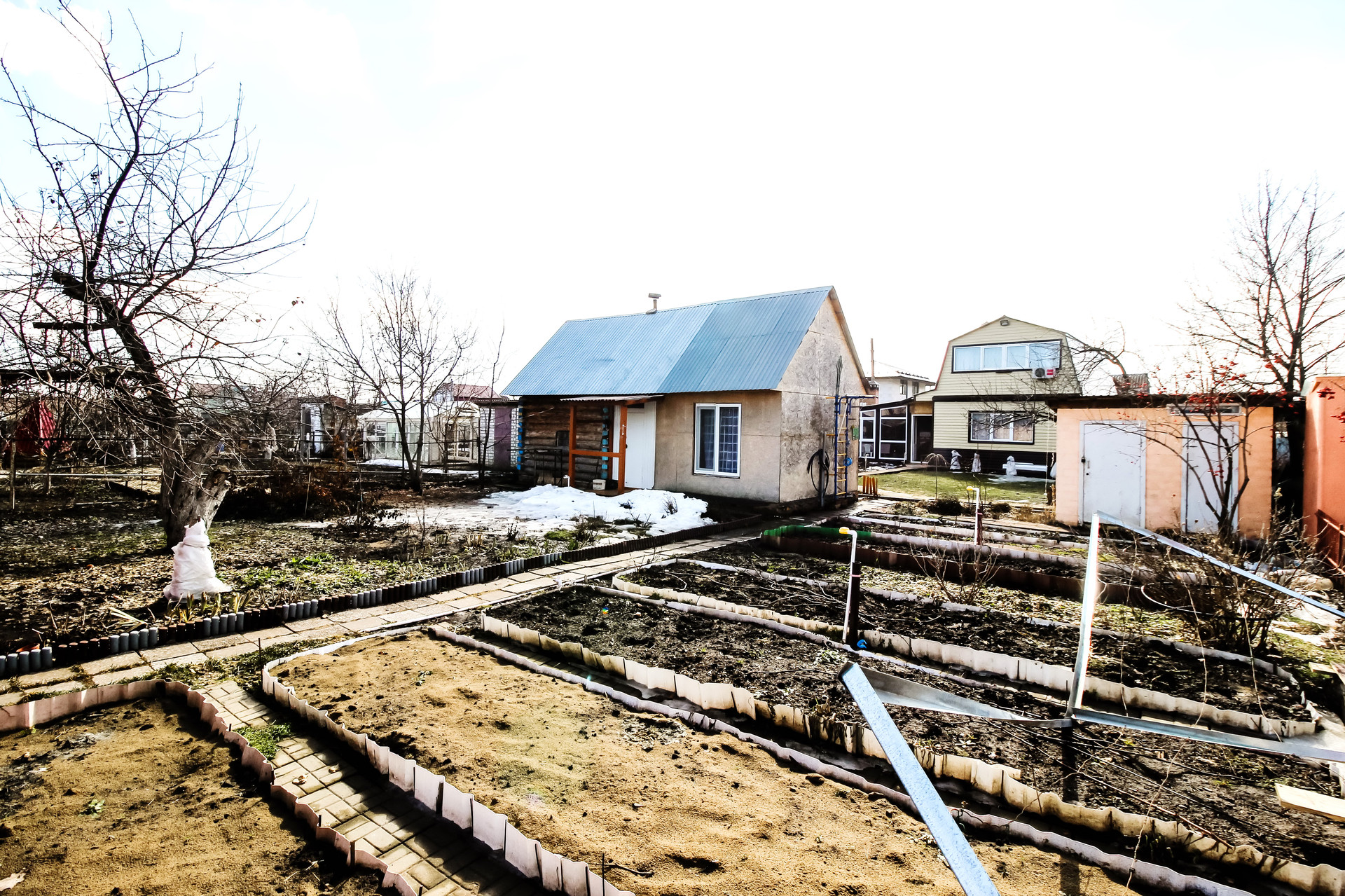 Одна сотка засеяно газоном, остальное ухоженный огород с плодоносящими кустарниками и деревьями.