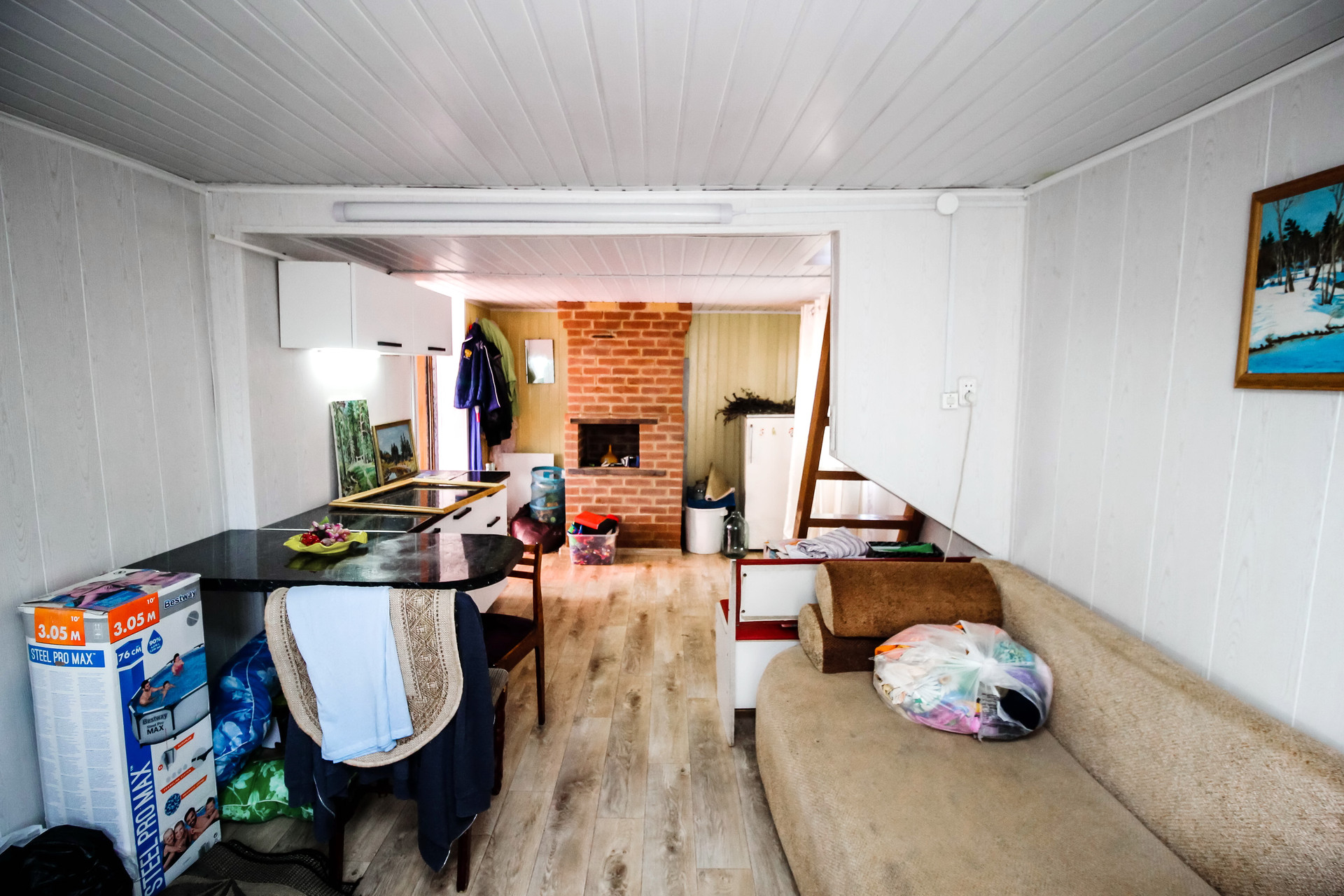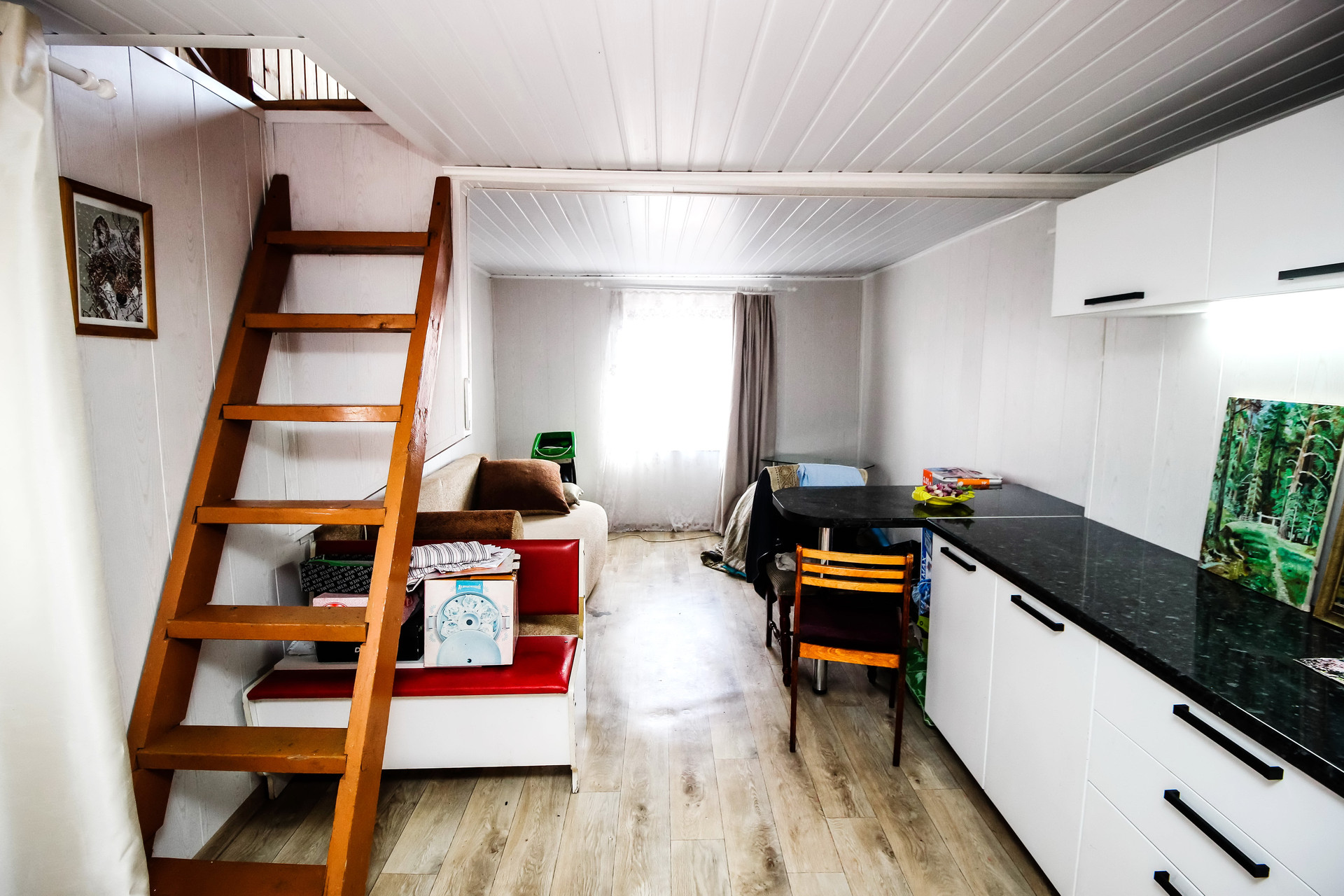 Дом представляет собой на первом этаже: кухня-гостиная, столовая; На втором этаже - одна спальня
