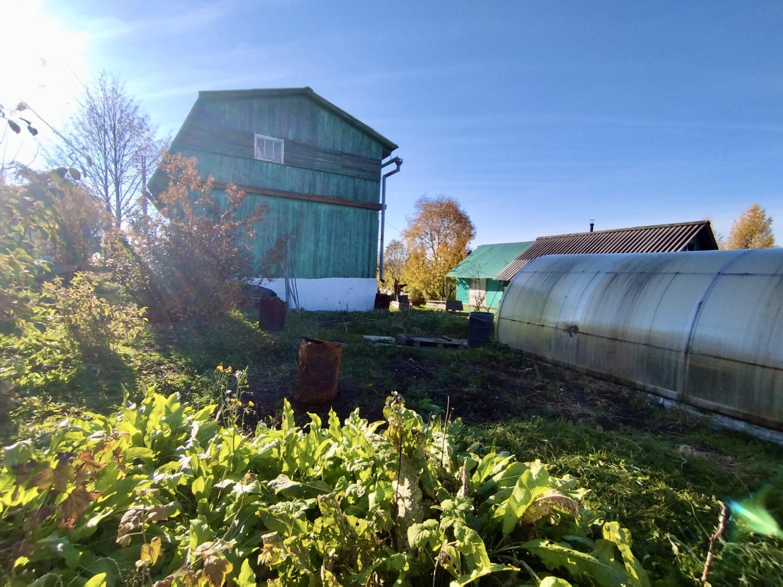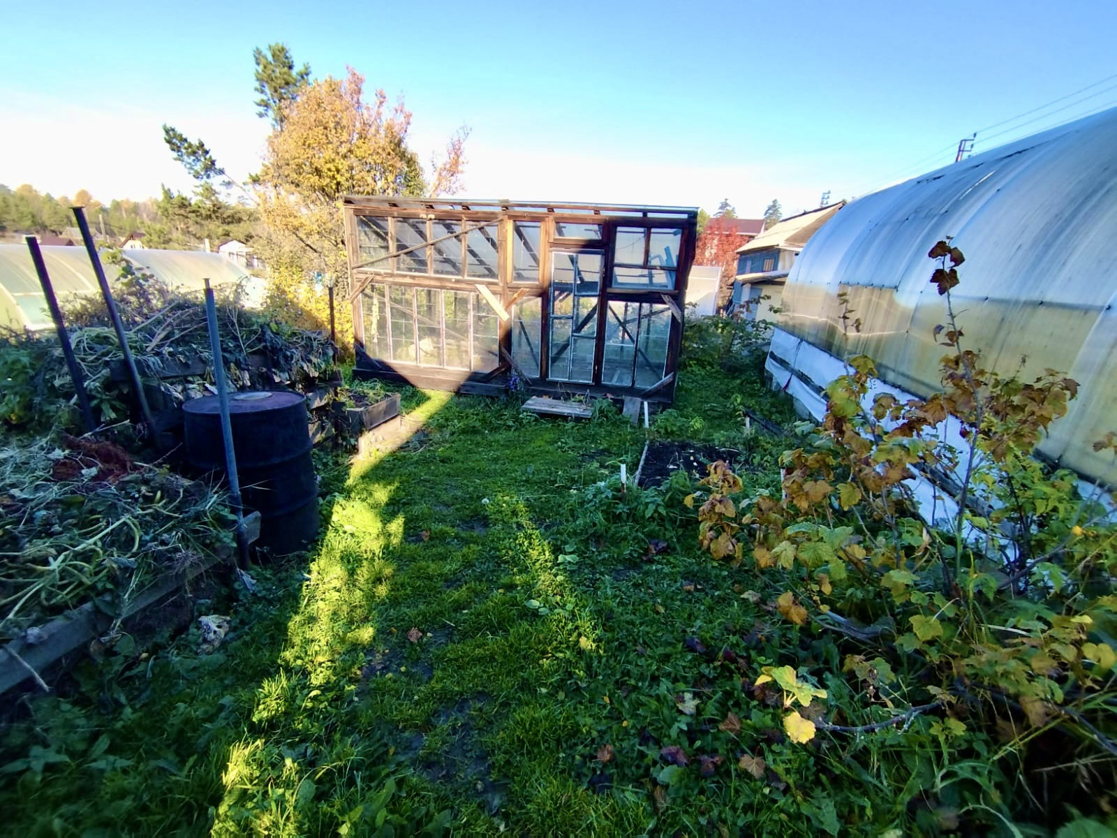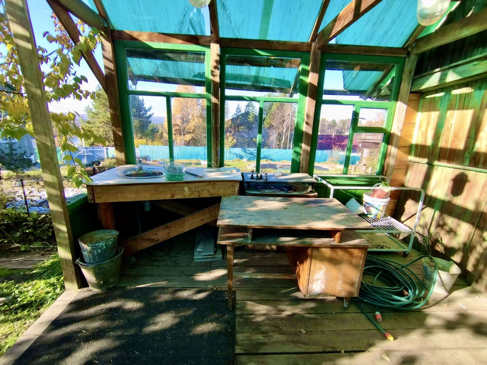 - на участке имеется теплица из поликарбоната и вторая из деревянных рам, сарай( дровяник), туалет и Летняя веранда;