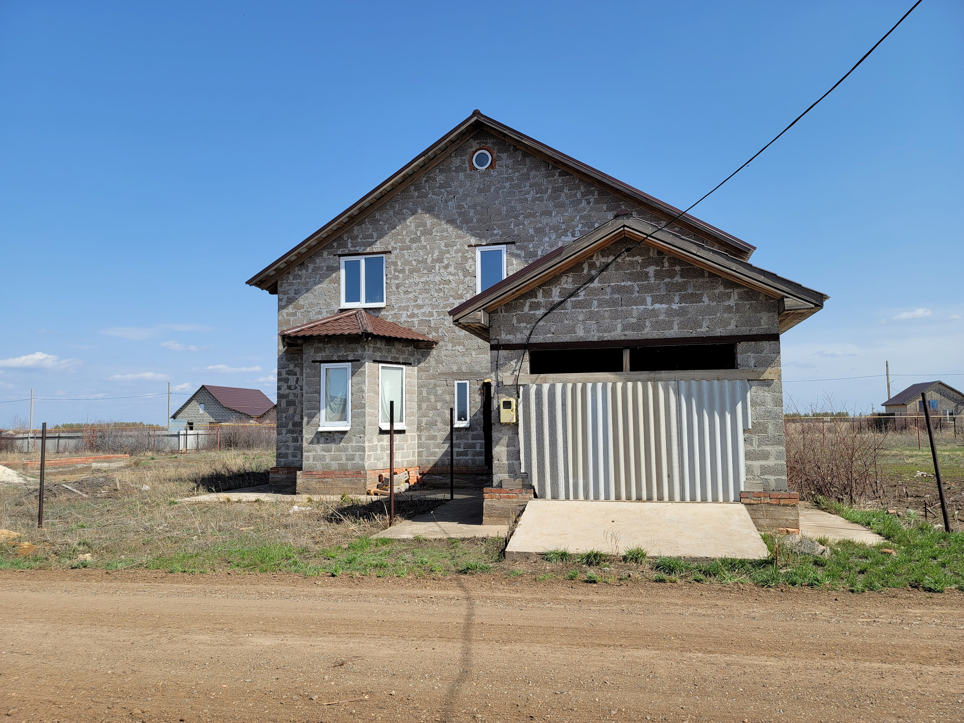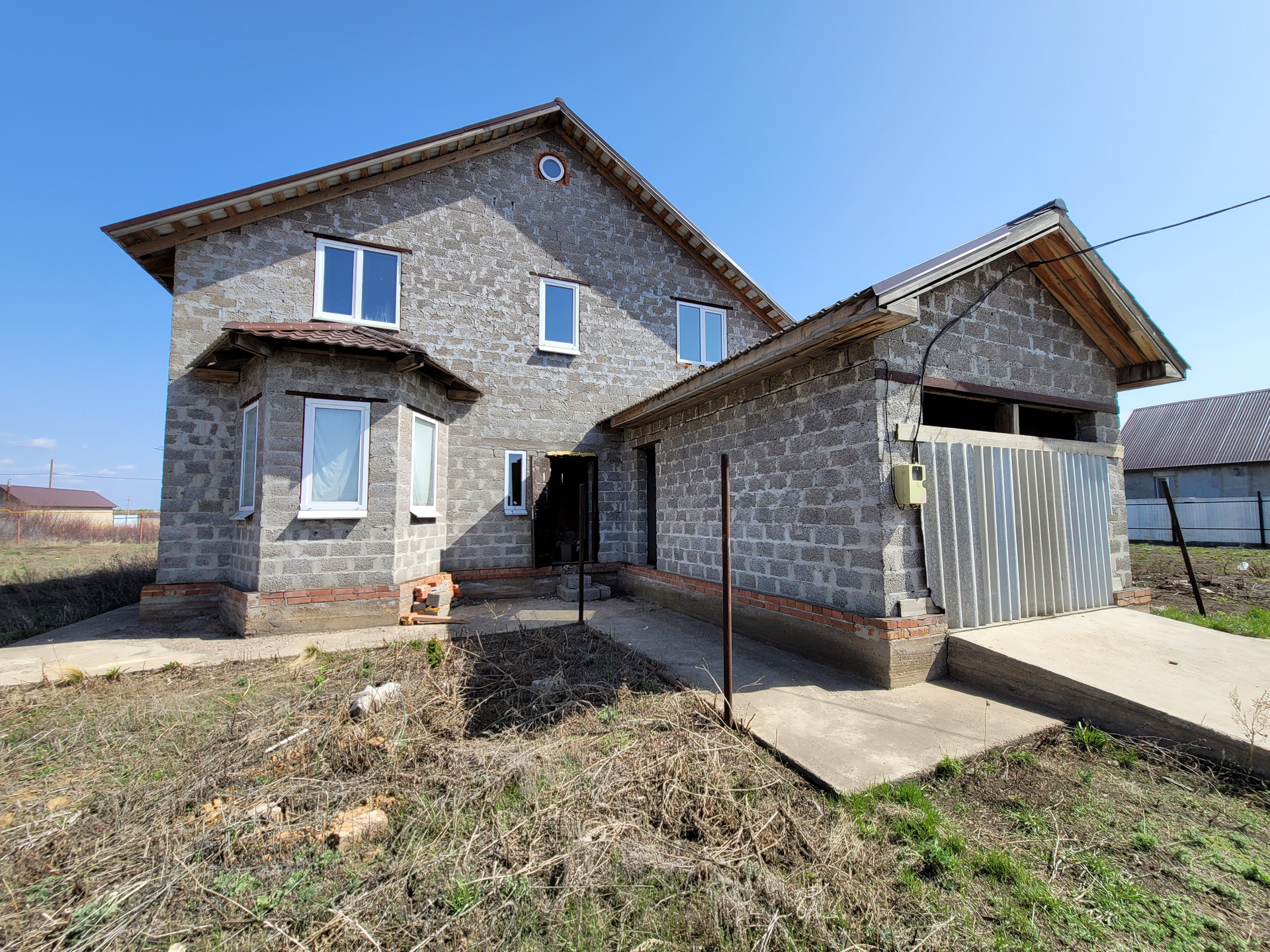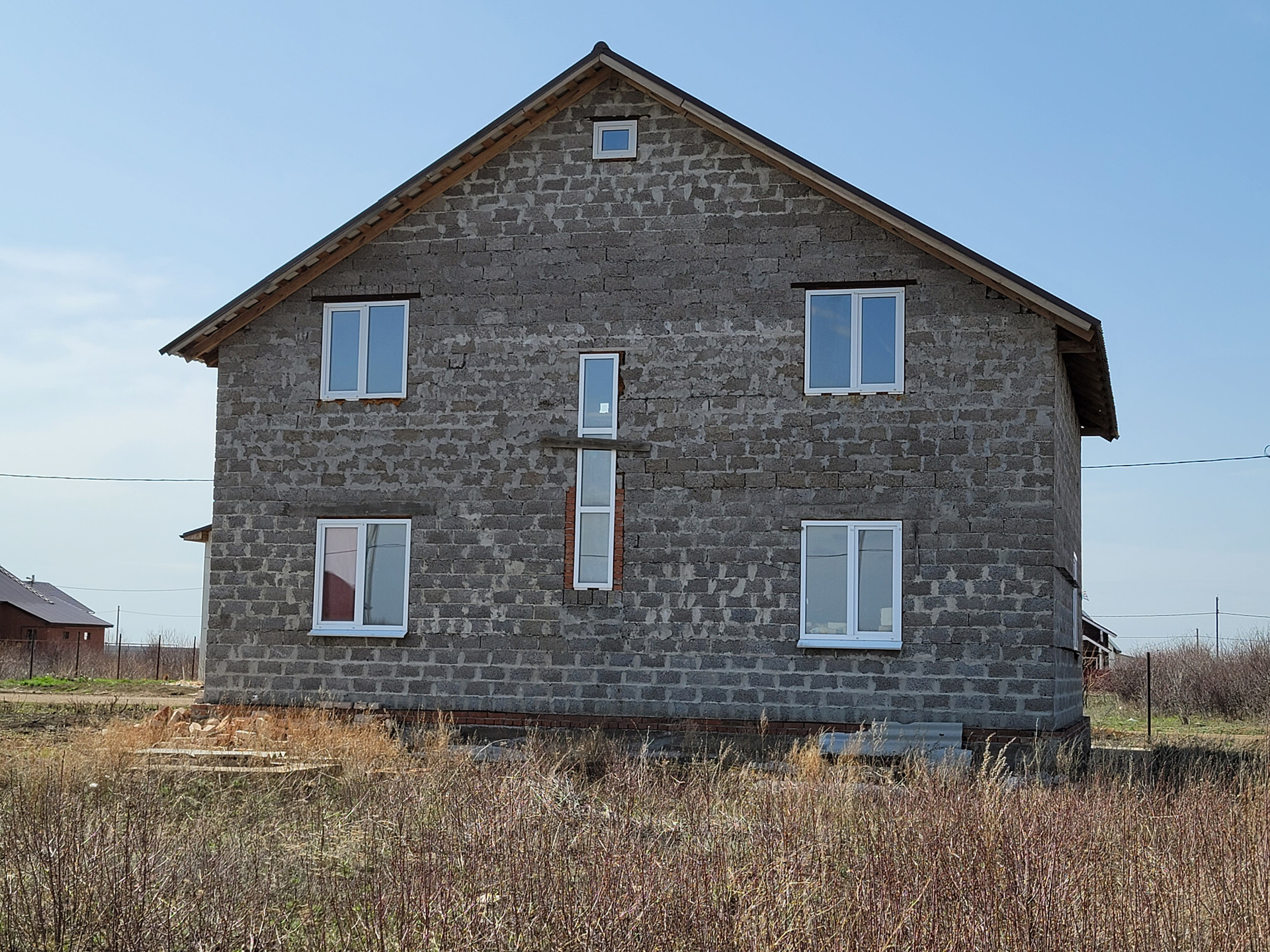 первый этаж предчистовая отделка: стены выровнены и готовы под финишную отделку, установлены стеклопакеты, сделана электрическая разводка;