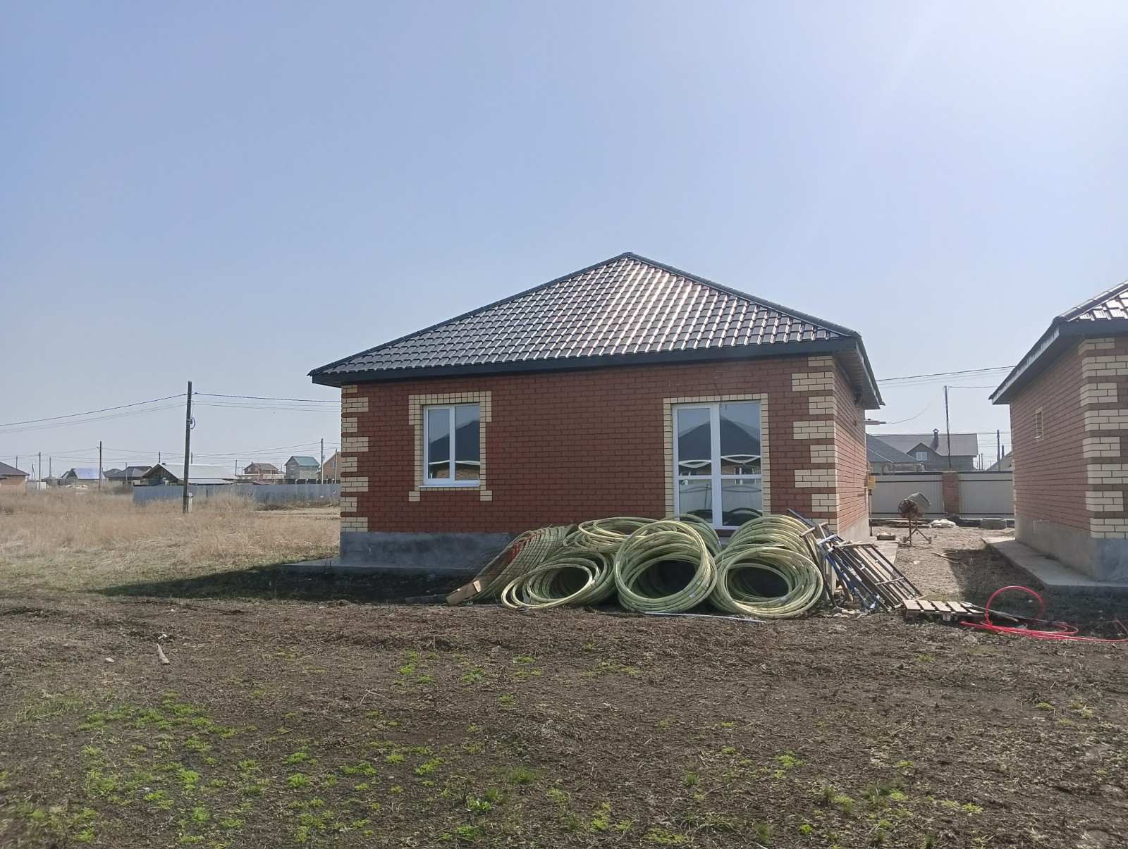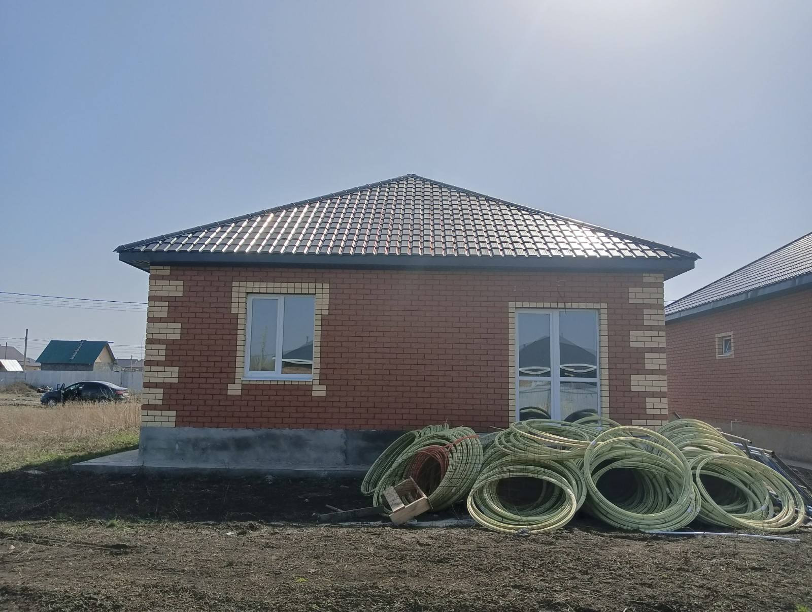 Дом находится на улице Малиновая.   Планировка супер! Три раздельных спальни, приличной площади. Отдельно кухня 12м2 с выходом во двор и напротив гостиная 17,5м2. Свой участок 7,5 соток правильной формы. Соседи тоже новые жилые коттеджи. Дом в богатой комплектации: 2-контурный газовый котел, теплый водяной пол из трубы (сшитый полиэтилен), своя скважина с погружным насосом и автоматикой. Под окнами поставим радиаторы.