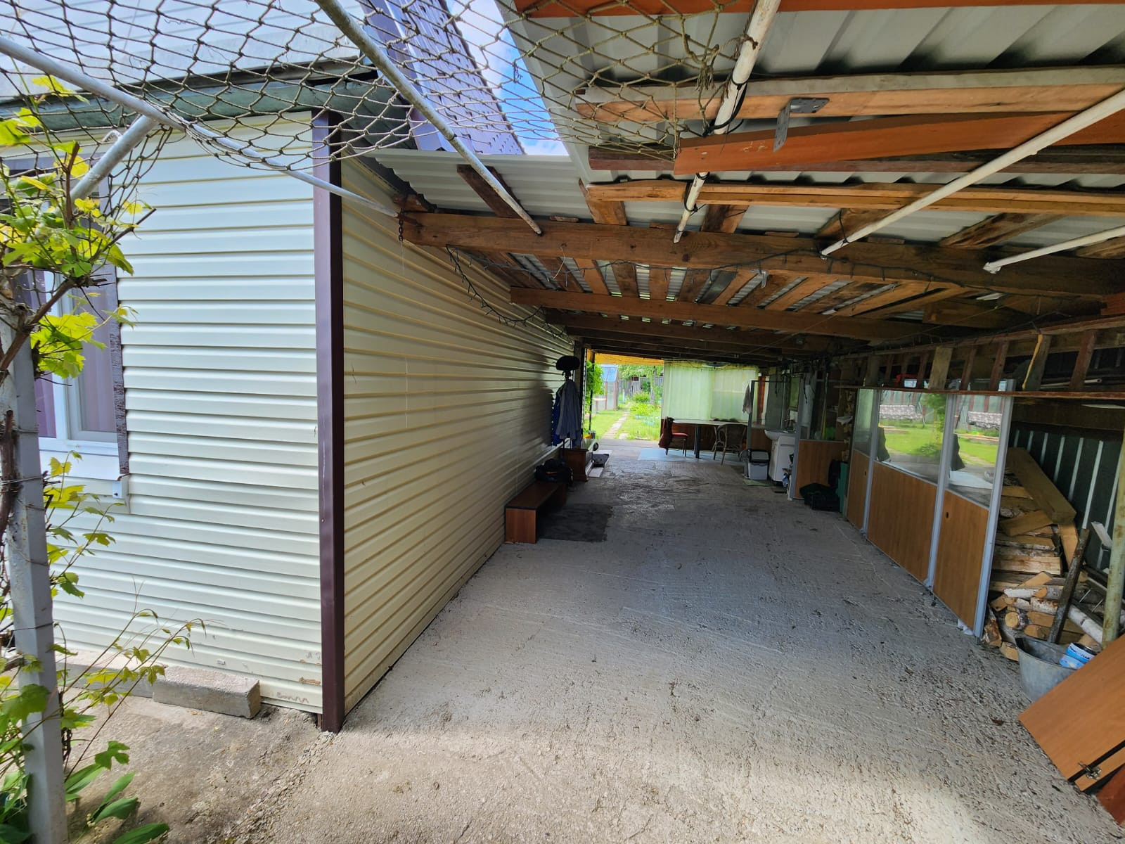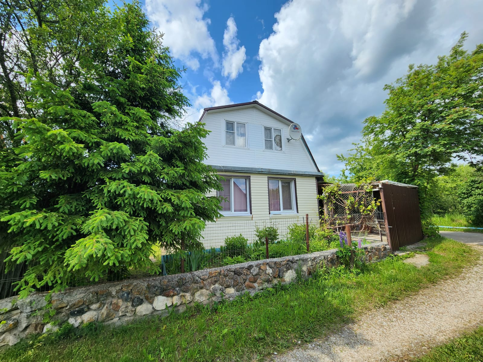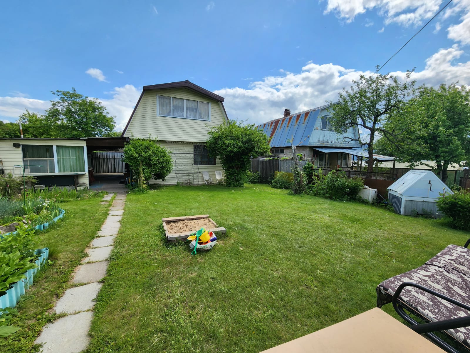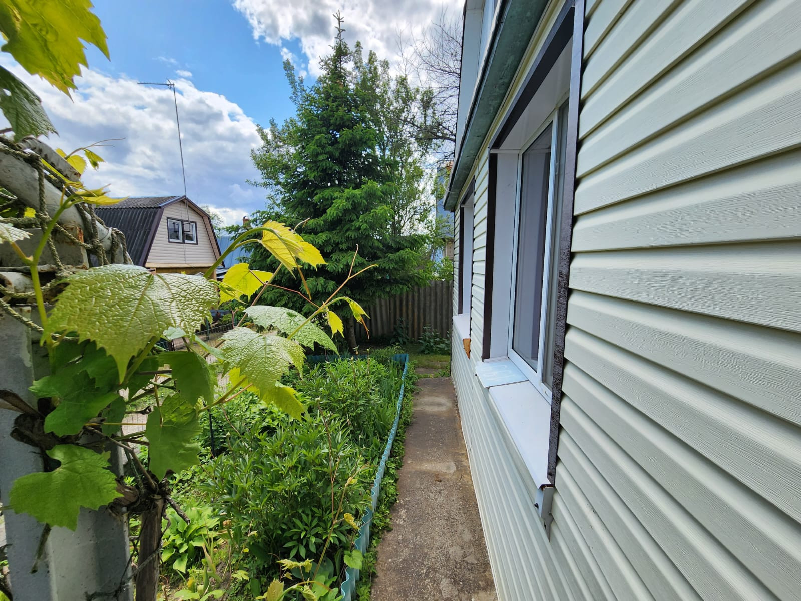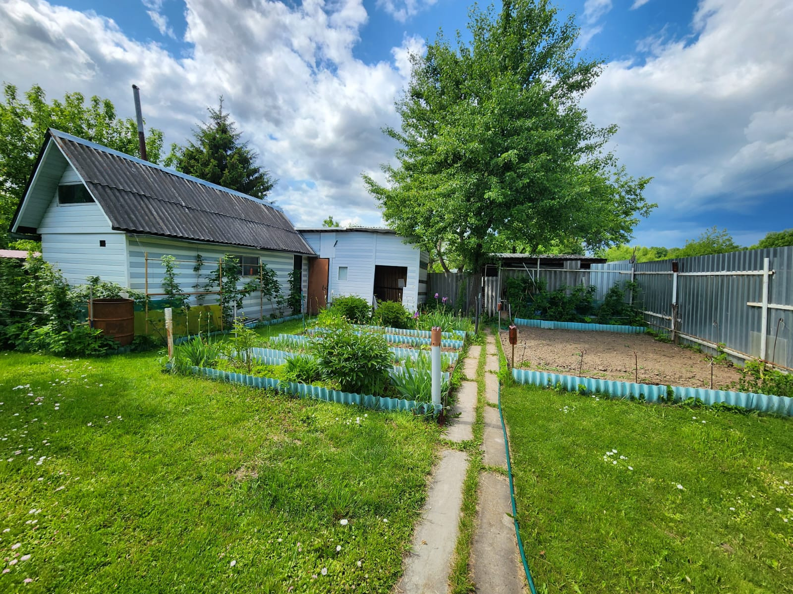 Ухоженный участок 5 соток и еще 2 сотки (подведена поливочная вода), находящиеся в 2 минутах ходьбы от основного участка. Вода для полива разведена по участку. Дом с участком обнесены забором, есть крытая стоянка для машины.