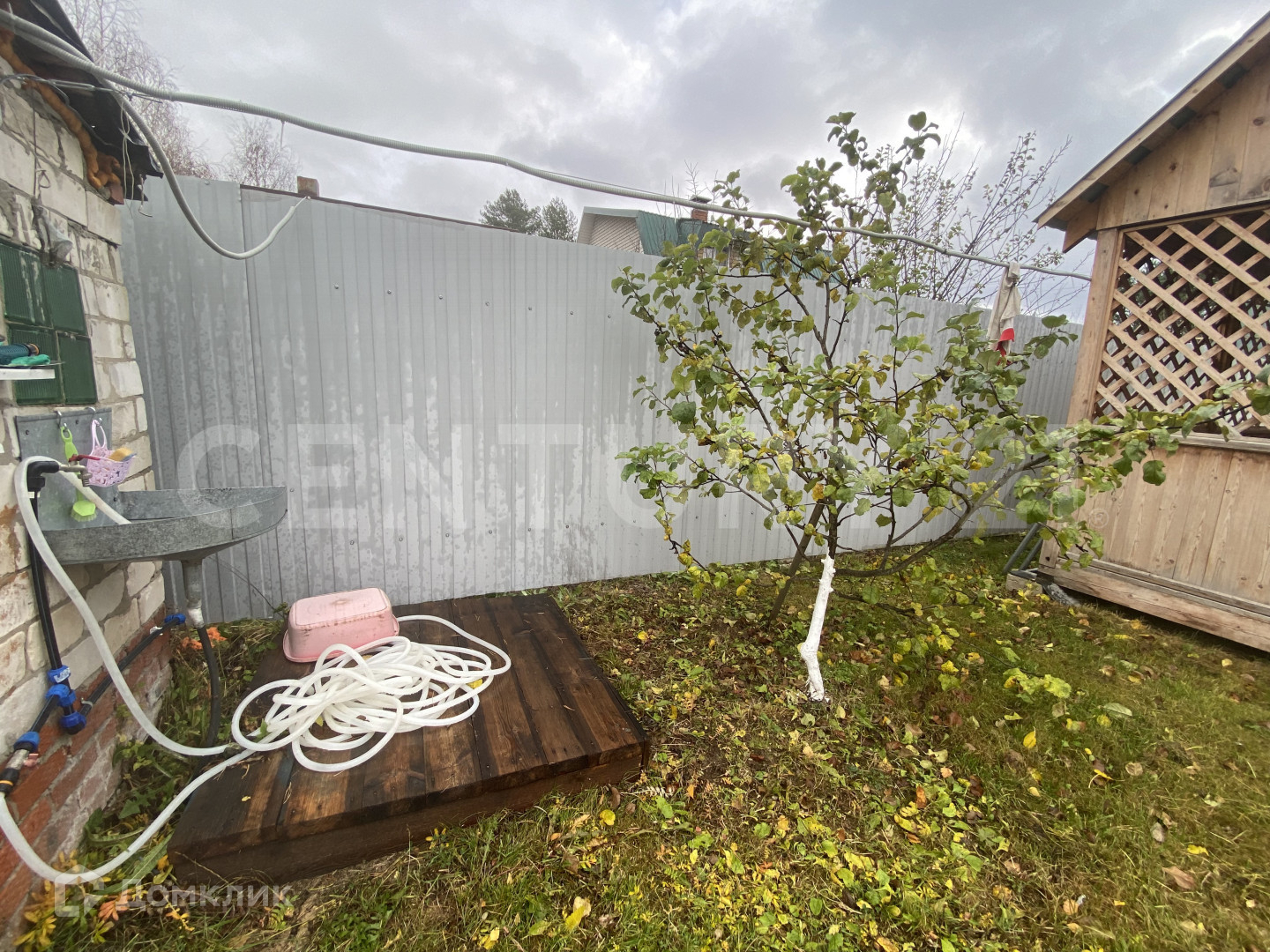 На участке есть плодовые деревья, кустарники, клубника.