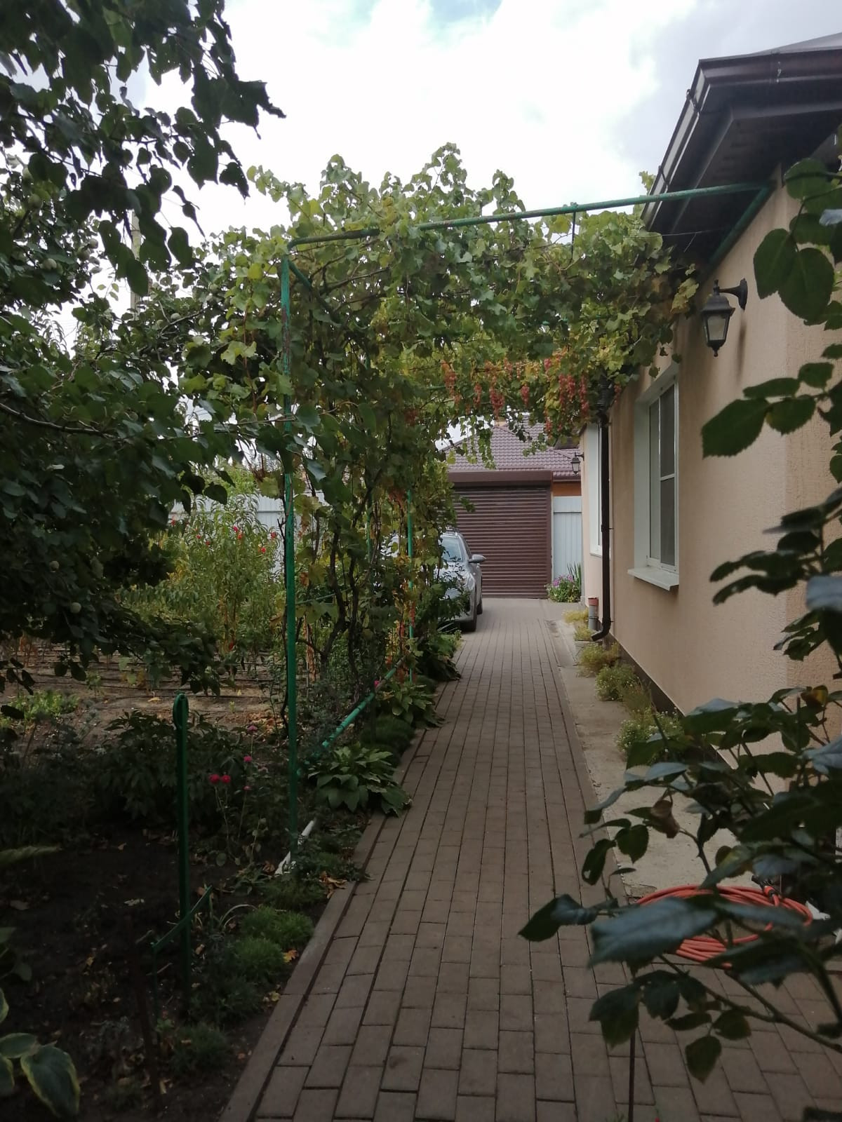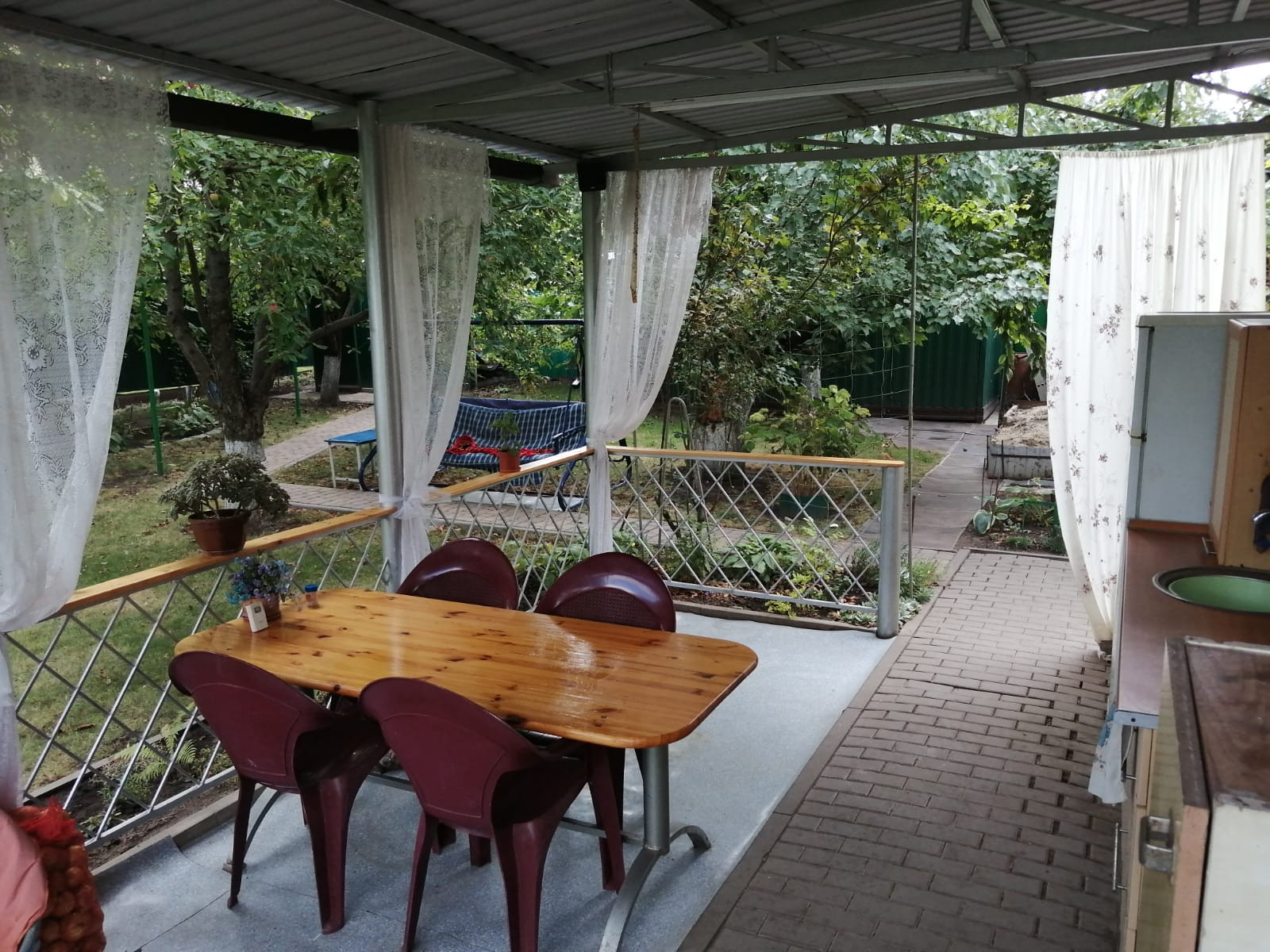 На участке плодоносящие деревья: яблони, груши, абрикос, вишни. Есть виноград, малина, крыжовник, смородина.