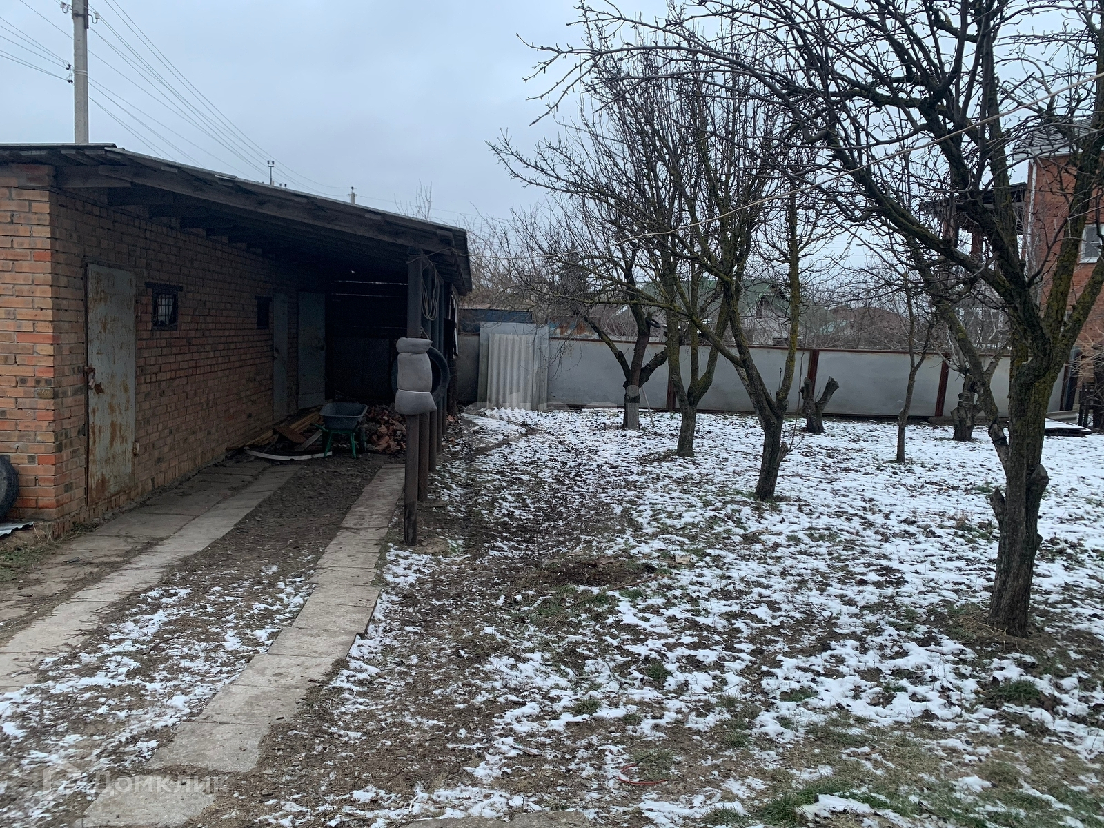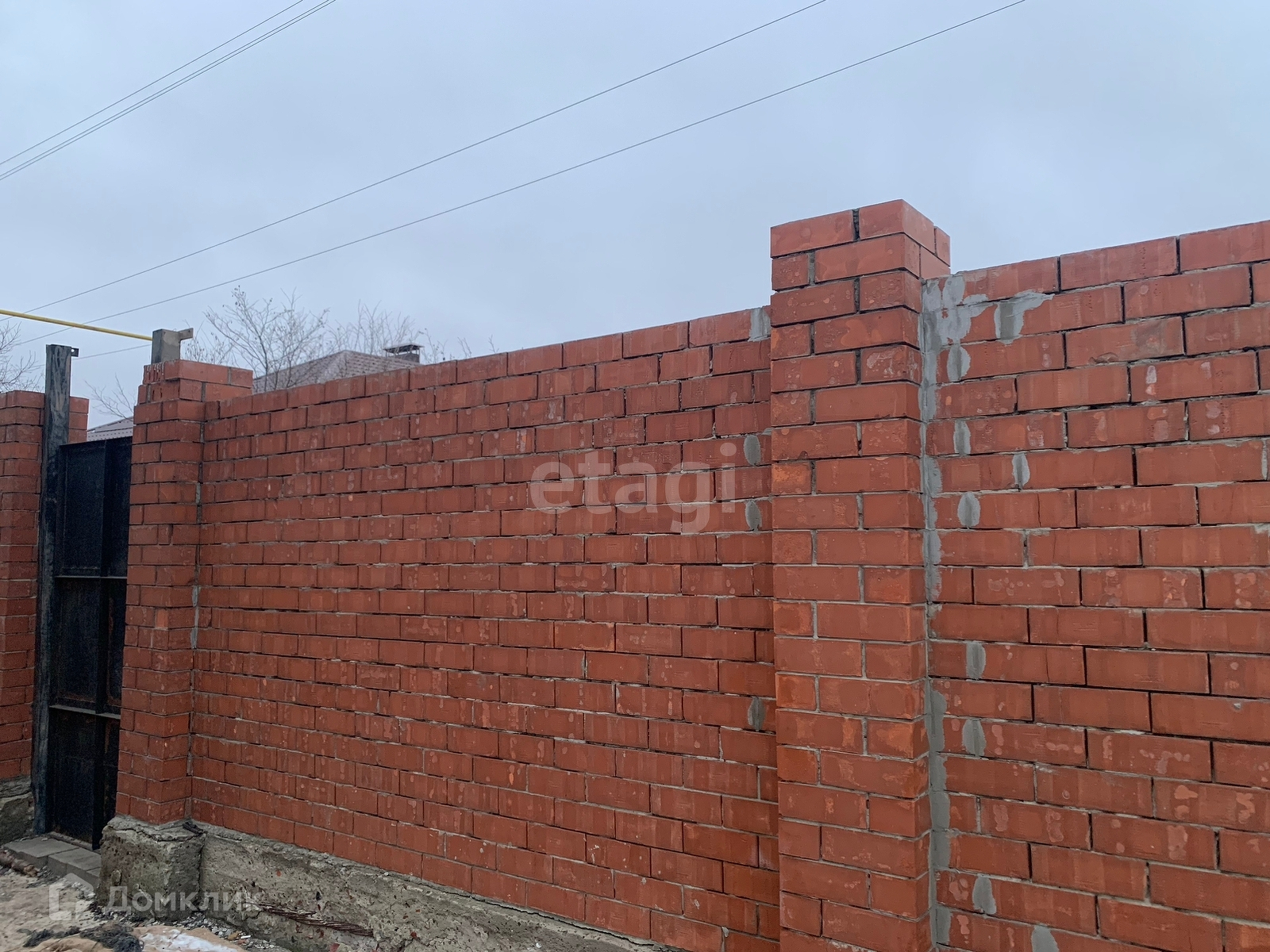 Участок дома огорожен кирпичным забором.
