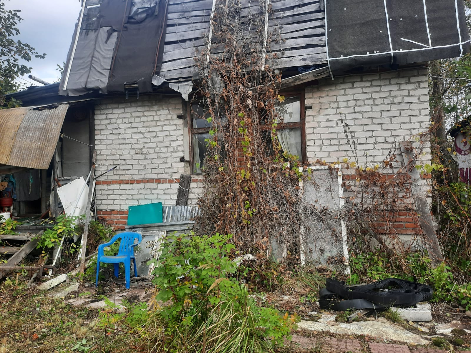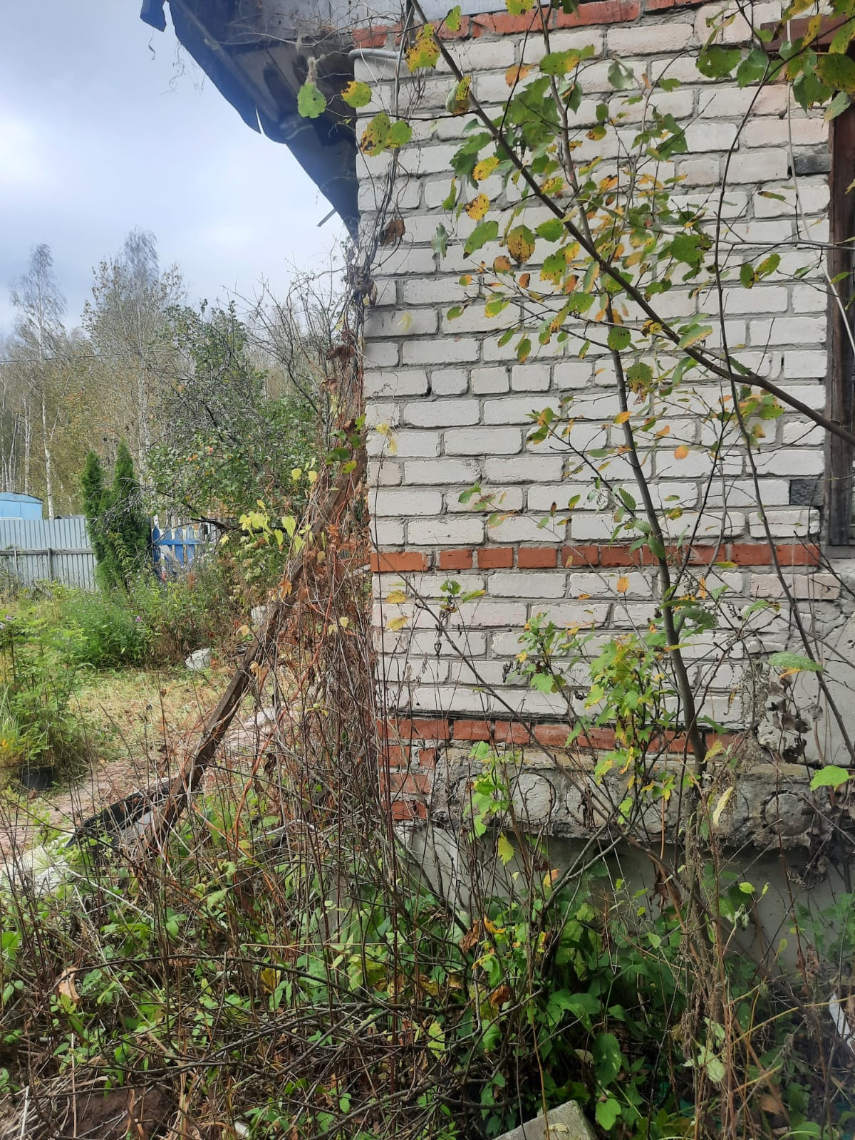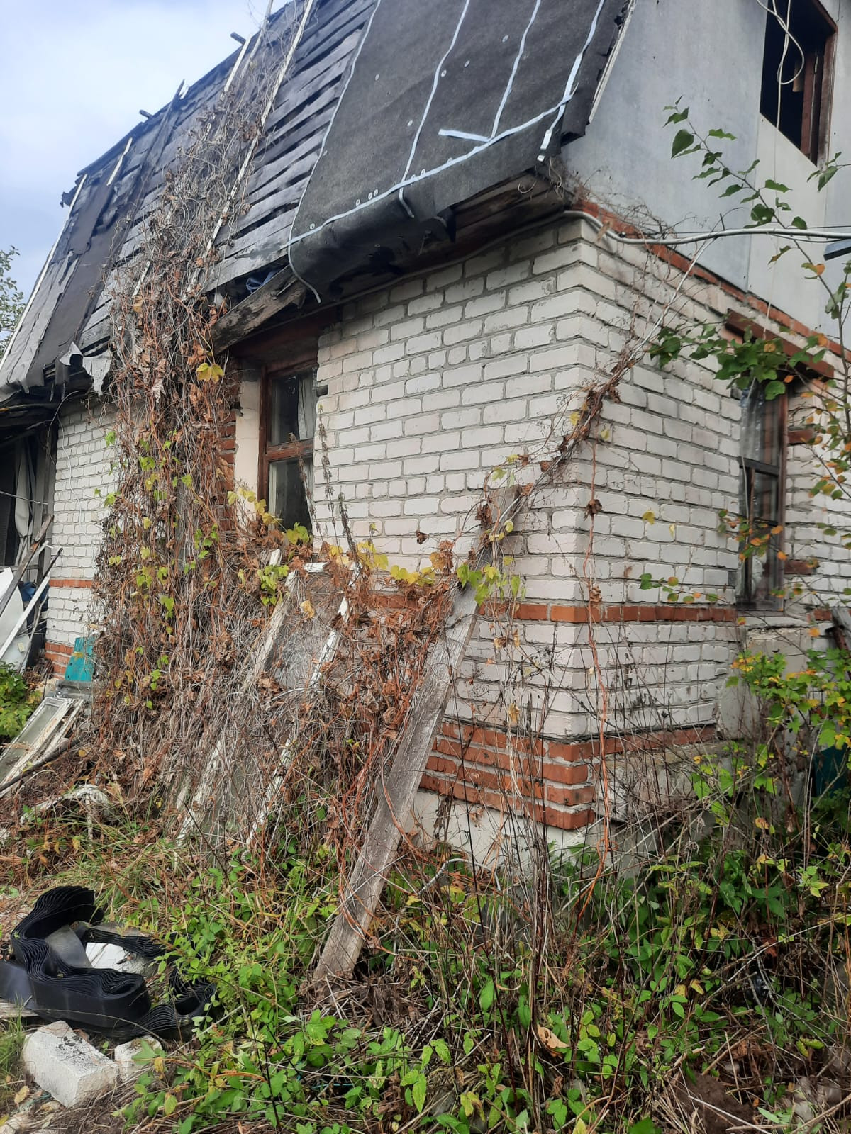 Дом-1 крепкий кирпичный, свет счётчик 5 кВт, нужен ремонт крыши, фундамент - цельные ж/б блоки.