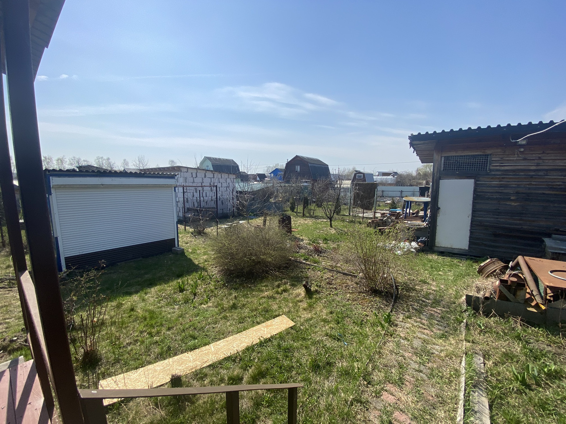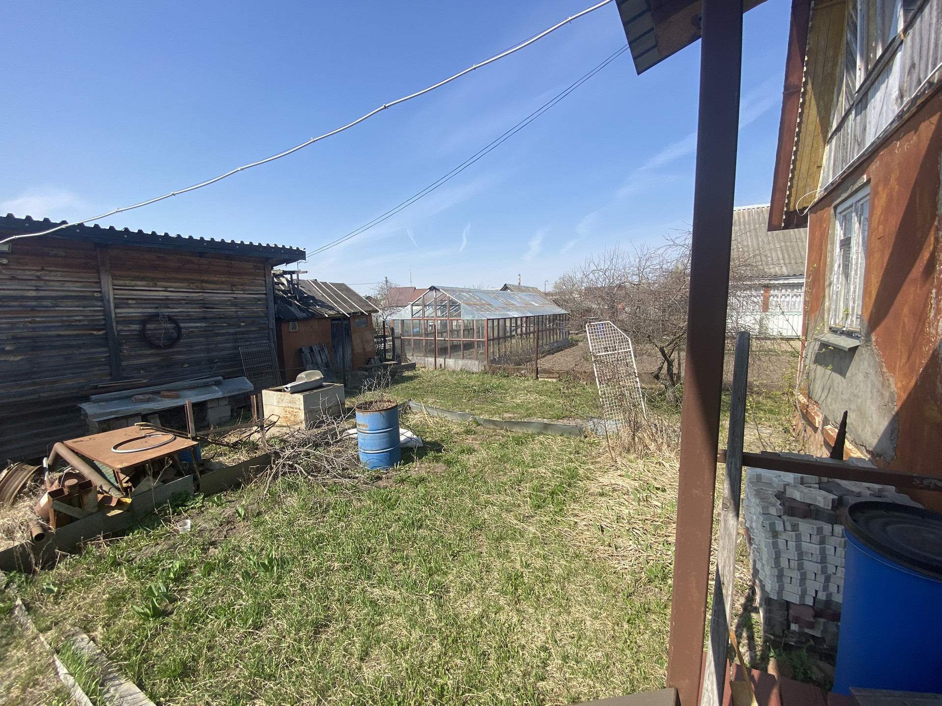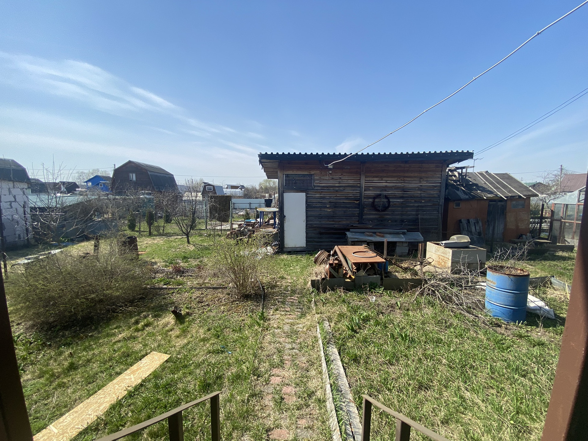 Постройки на участке: Сарай большой, сарай маленький (установлены раковина и ванна, вода идёт из бочки установленной на крыше). Туалет уличный с душем, Беседка. Есть 2 места под машины, одно место с навесом. Колодец (воды нет)