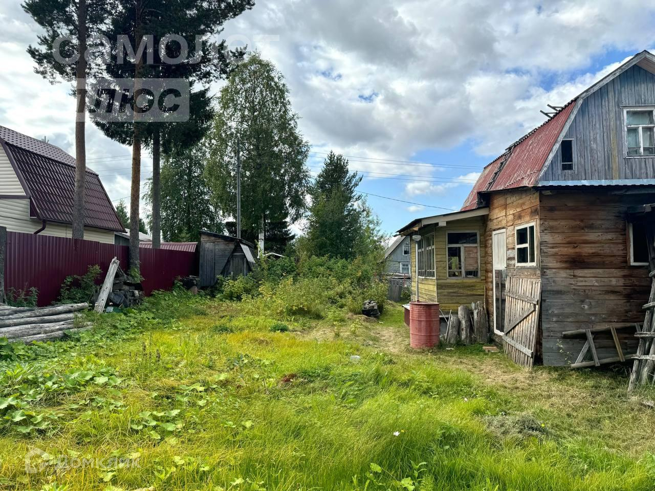 -На участке дачный дом из кругляка на фундаменте из бочек, снаружи обшит вагонкой.
