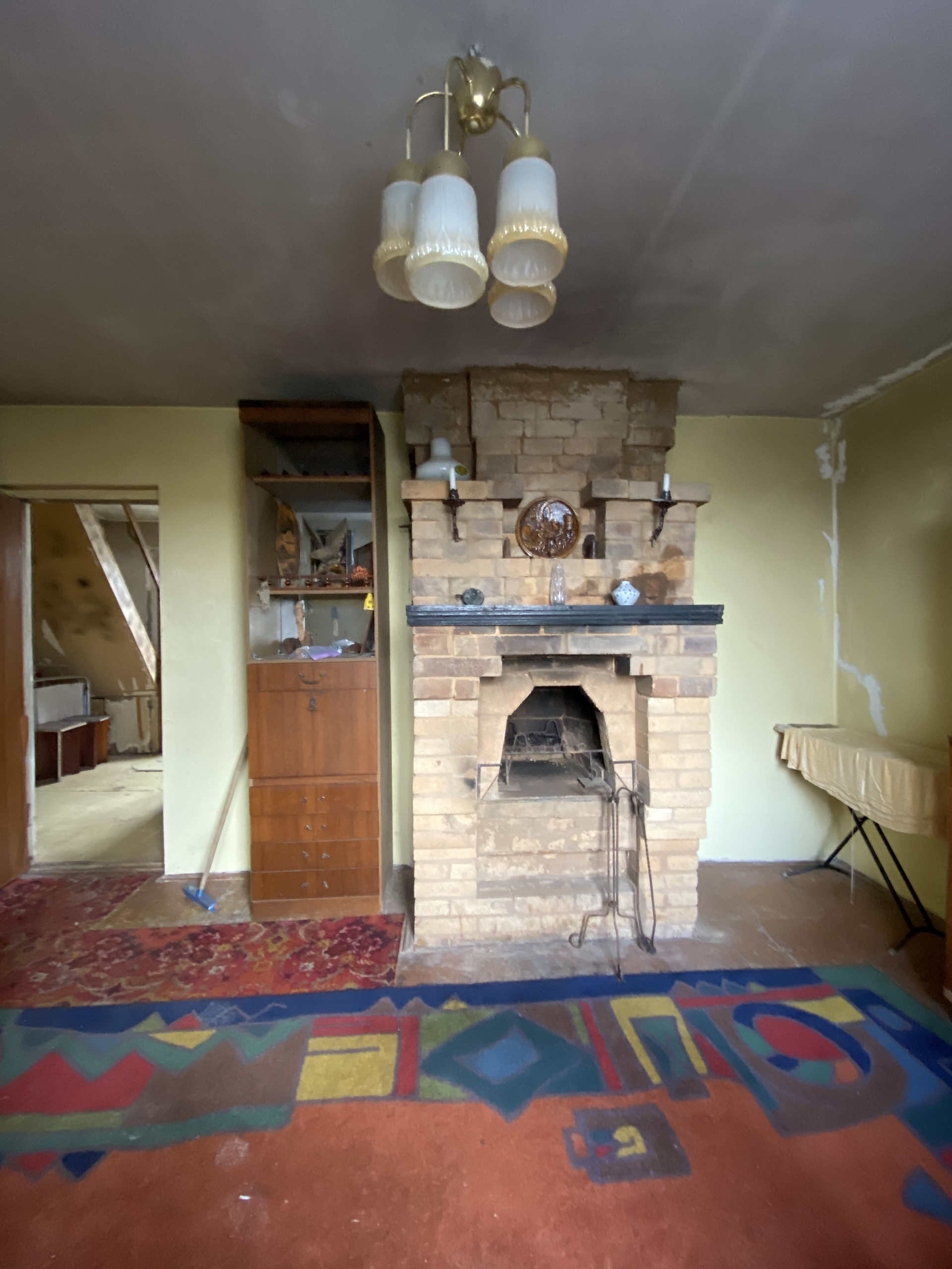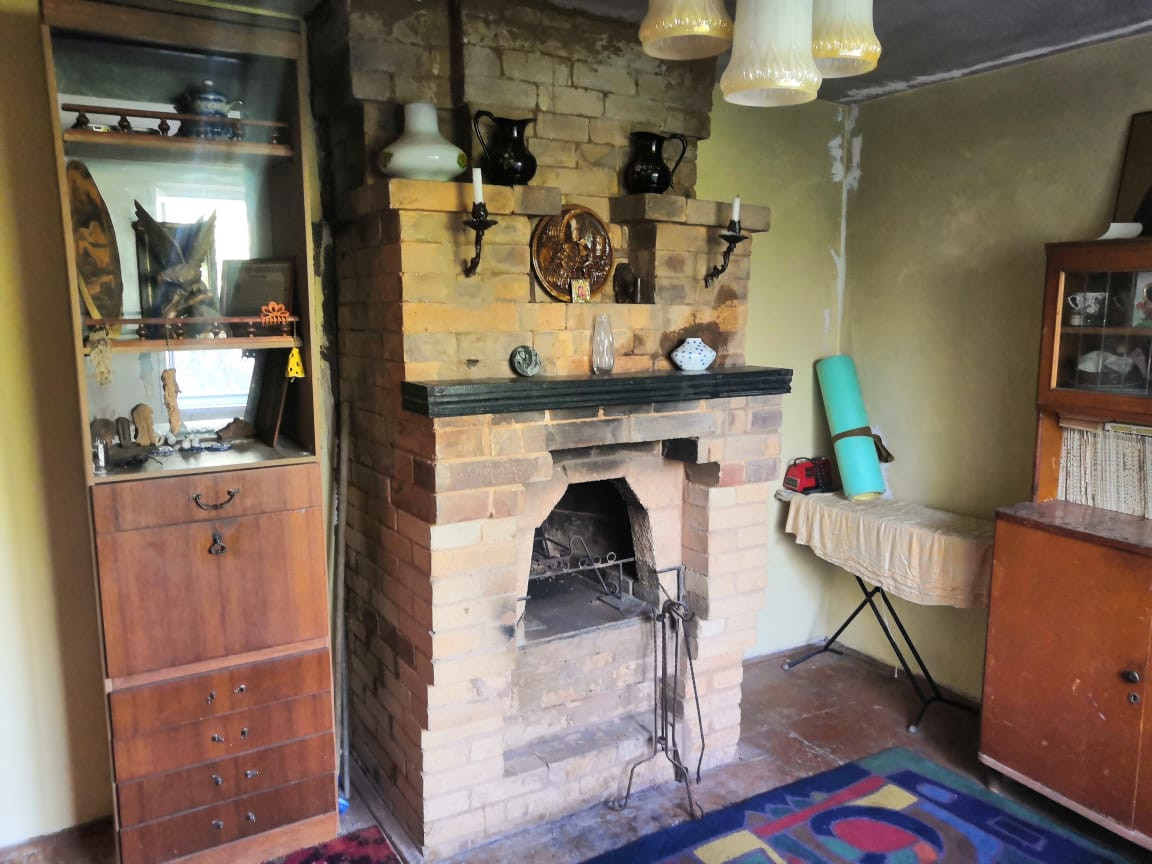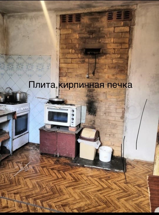 На первом этаже :кухня, комната, печное отопление, лестница на второй этаж.