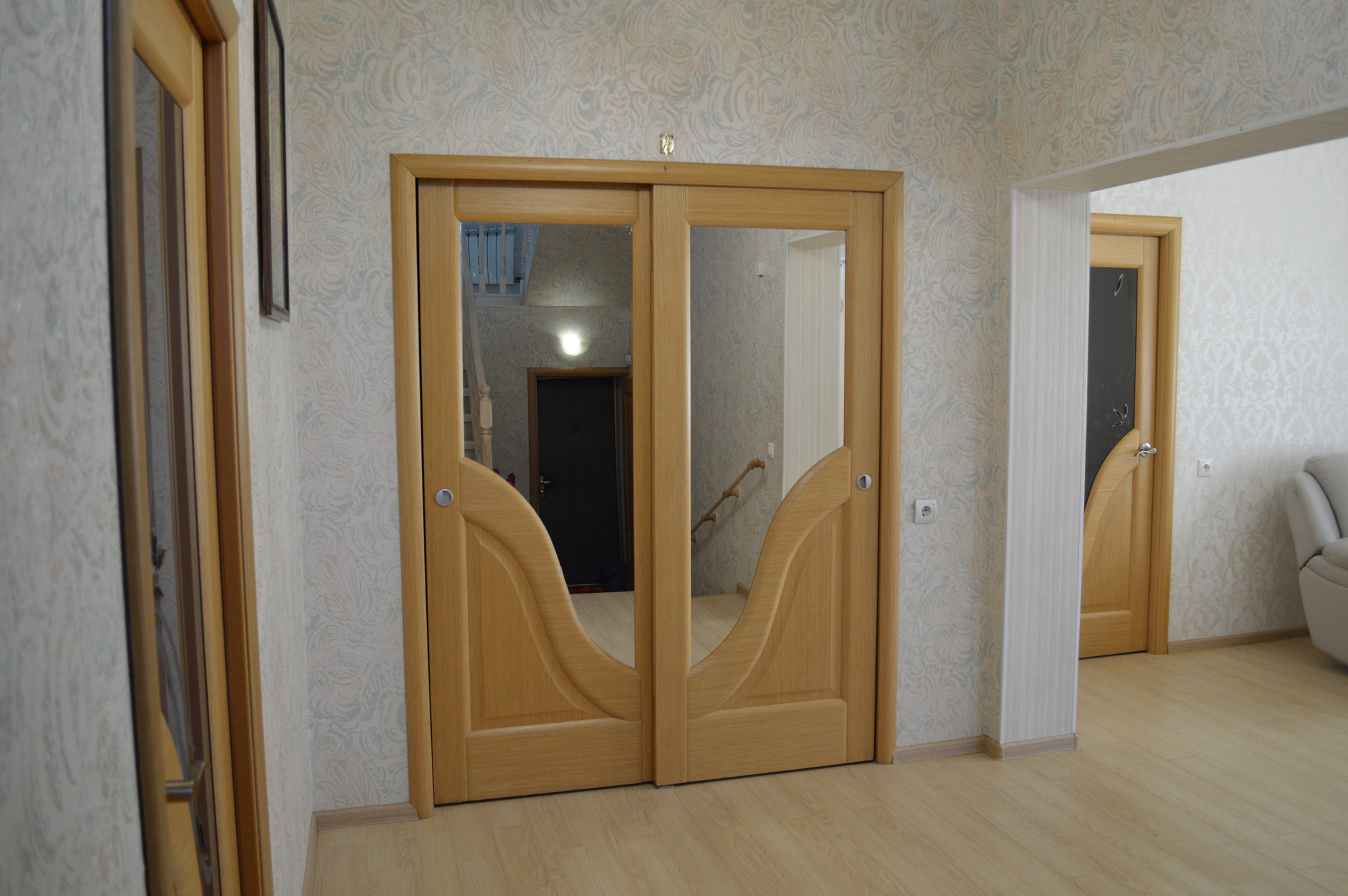 На первом этаже: ванная комната 9 кв. м., две спальные комнаты, в одной есть шикарный балкон с видом на участок, кухня – гостиная 28 кв. м., гараж на одну машину с выходом из дома.