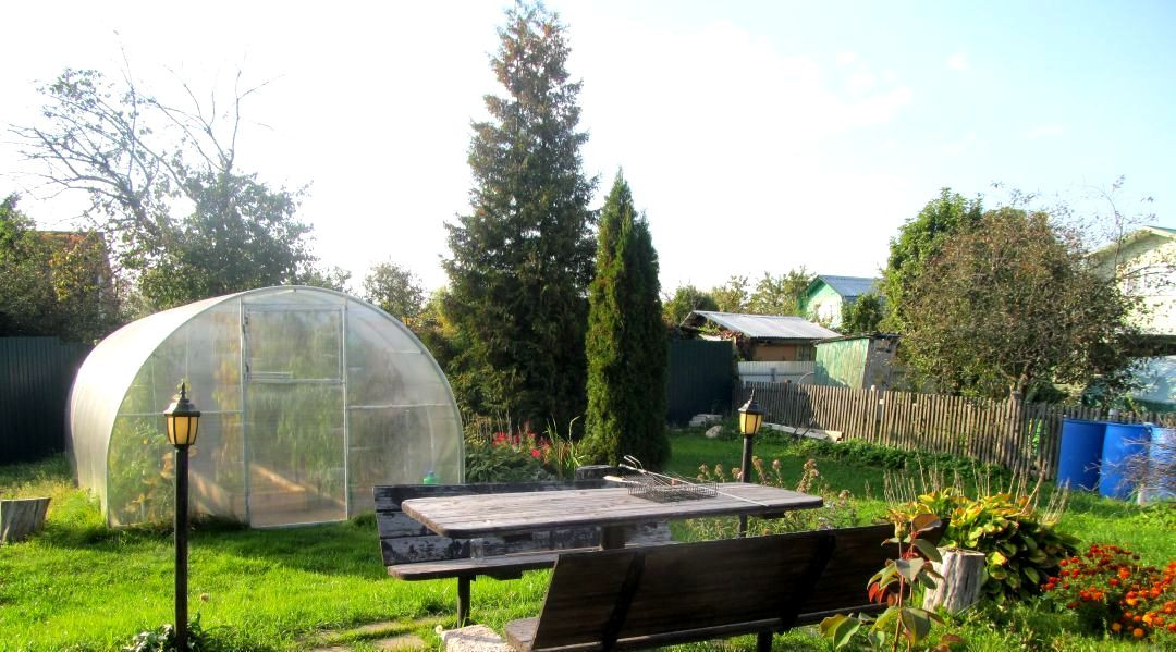 Участок обработан, есть насаждения, хоз постройка, беседка, теплица.