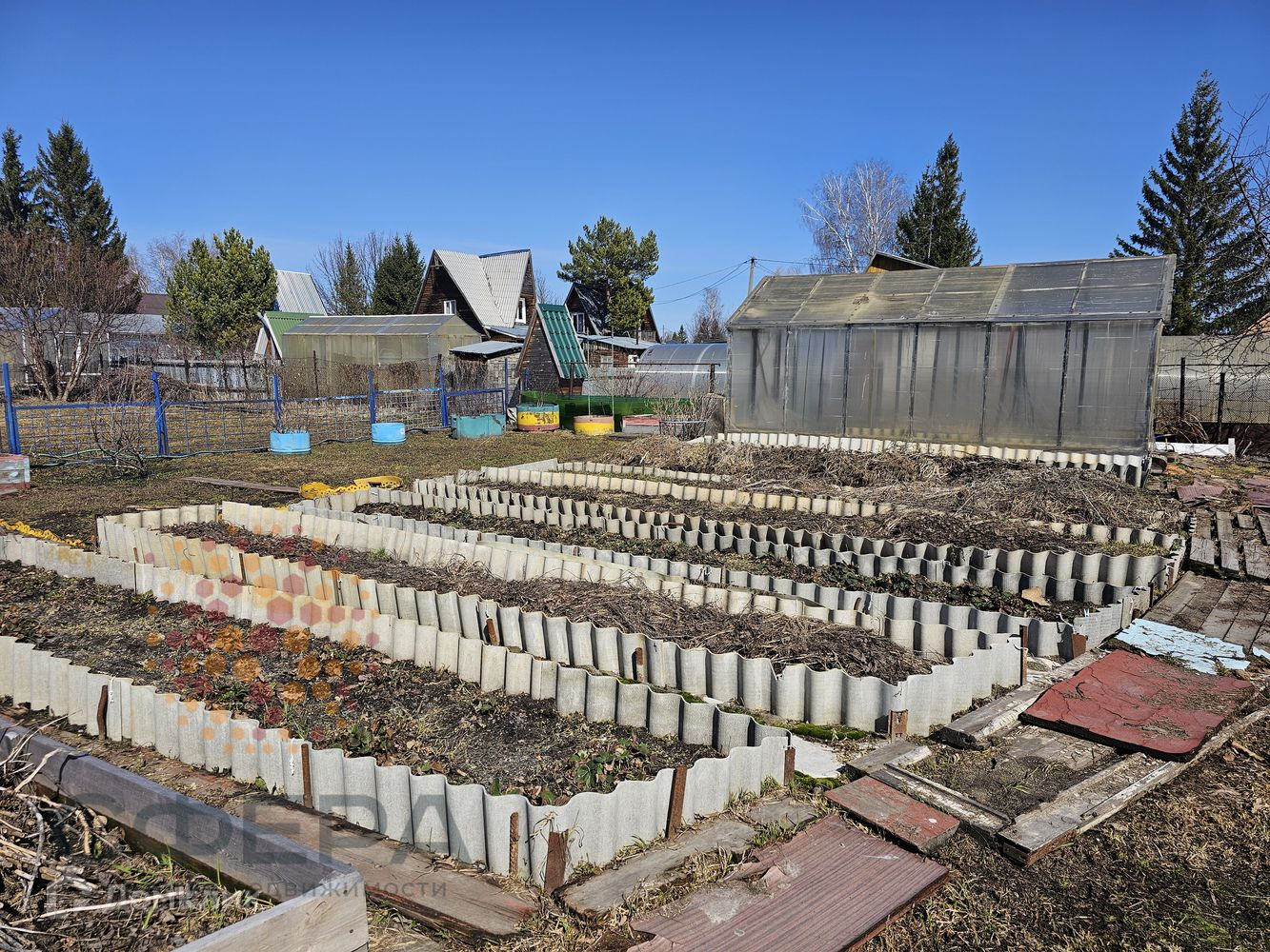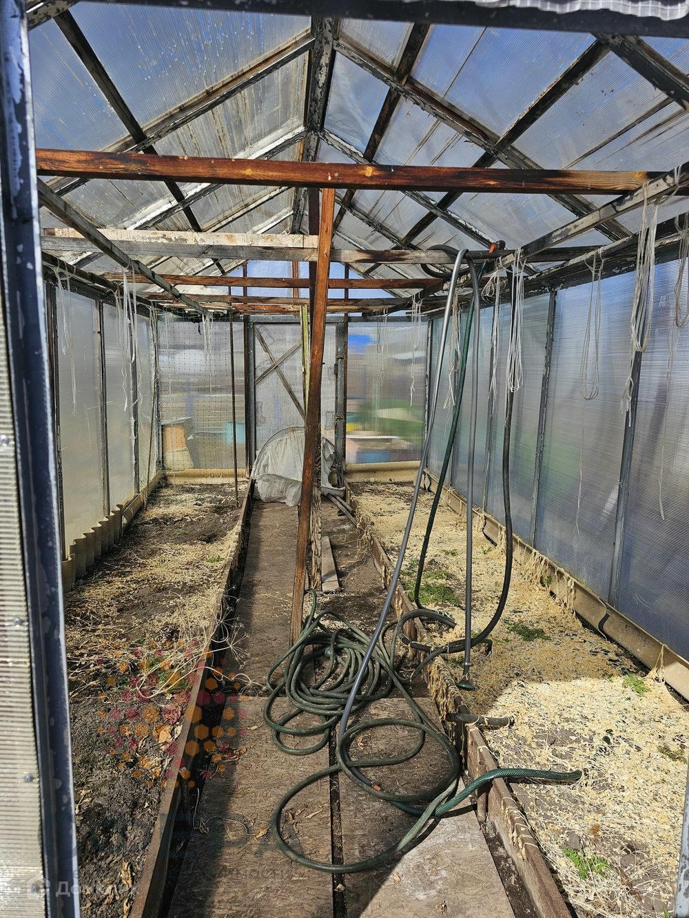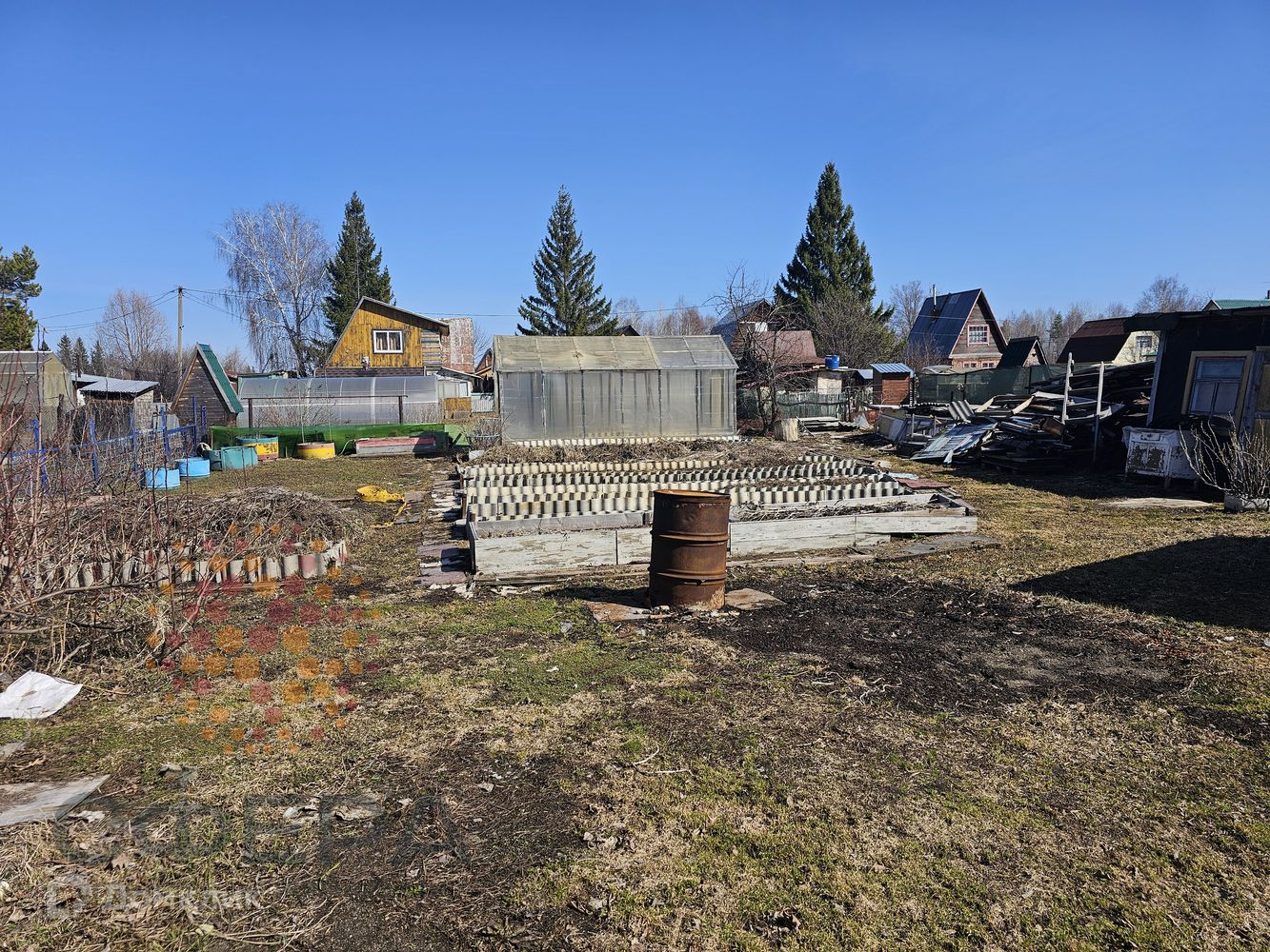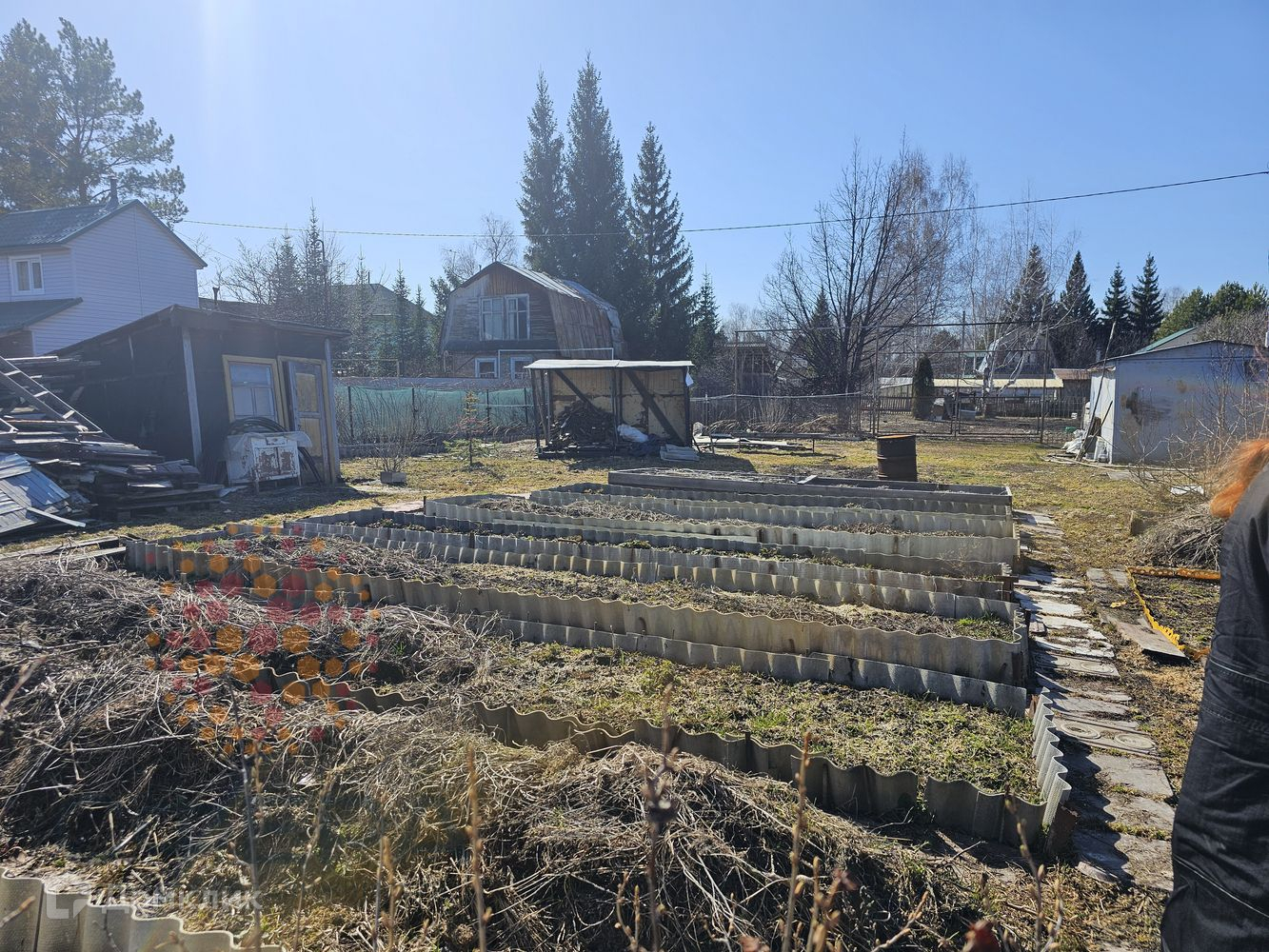 На участке теплица, гараж металлический, много дров, навес для отдыха, огороженные грядки.