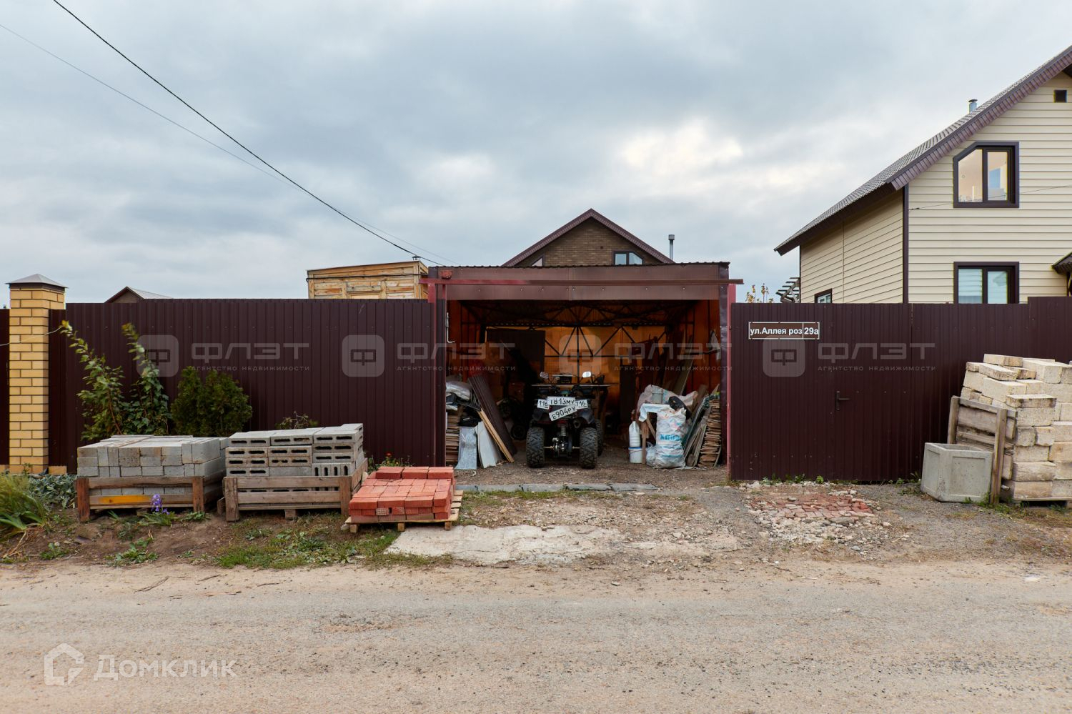 Участок по периметру огорожен забором из профнастила. Откатные ворота.