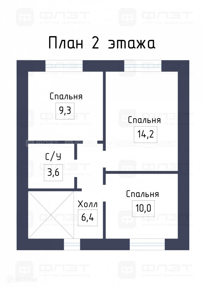 второй этаж: три комнаты- 9,3 м2, 14,2 м2 и 10 м2, санузел -3,6 м2.
