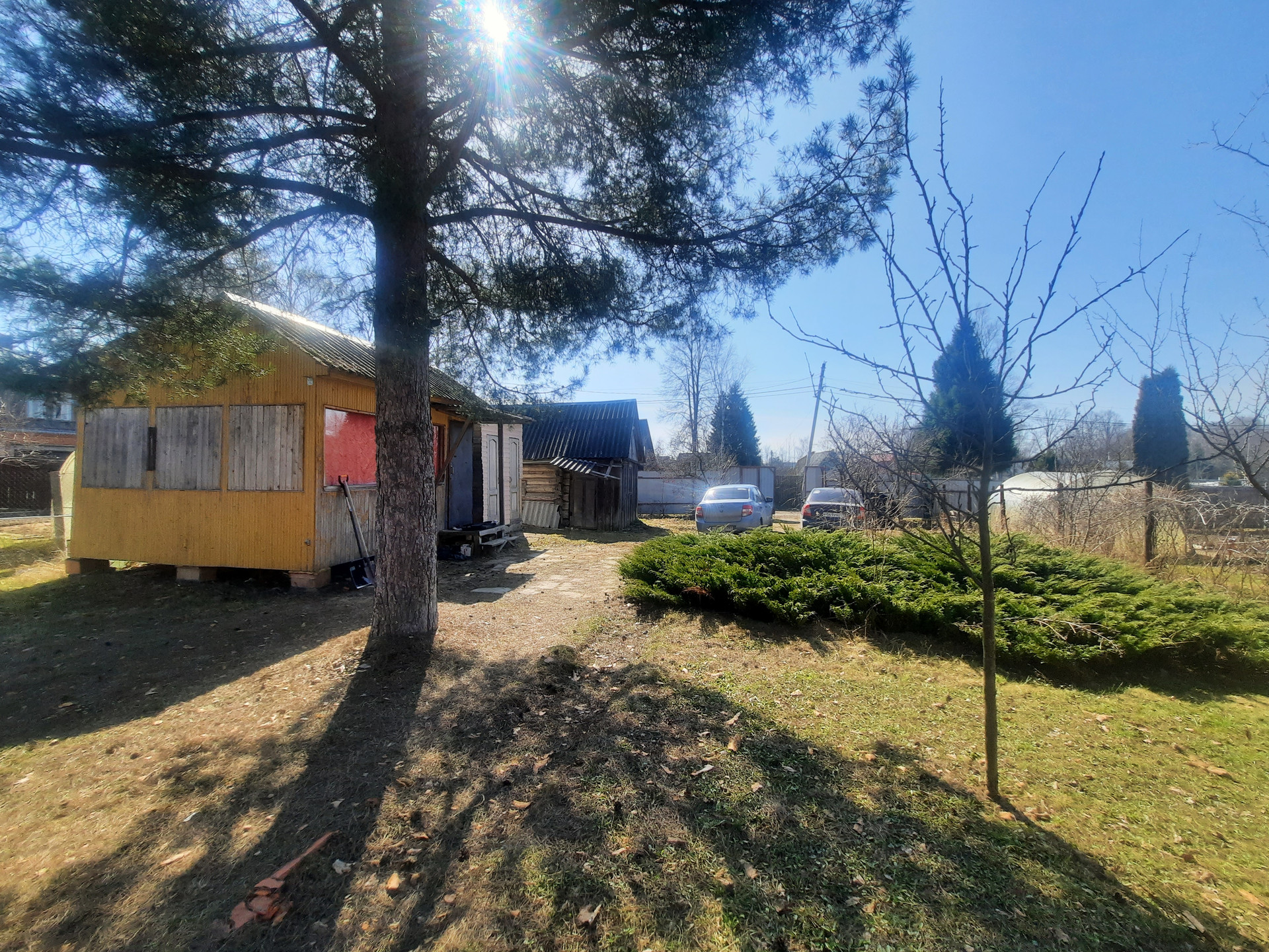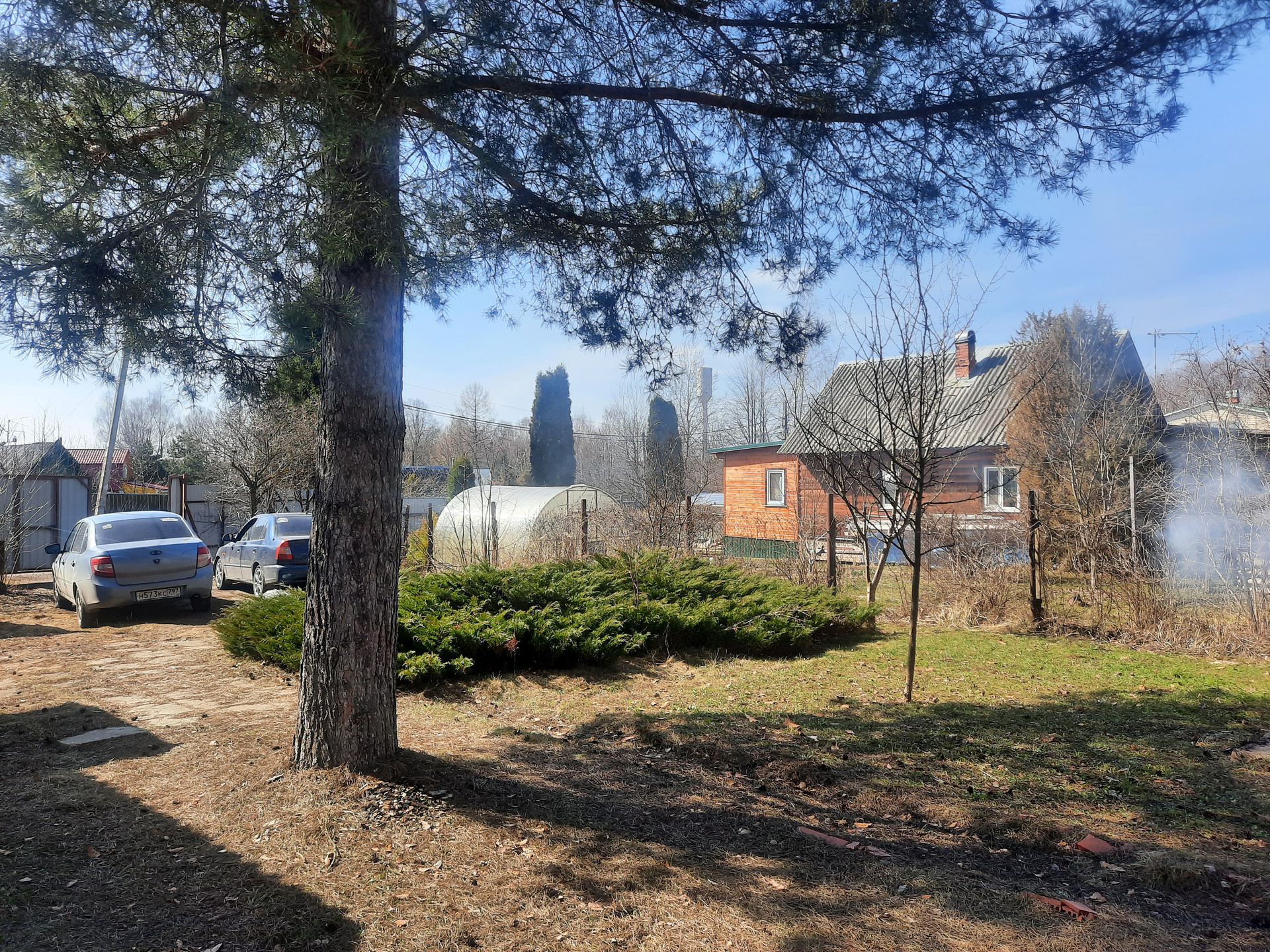 На участке площадка под автомобиль, теплица, плодовые деревья.