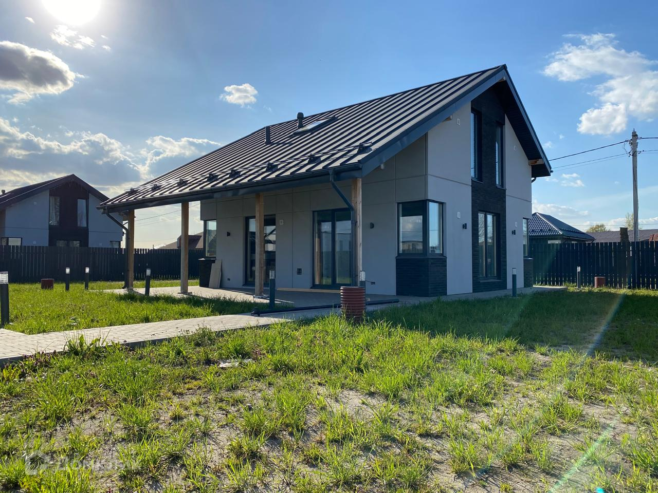 Возможен монтаж забора с откатными воротами с мотором, оборудуется терраса 42 м2, подсветка LED по контуру дома.