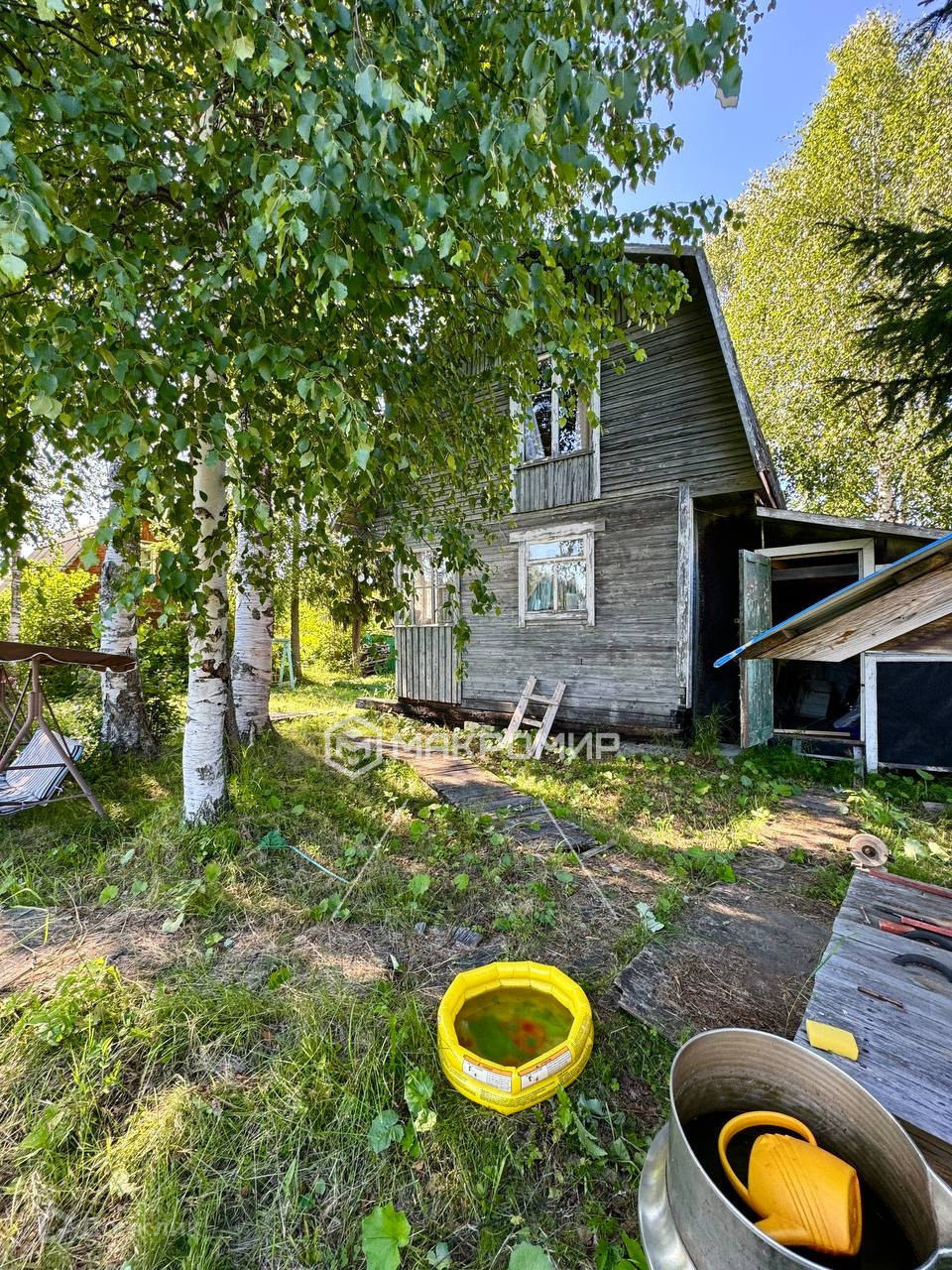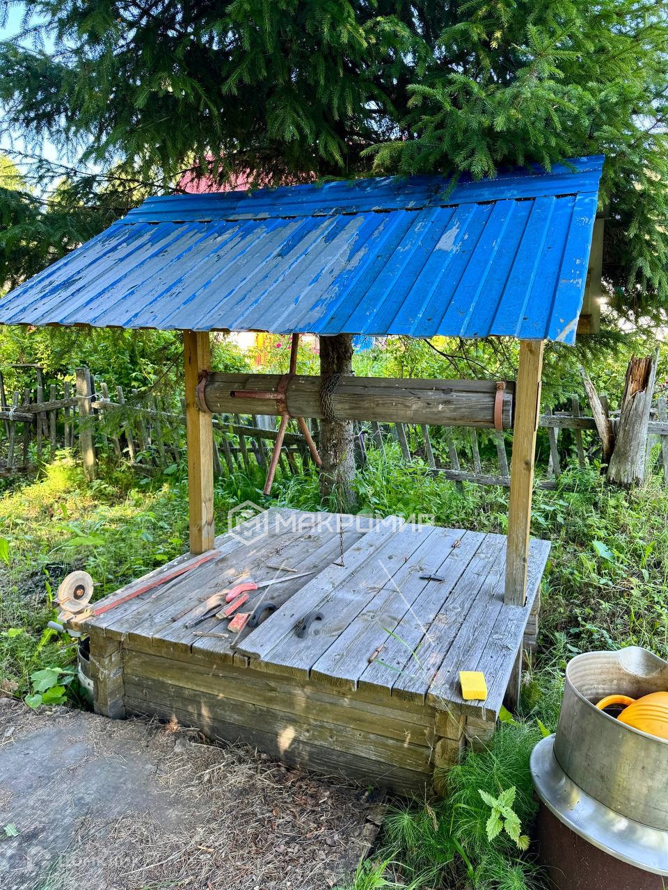 На участке расположены: 2-этажный дом из бруса, баня , дровяник, туалет и колодец с водой для полива и для набора в баню, так же на участке есть ворота с место для паковки автомобиля.