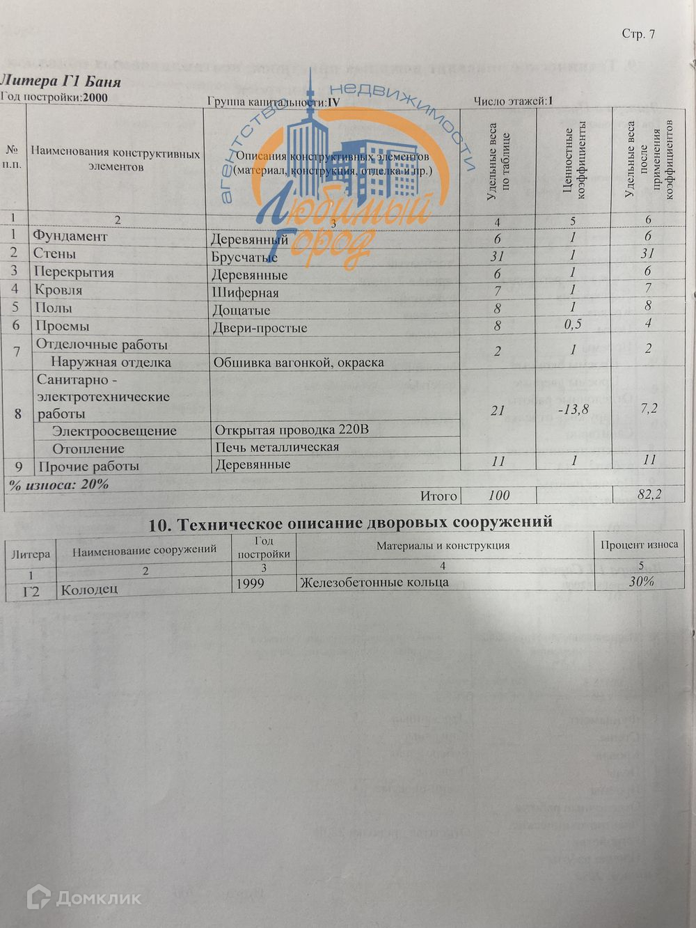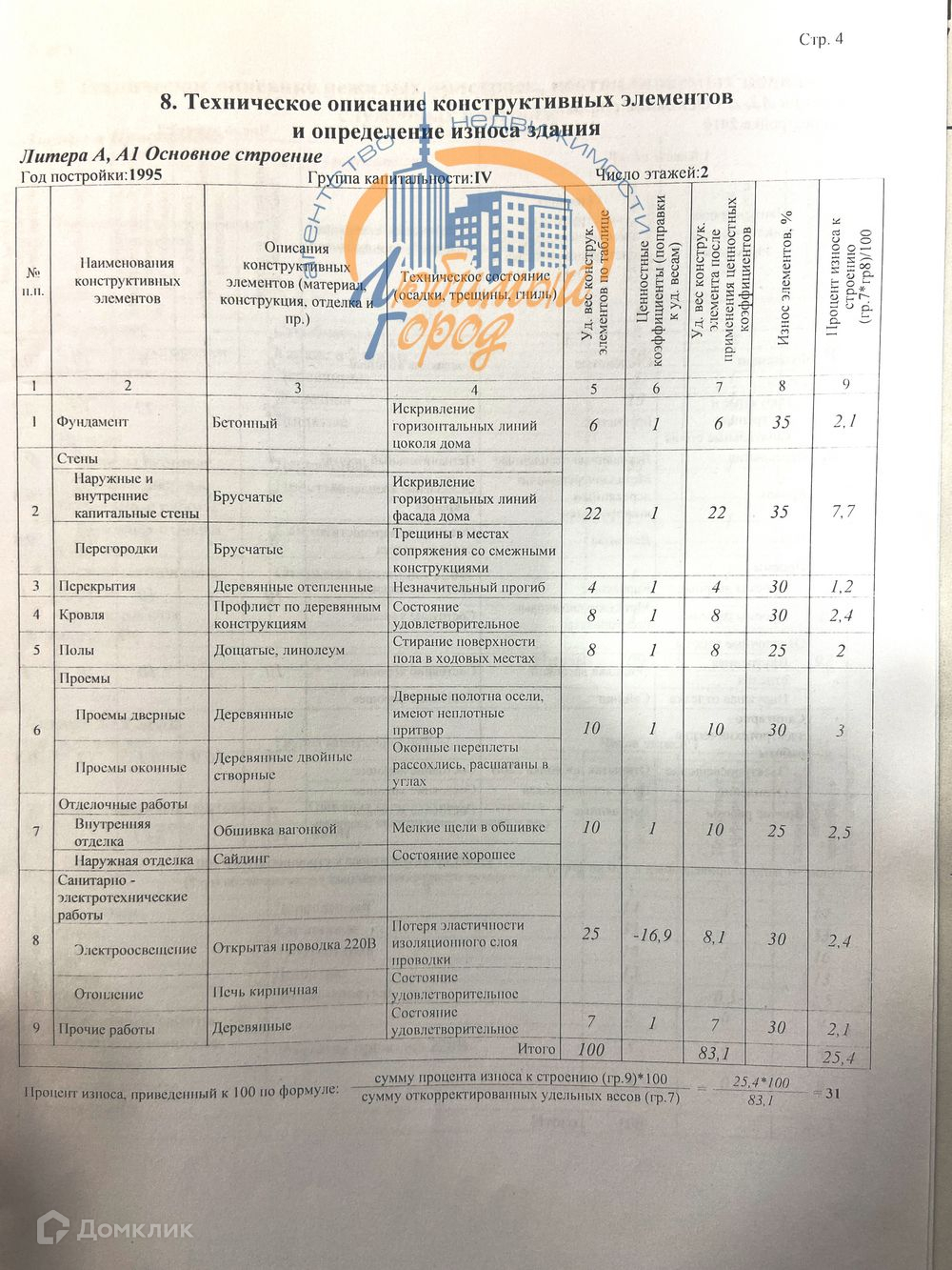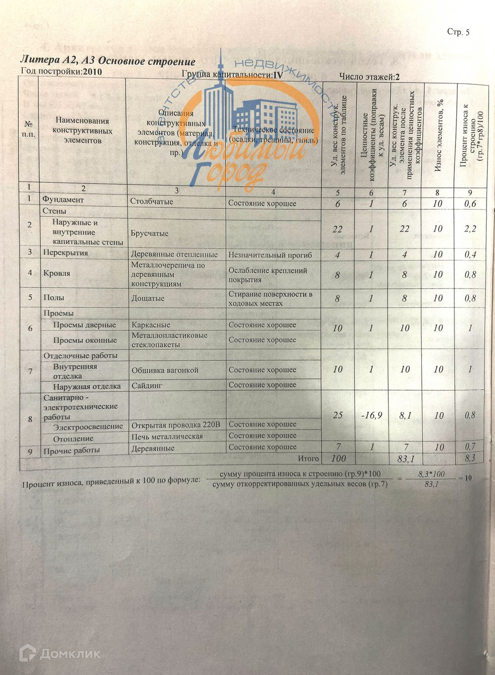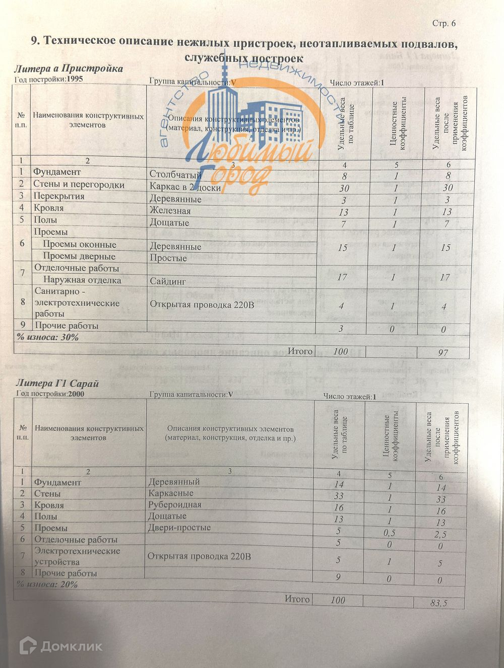 фундамент бетонный, наружные и внутренние стены брусчатые, наружная отделка - сайдинг, внутренняя - вагонка, электричество, отопление - печь кирпичная + металлическая