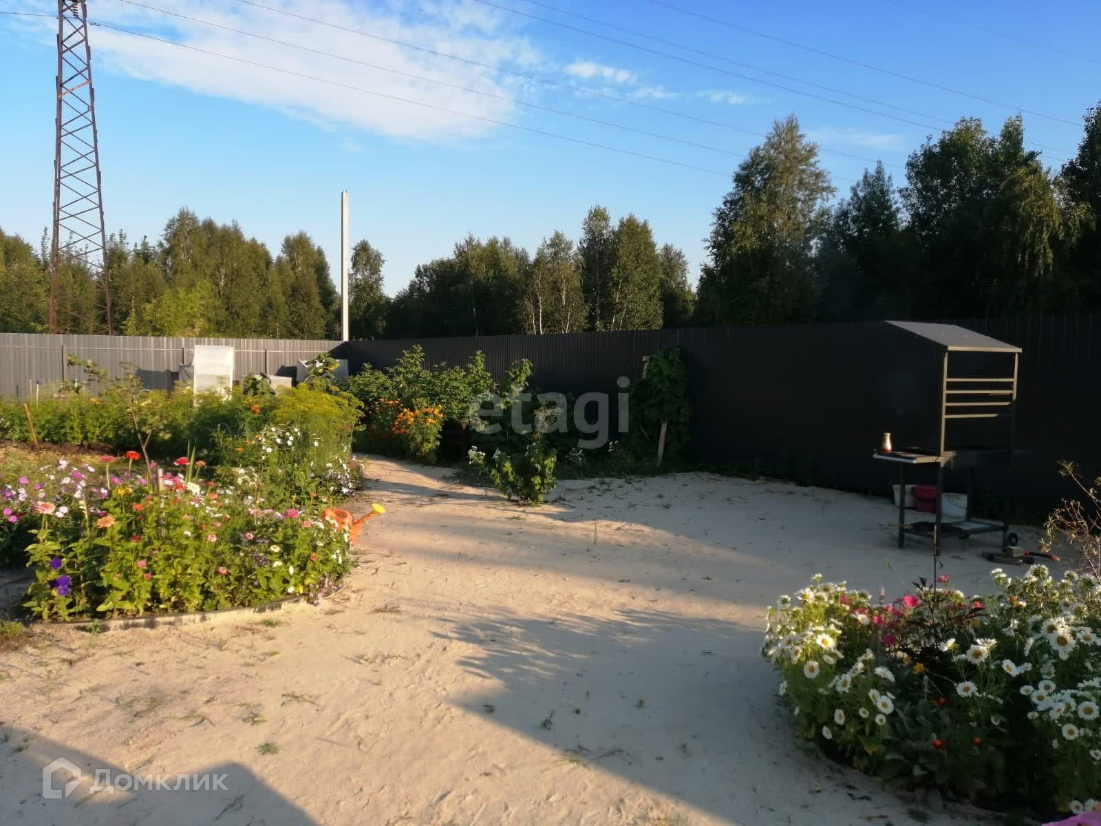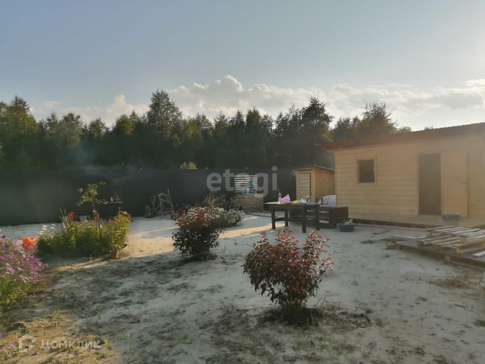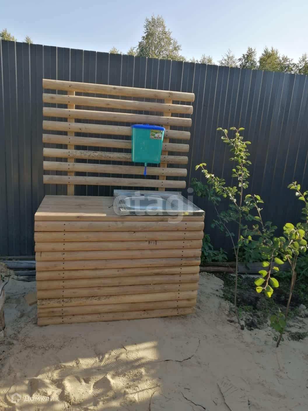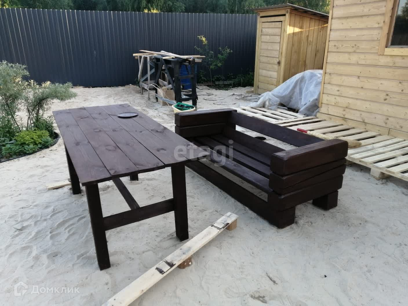 Всё продумано до мелочей. Есть уличный умывальник, декоративный забор для малины, компостная яма, альпийская горка, мангальная зона, огромный уличный стол, скамейки из бруса, участок тупиковый, рядом лес.