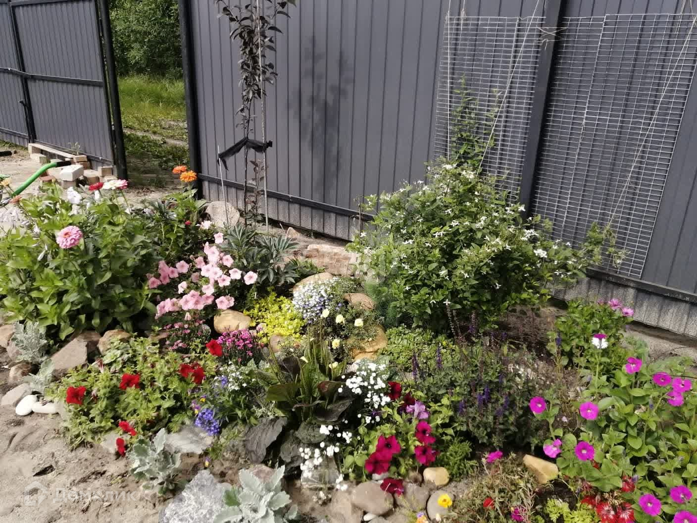 На участке все выдержанно в едином стиле, много цветов, плодоносящих деревьев и кустарников (кусты смородины крыжовника малины)