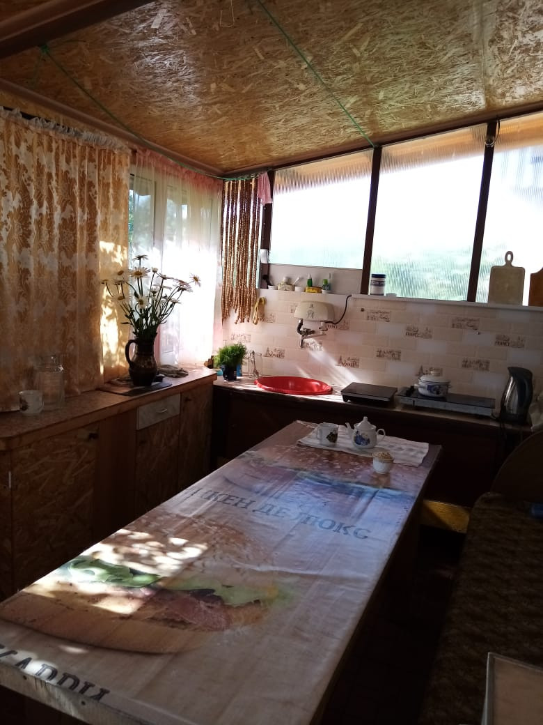 Кухня -веранда, большая комната отдыха, спальня. Навес под машину. Участок обрабатывается 4 сотки,огорожен. Плодоносящий сад, жимолость, клубника, урожай.