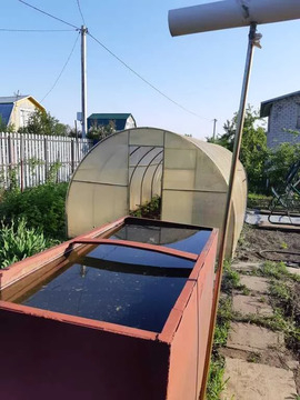 На участке баня, каркасный бассейн, туалет, емкость для воды, забор евроштакетник.