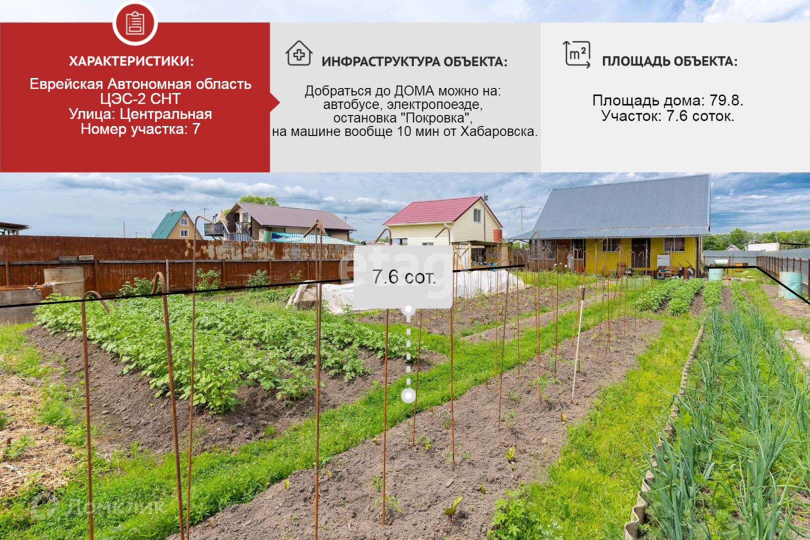 Продаётся отличный благоустроенный, добротный и ухоженный ДОМ- дача из бруса (15х15) площадью 80 кв.м., для круглогодичного проживания с участком 7,6 соток в СНТ ЦЭС-2, всё под охраной. Дом стоит на сваях. На участке расположен дом (4 комнаты), контейнер 5т, летний душ, дровяник, Летняя кухня пристроена к дому 16 кв.м. Установлена скважина и септик, электричество 380 В. 15кВт (освещение круглый год с выгодным тарифом), установлены пластиковые 5ти камерные окна. В доме остаётся практически всё заехать и жить. Участок ухоженный, земля удобрена и плодородная, имеются различные насаждения. В 150 метрах пляжная полоса + рыбалка (Пензенская протока). Добраться до ДОМА можно на: автобусе, электропоезде, остановка Покровка, на машине вообще 10 мин от Хабаровска. Дорога до дачного общества отличная, зимой постоянно чистится. Строится много коттеджей, где люди живут круглый год. Строения зарегистрированы, все в собственности, межевание выполнено, документы готовы к сделке. Звоните и записывайтесь на просмотр и приобретайте!!!