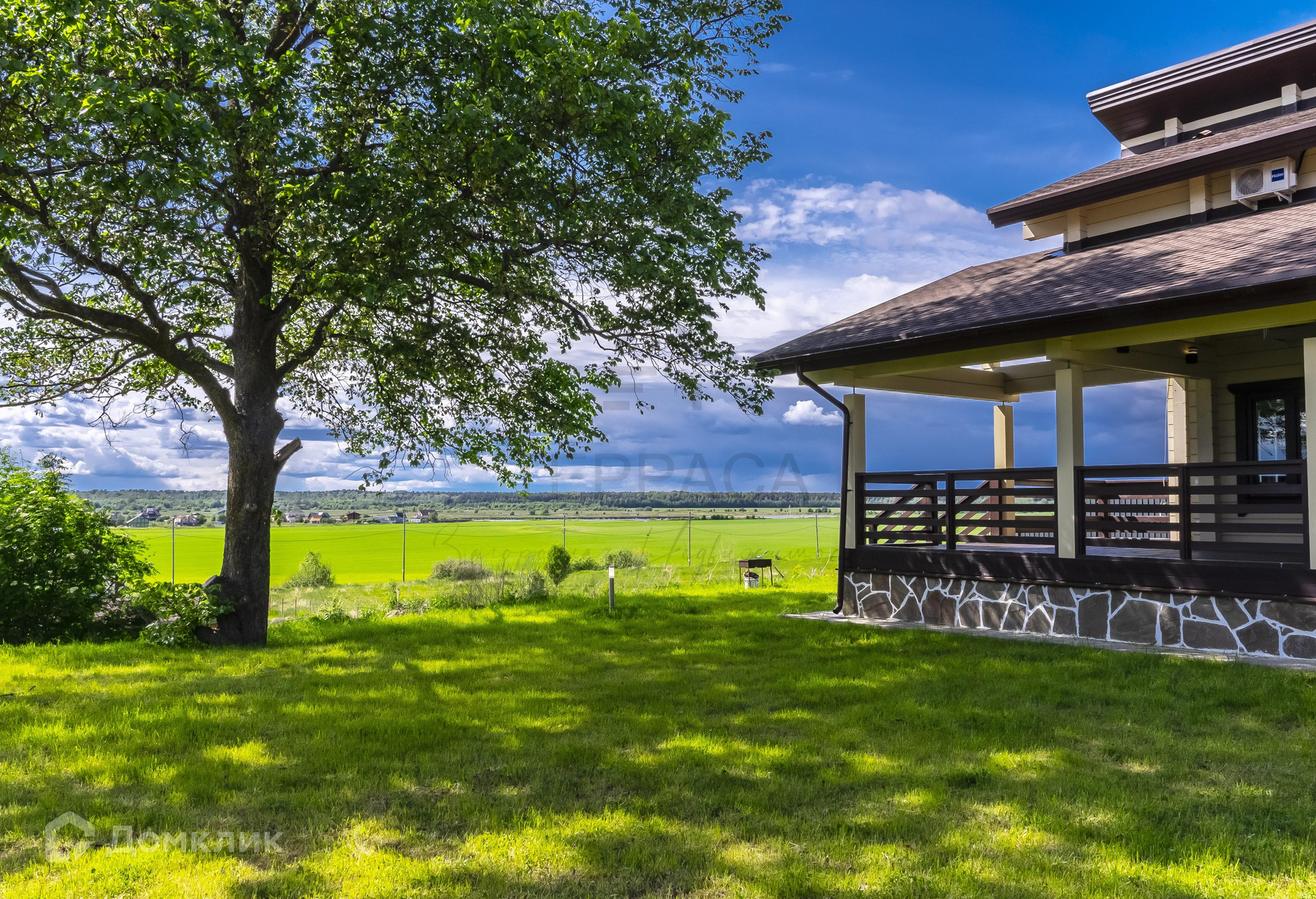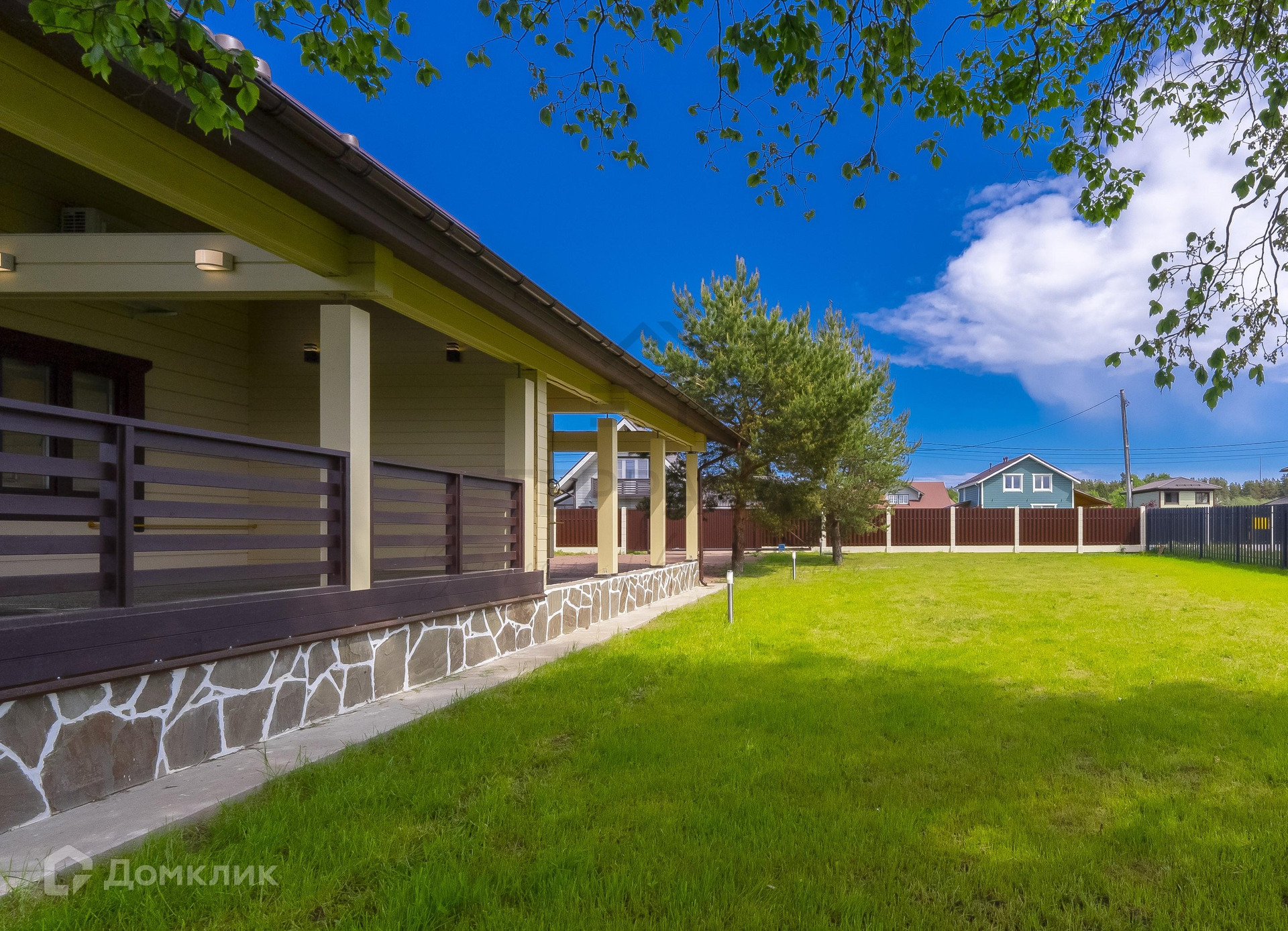Мощение – въезд, парковка на 3 автомобиля и подходы к террасе дома: отсыпаны мелким гравием. Ровный и ухоженный ландшафт. Высажен газон, растут 2 сосны и вяз.