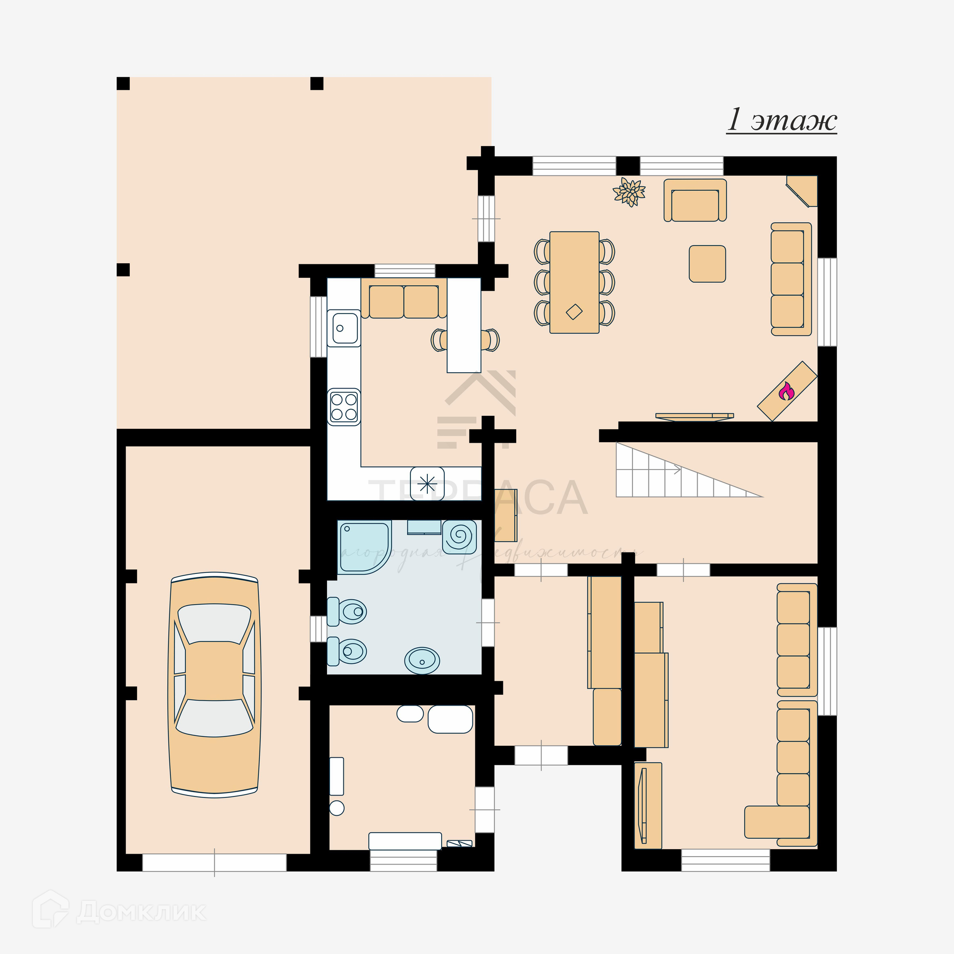 1 Этаж – стильная кухня-гостиная, изолированная комната, кладовая, с\у, душевая, котельная, гараж.