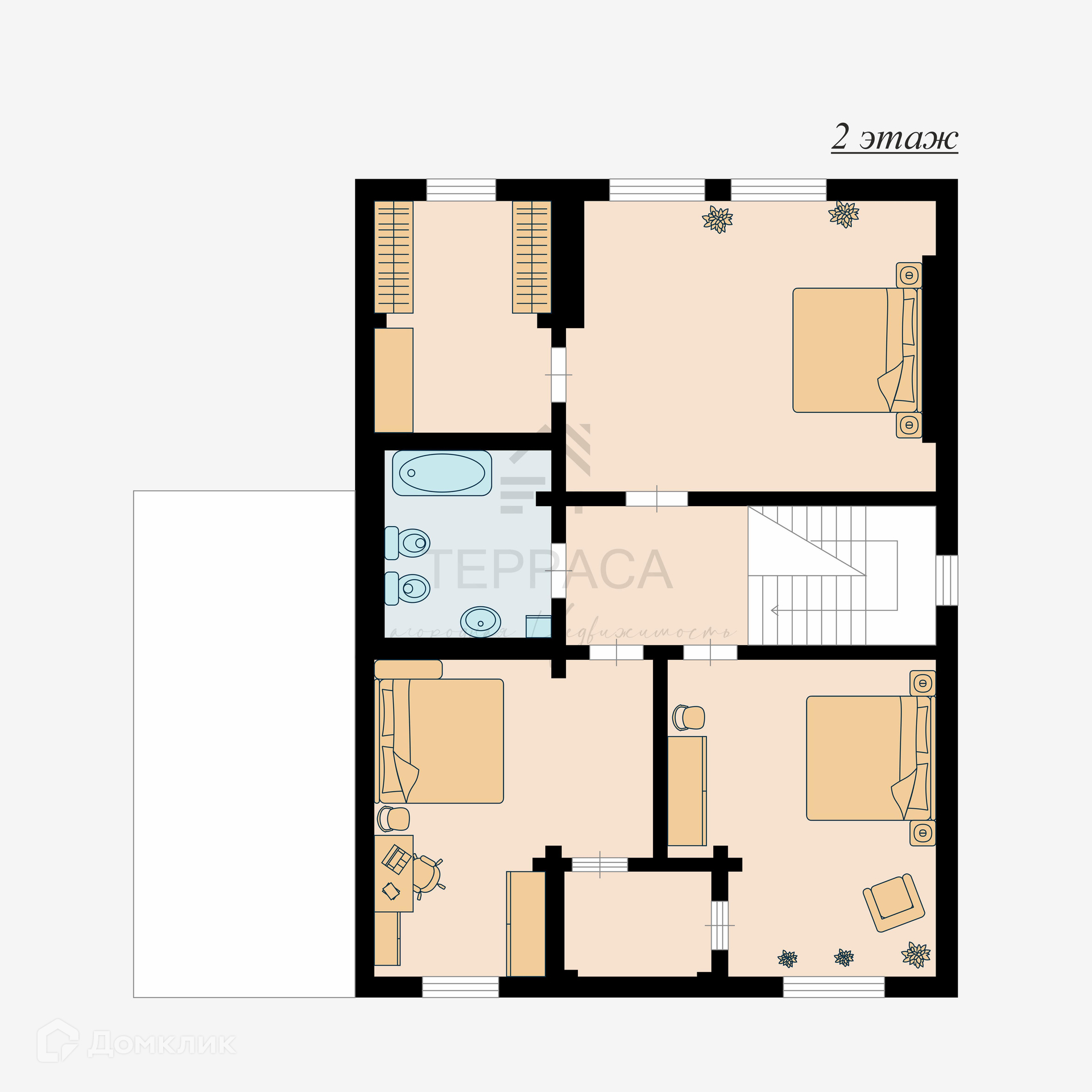 2 Этаж – холл + выход на балкон с видом на реку Бурную, 3 изолированные комнаты с отдельным гардеробом, с\у, ванна.