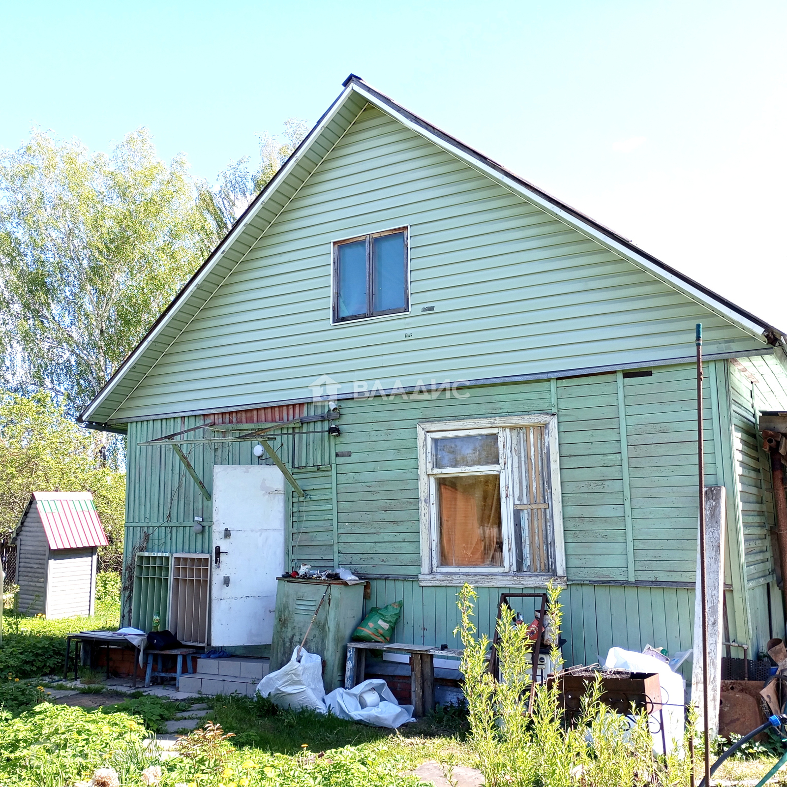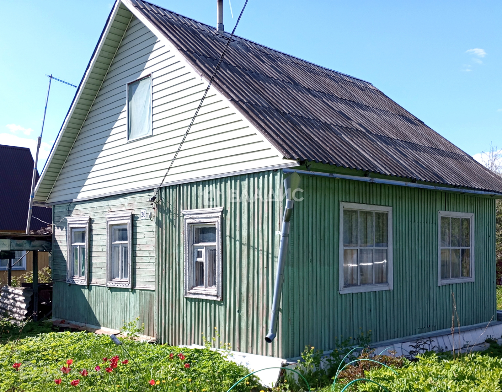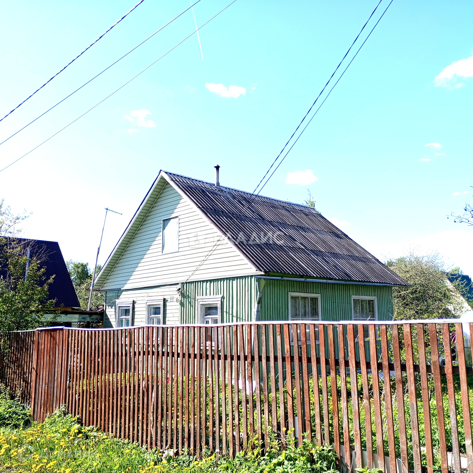 На участке расположен двух этажный деревянный дом ,  общей площадью 72 кв.м. , В доме есть электричество и вода ( с апреля по октябрь - центральный водопровод) .