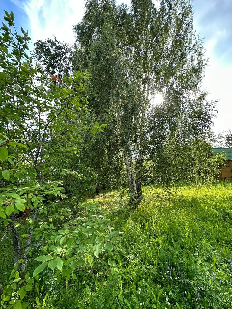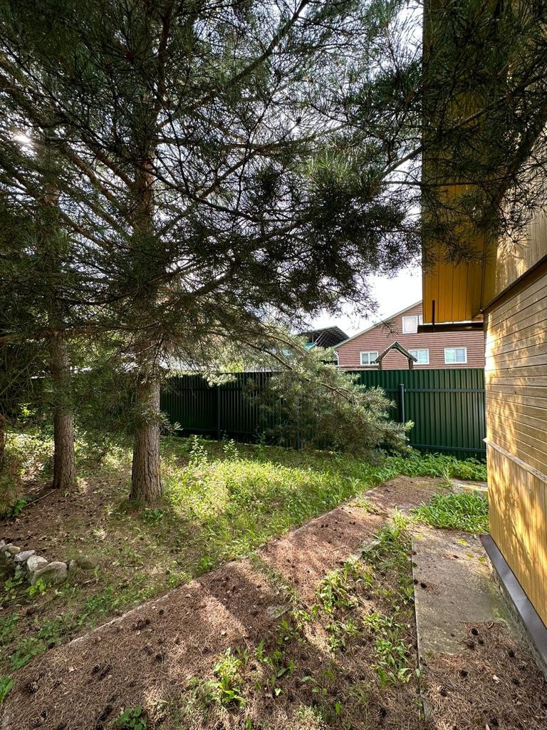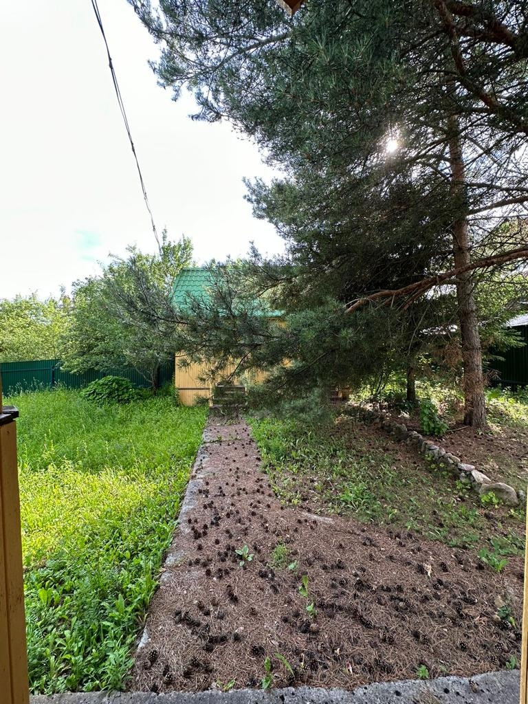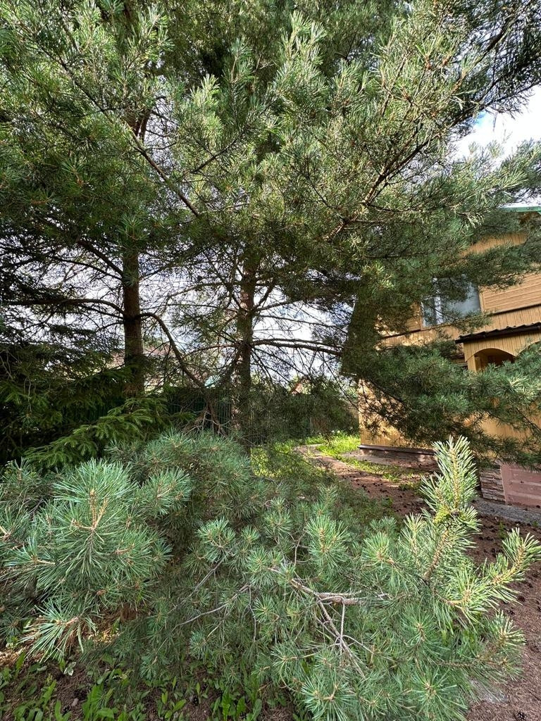 На участке растут огромные березы, сосны и ель.