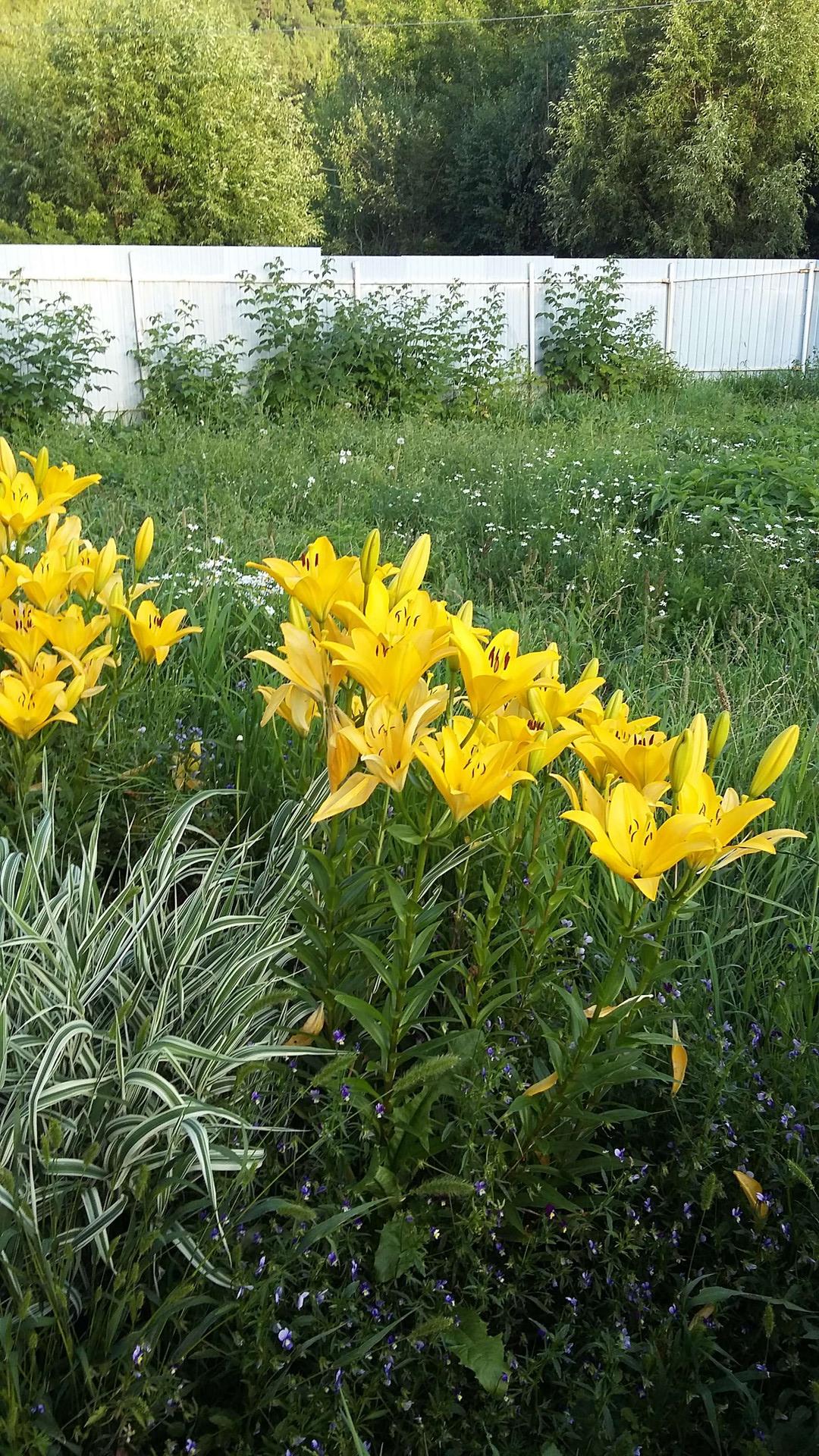 На участке смородина, вишня, малина, клубника, сирень, ель