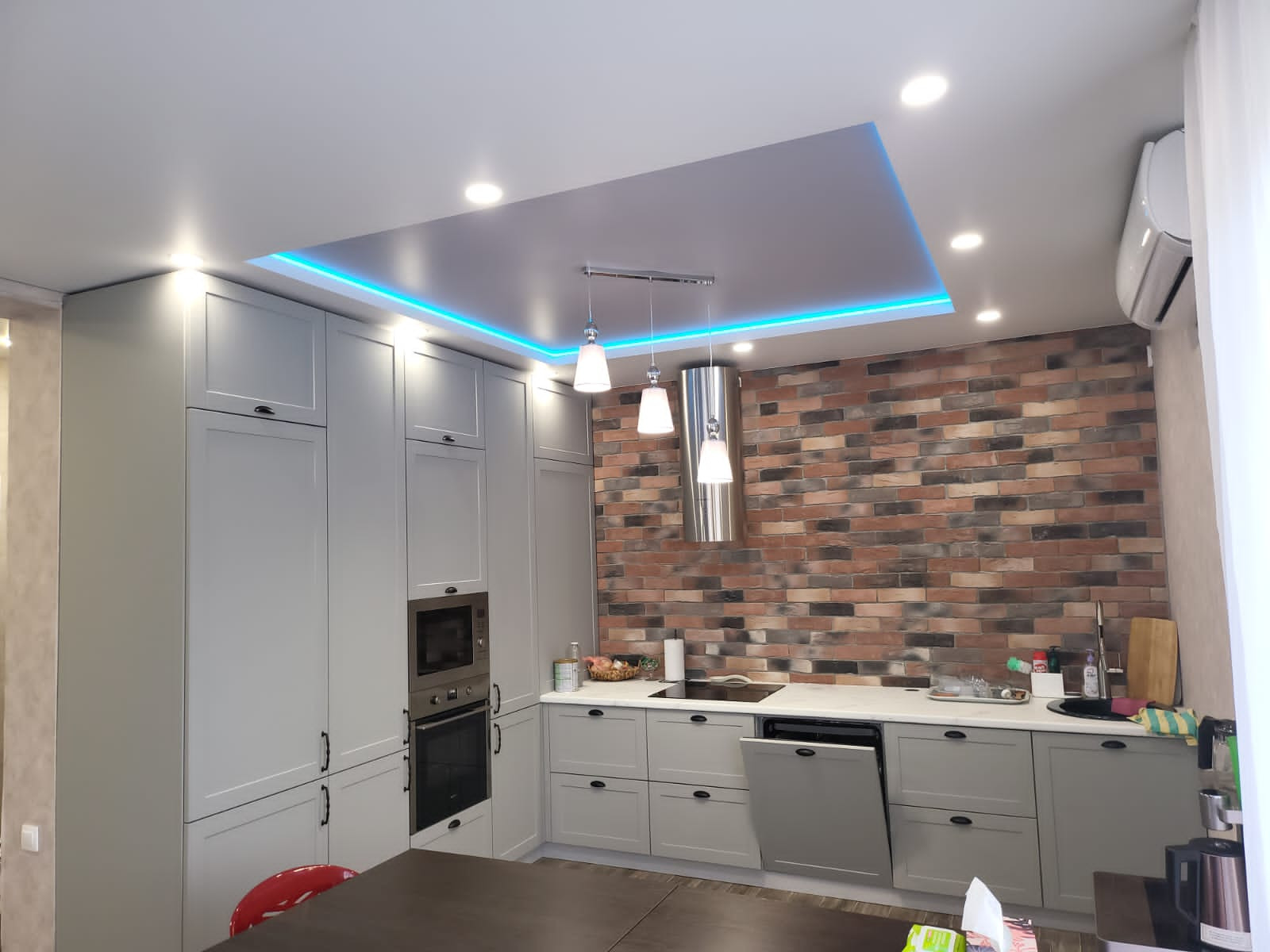 Качественный кухонный гарнитур, со встроенной бытовой техникой - индукционная плита, встроенный духовой шкаф, микроволновая печь, посудомоечная машина, холодильник и вытяжка.