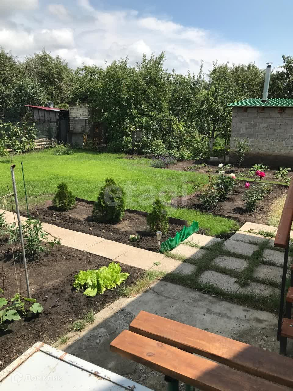 На 4.5 сотках благоустроенного участка земли плодоносящий молодой сад, кустарники, виноград, клубника, туи, розы. Имеется не достроенная кирпичная баня с печкой.
