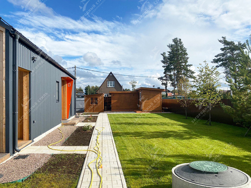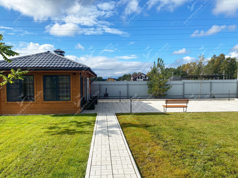 Новый современный одноэтажный дом на шикарном, полностью благоустроенном участке с баней и теплой зимней беседкой.