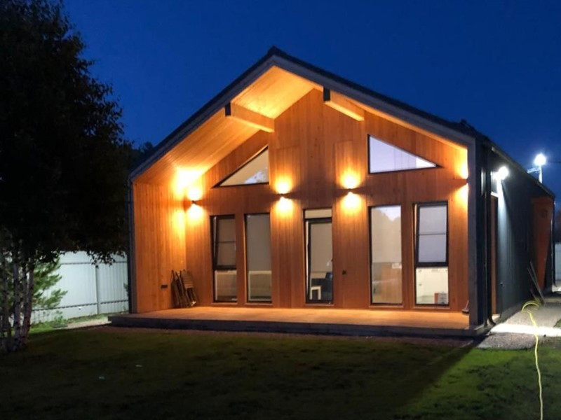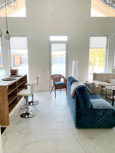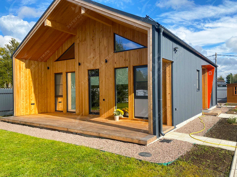 Площадь дома – 101 кв.м. Фундамент – утепленная шведская плита. Материал стен – заводской каркас (СИП-панели, из древесины камерной сушки). Панорамное остекление.