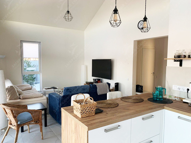 Полностью выполнена внутренняя отделка в светлом скандинавском дизайне. Дом полностью меблирован, в том числе установлена дорогая и качественная кухня «Мария» с бытовой техникой.