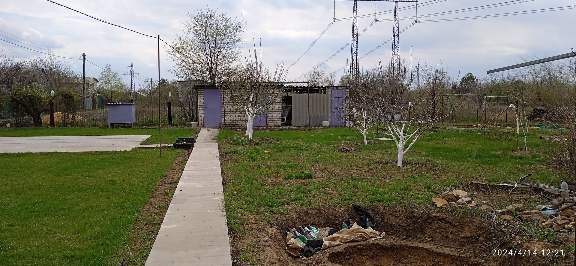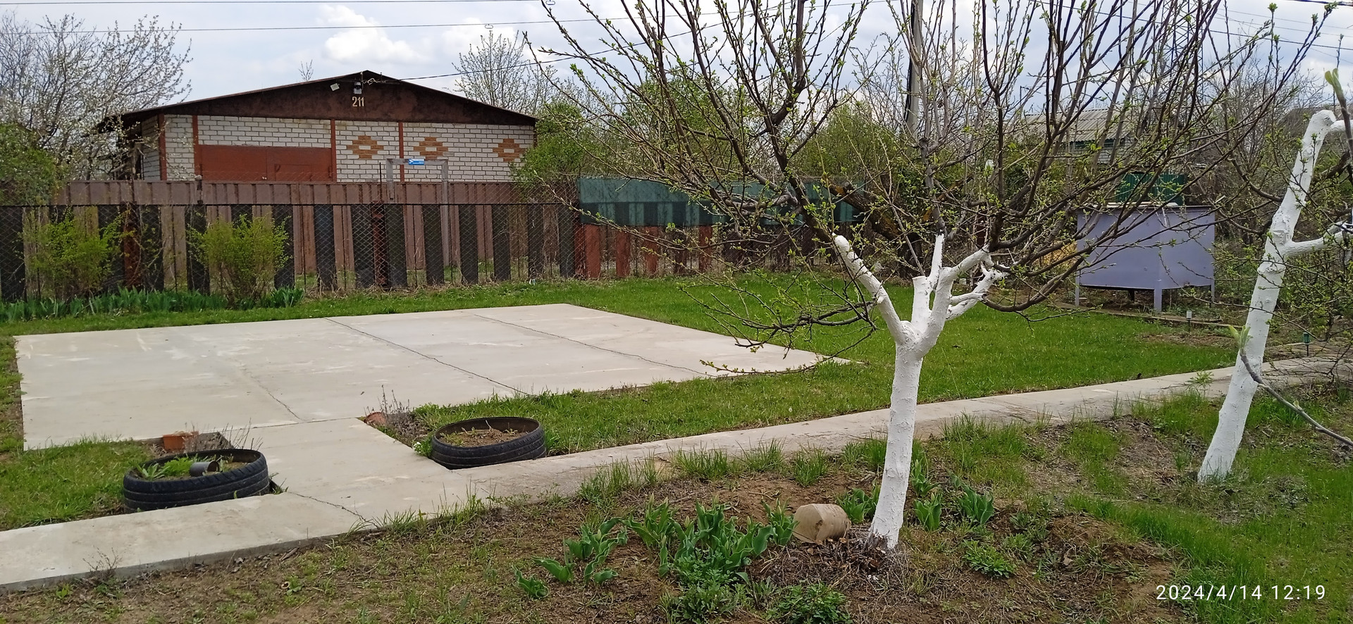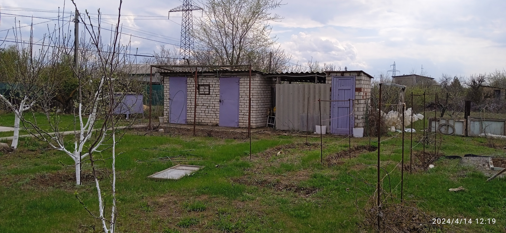 Есть бетонная площадка под каркасный бассейн (6м х 6м), кирпичные хозблок, туалет и душ, выкопана яма под небольшой пруд. Имеются понемногу: молодые плодовые деревья, малина, виноград, клубника, цветы.