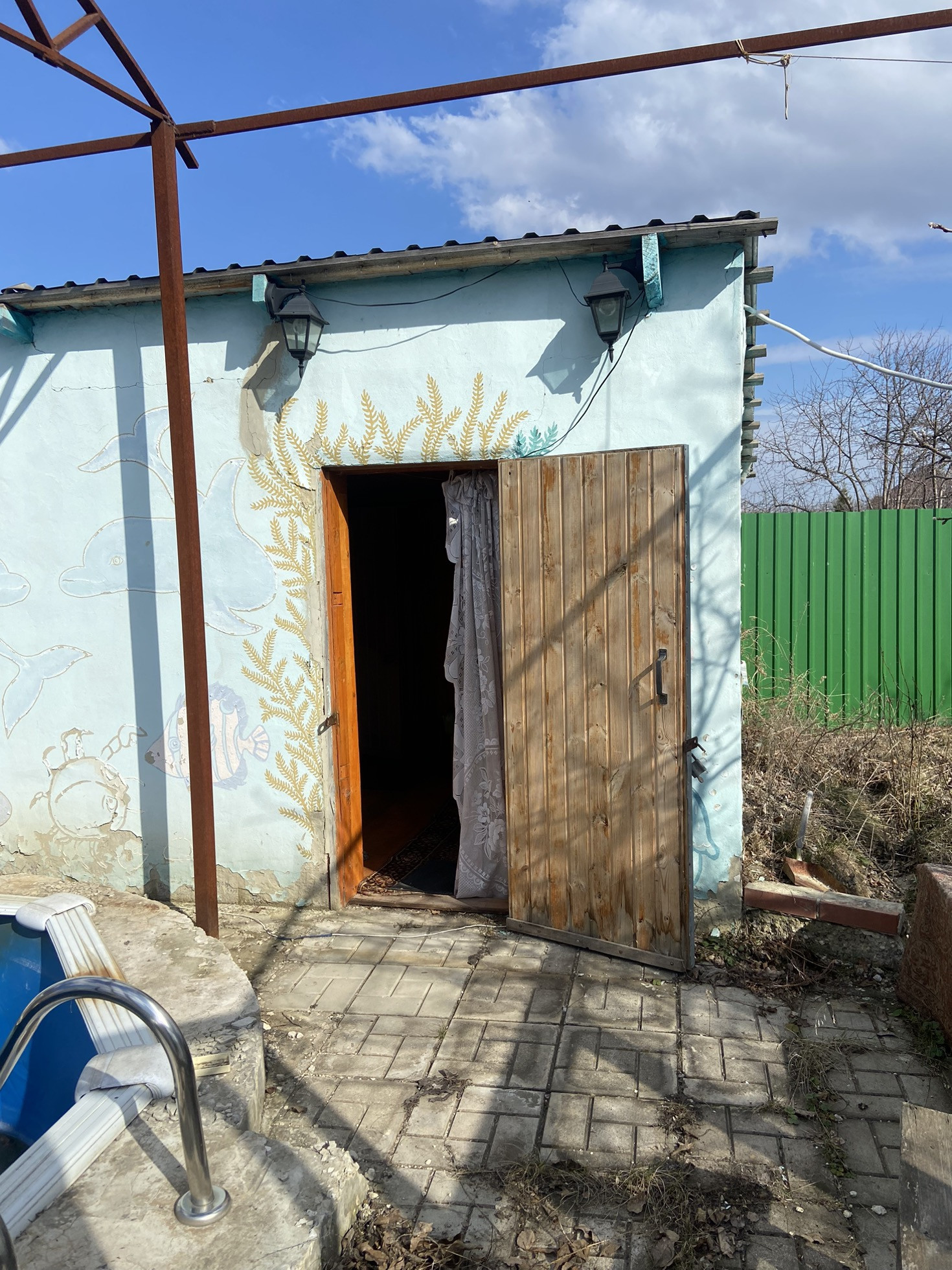 дверь сетка. На участке баня на дровах с добротной современной печью - камином бассейн, с современной системой фильтрации, в бане душ, комната отдыха с кожаным диваном еще один домик 2 этажа ( можно сделать летнюю кухню или гостевой домик, навес для 2х машин, дровник. Электричество круглый год, возможность провести газ. По периметру участка глухой забор, разводка труб для полива, емкости для воды, въездные ворота с калиткой .