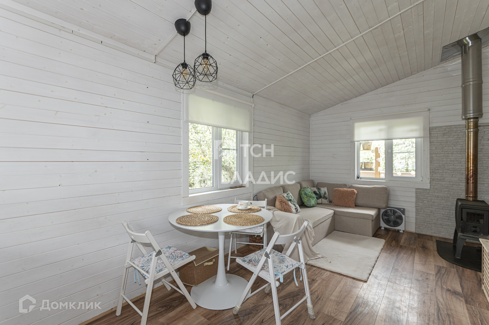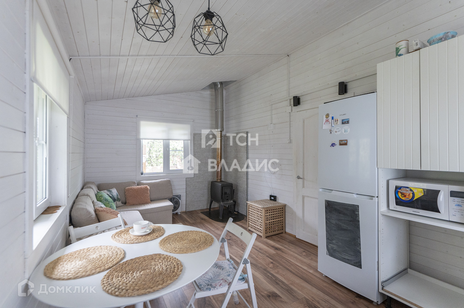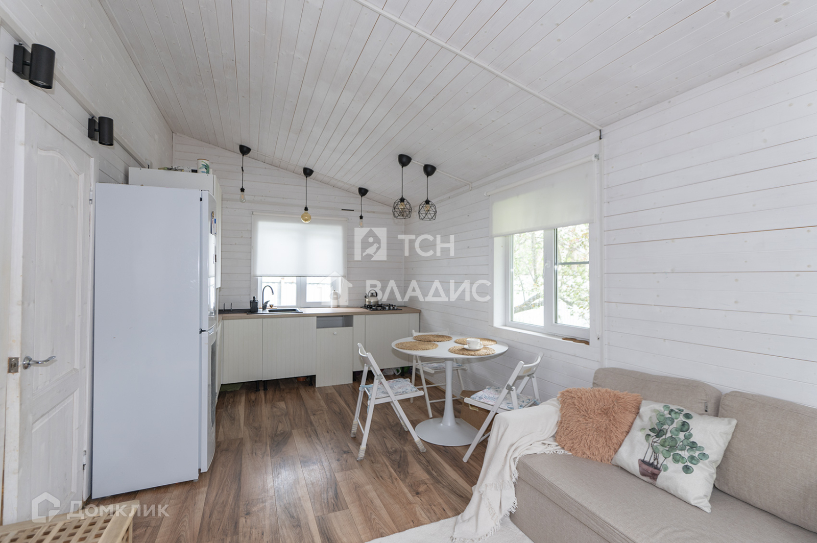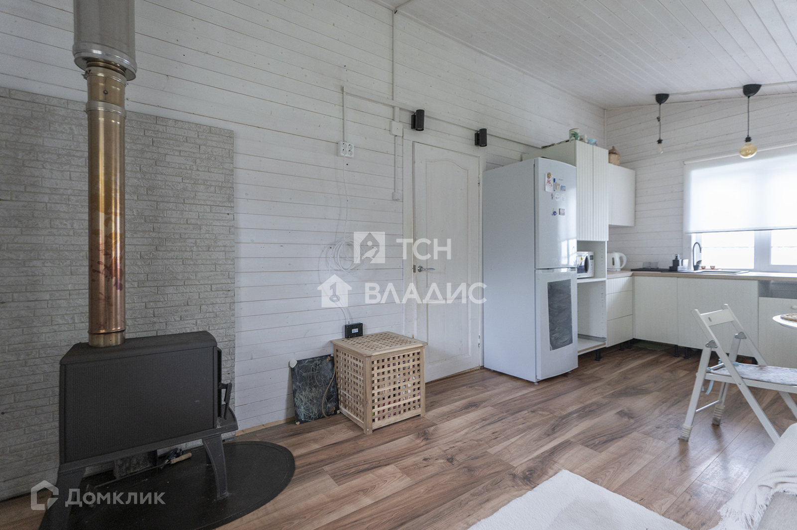 1-й дом; кухня-гостиная с печкой (17,1 метров), санузел совмещенный, со встроенной техникой, холл с тамбуром (5,25 метров).