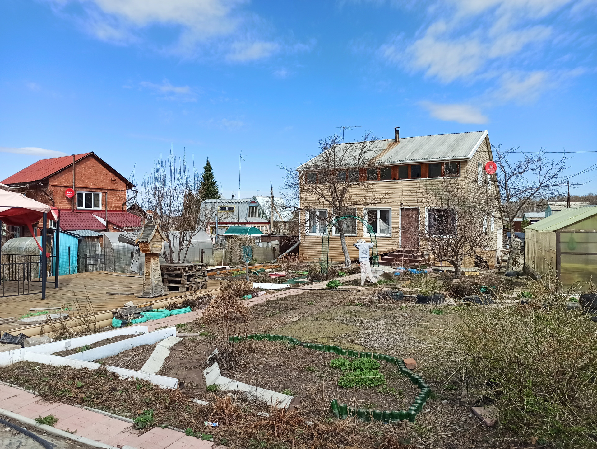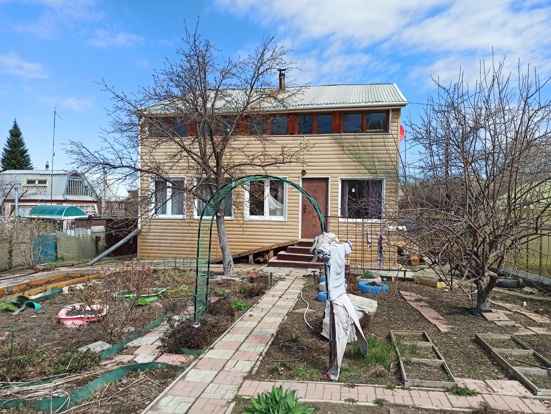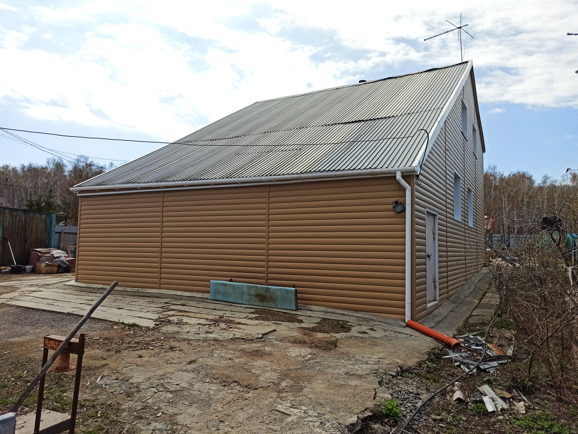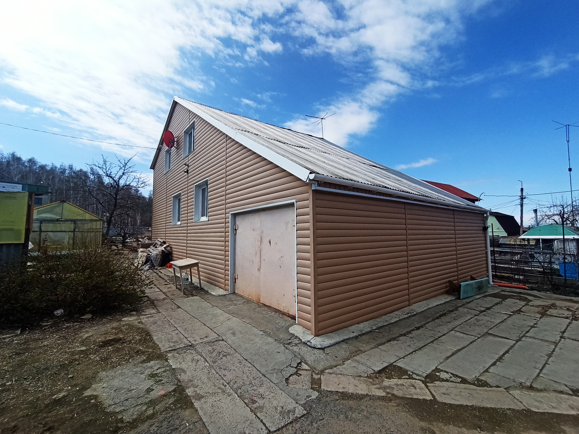 Материал стен – бревно, обшито сайдингом, площадь 130 кв.м., 2 этажа: